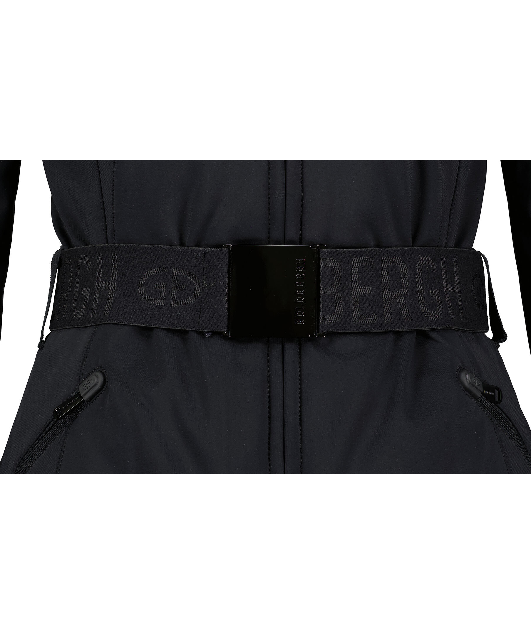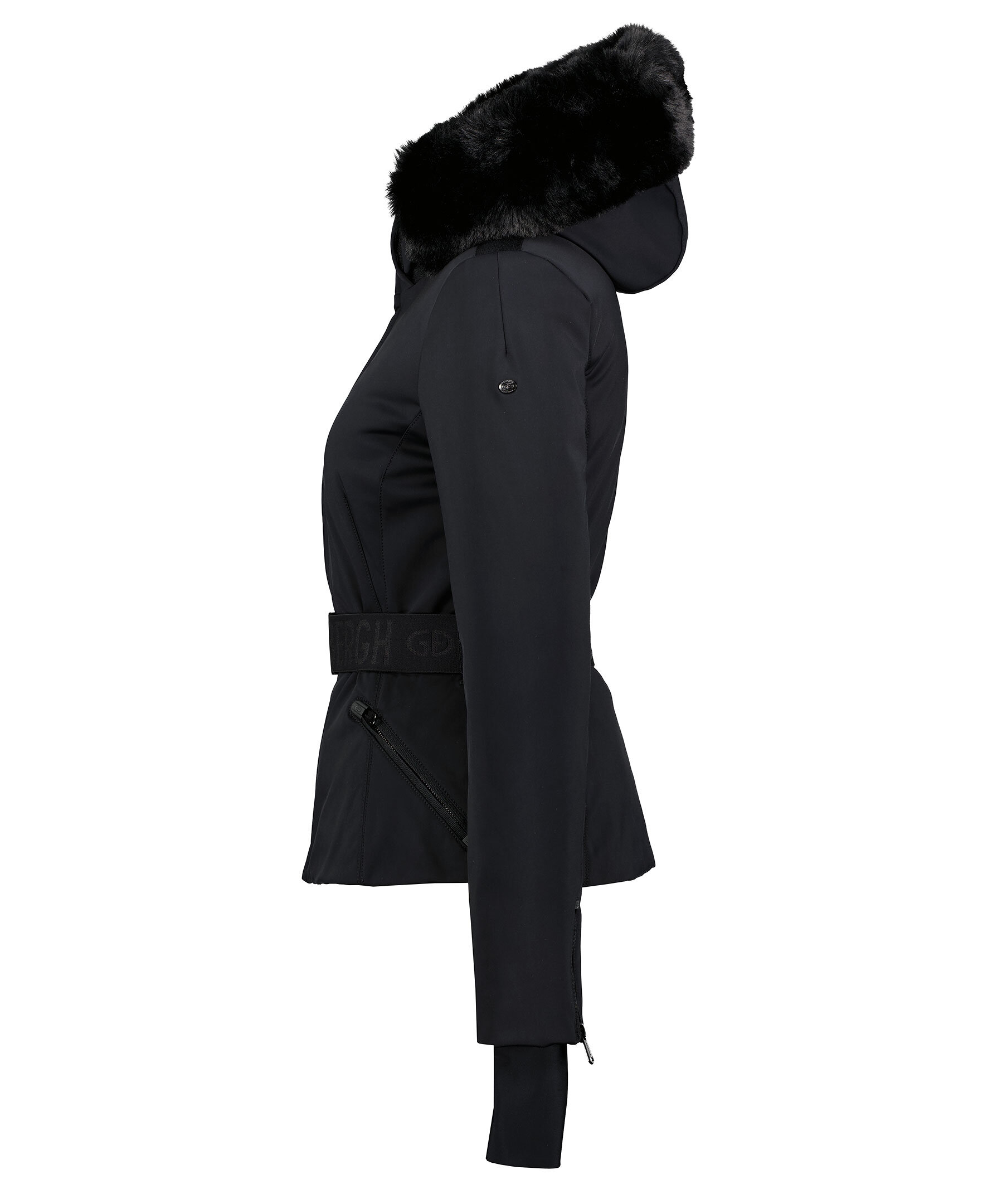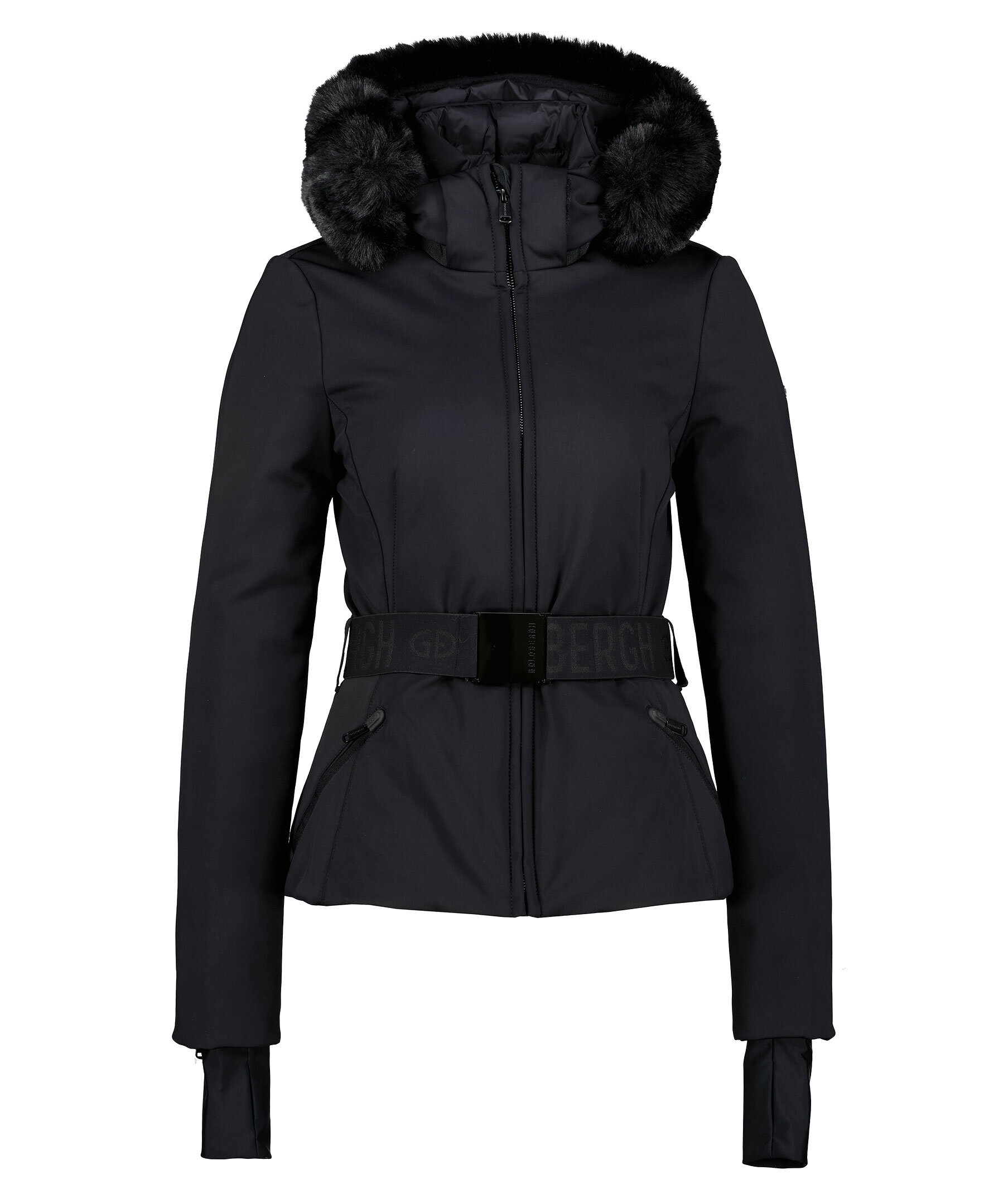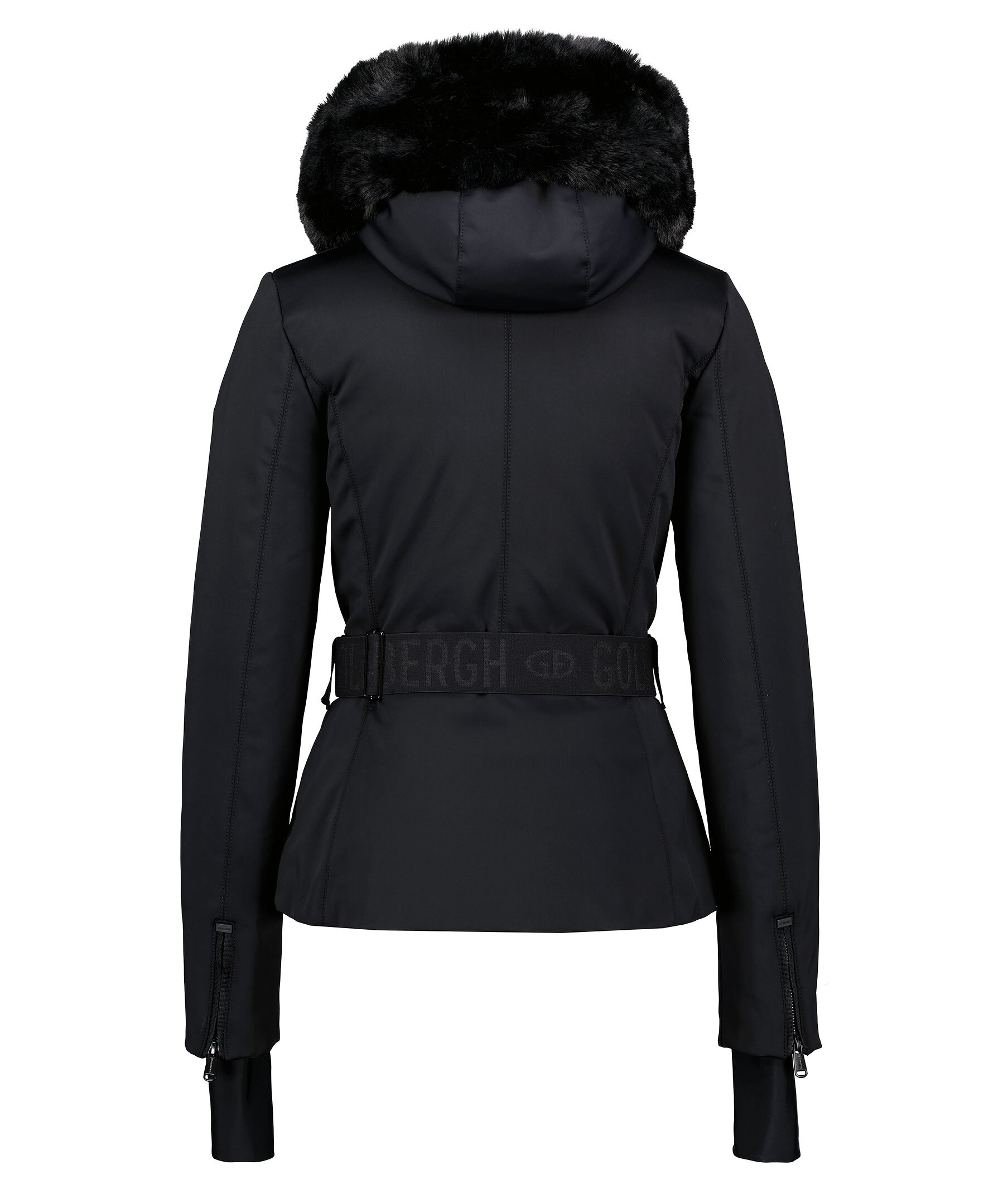 Svart jacka från Goldbergh. Luva med avtagbar pälskrage i svart konstpäls. Stängs framtill med dragkedja. Två fickor framtill som stängs med dragkedja. Elastiskt bälte med embossad logotyp och spänne i metall. Tillkommer guldfärgat bälte. Elastiska muddar vid ärmslut med hål för tummen. Jackan har en figurnära passform. Logotyp i metall på vänster ärm. Snölås vid midjan.
