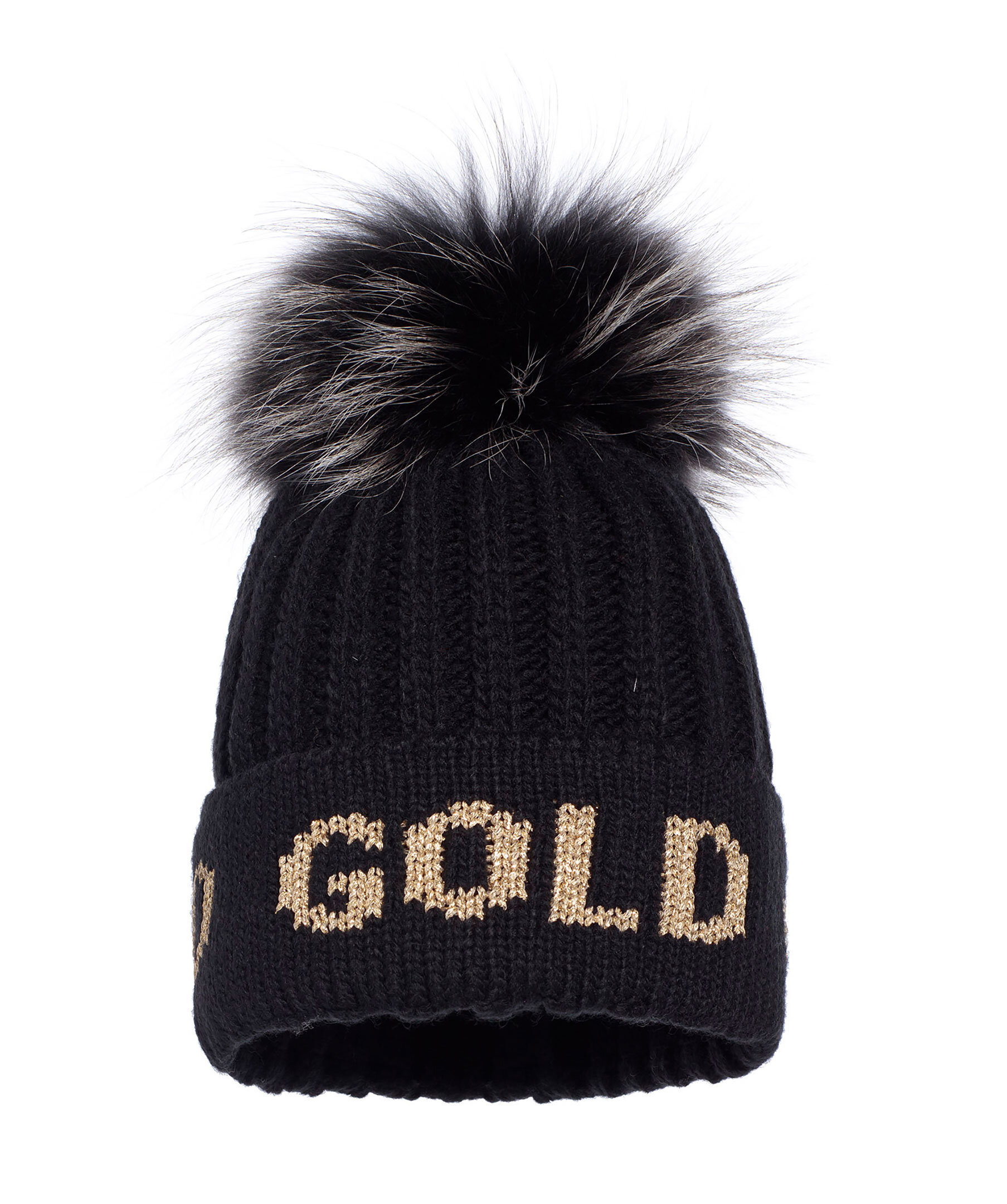 Svart ribbstickad mössa från Goldbergh med svart pompon boll. Uppvikt kant med ordet "GOLD" i en guldig färg. Mjukt polarfleeceband på insidan för extra komfort och värme. Vävd märkesetikett vid sömmen bak. Fuskpäls pompong på kronan. Tillverkad av en ullblandning.