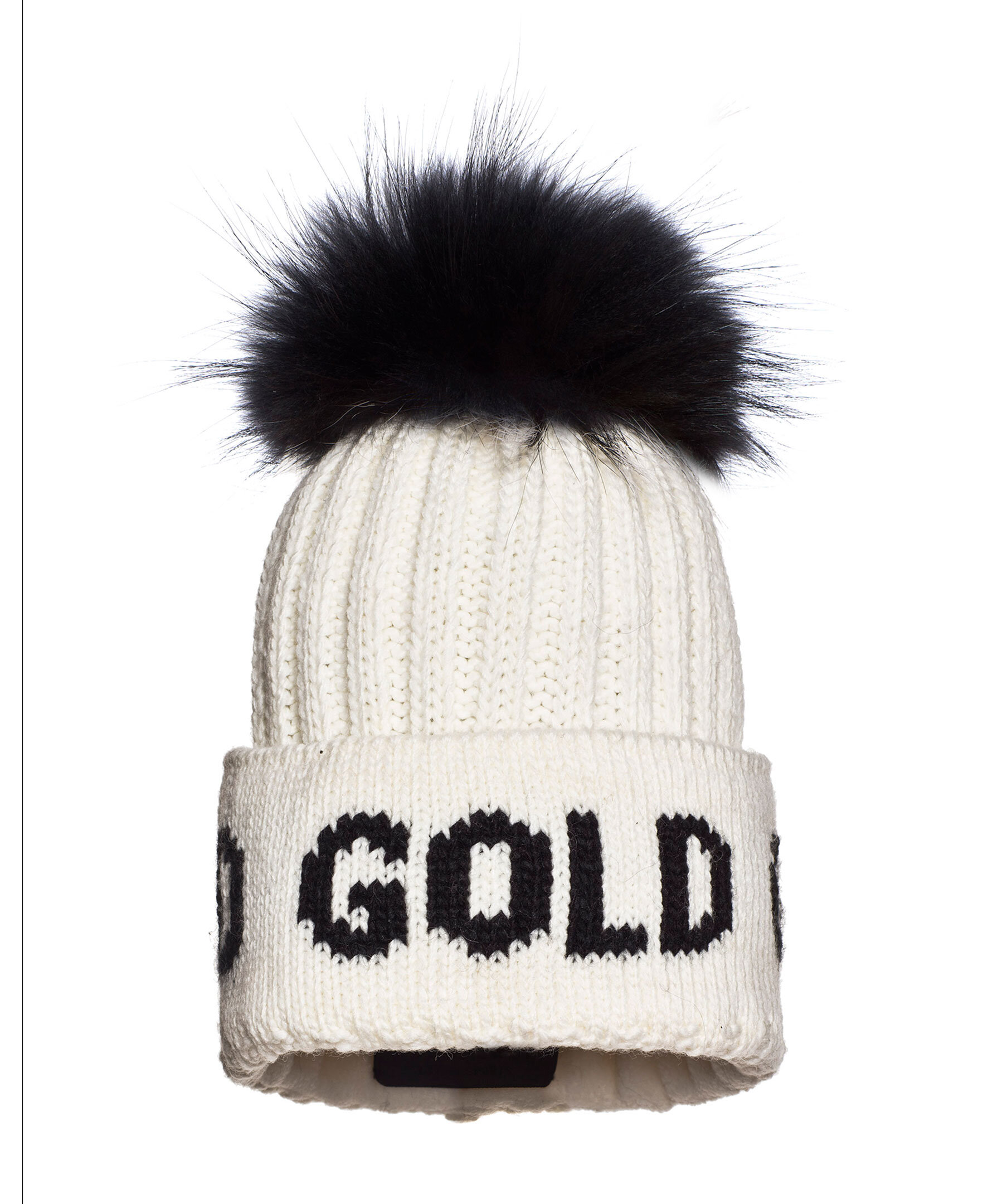 Vit ribbstickad mössa från Goldbergh med svart pompon boll. Uppvikt kant med ordet "GOLD" i svart. Mjukt polarfleeceband på insidan för extra komfort och värme. Vävd märkesetikett vid sömmen bak. Fuskpäls pompong på kronan. Tillverkad av en ullblandning.
