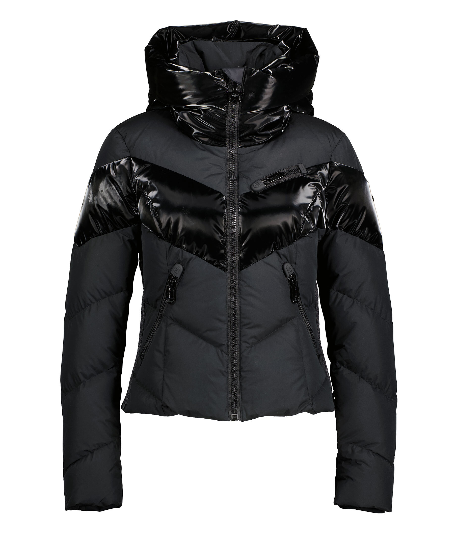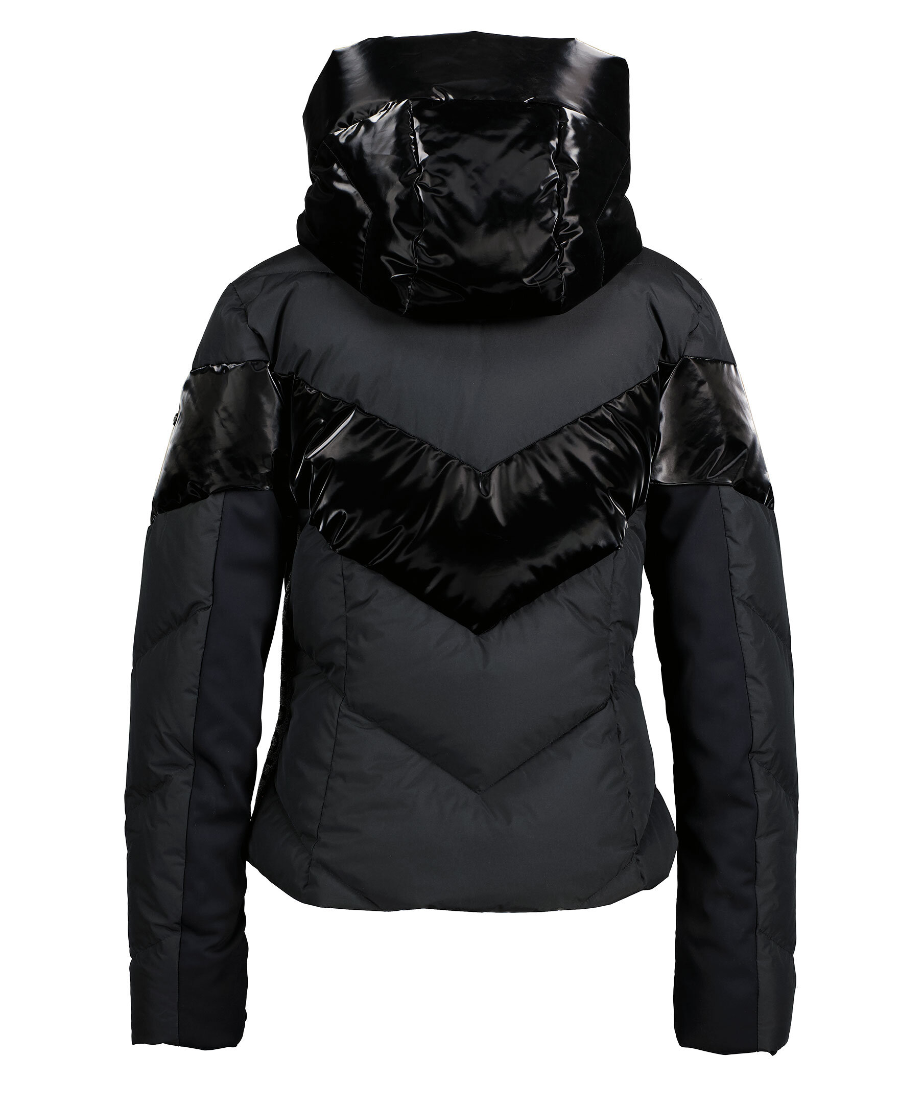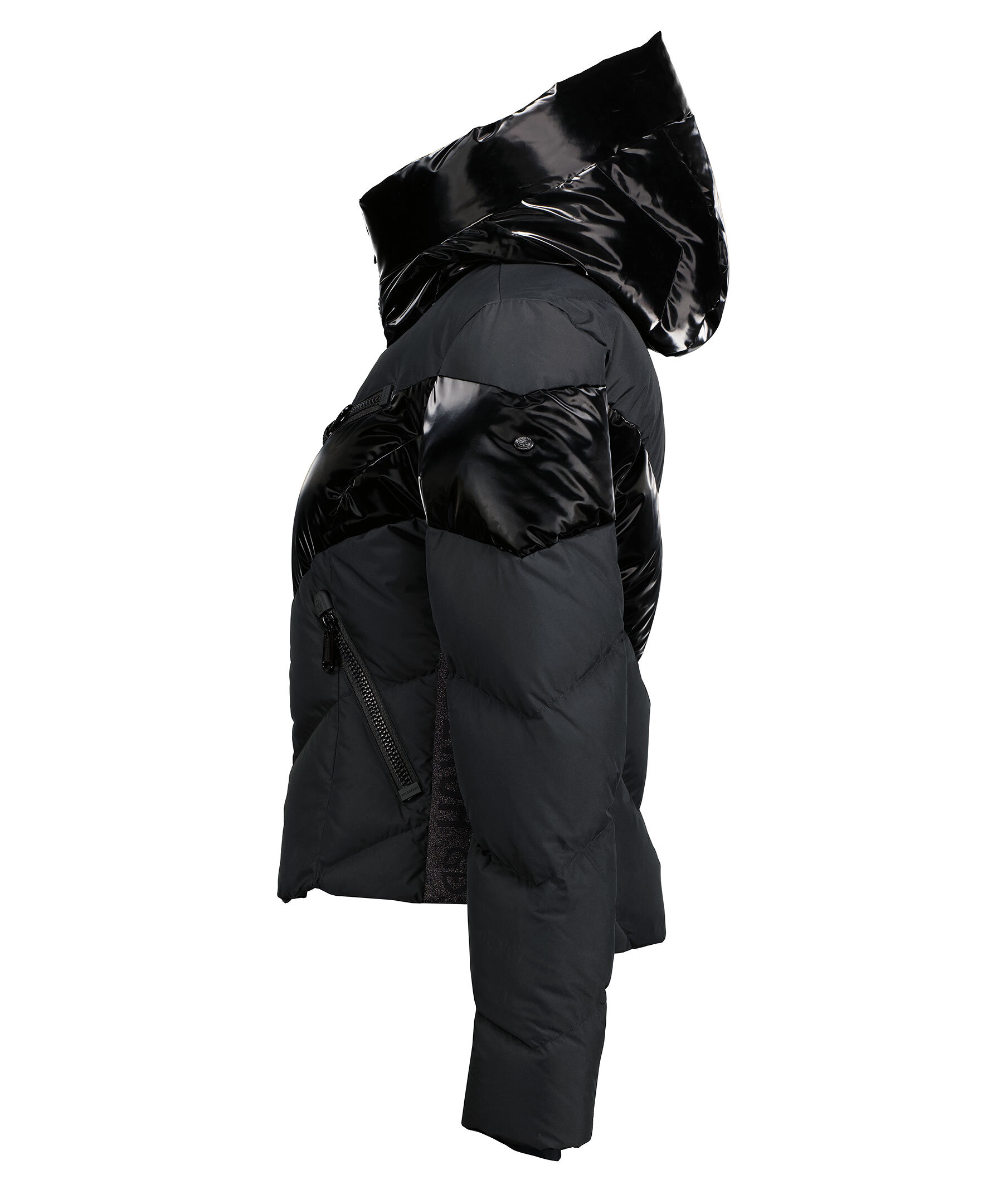 Svart quiltad dunjacka med huva och blanka delar från Goldbergh. Två sidfickor med dragkedja, två innerfickor och en bröstficka för liftkort. Avtagbart snölås. Tillverkad i polyester.