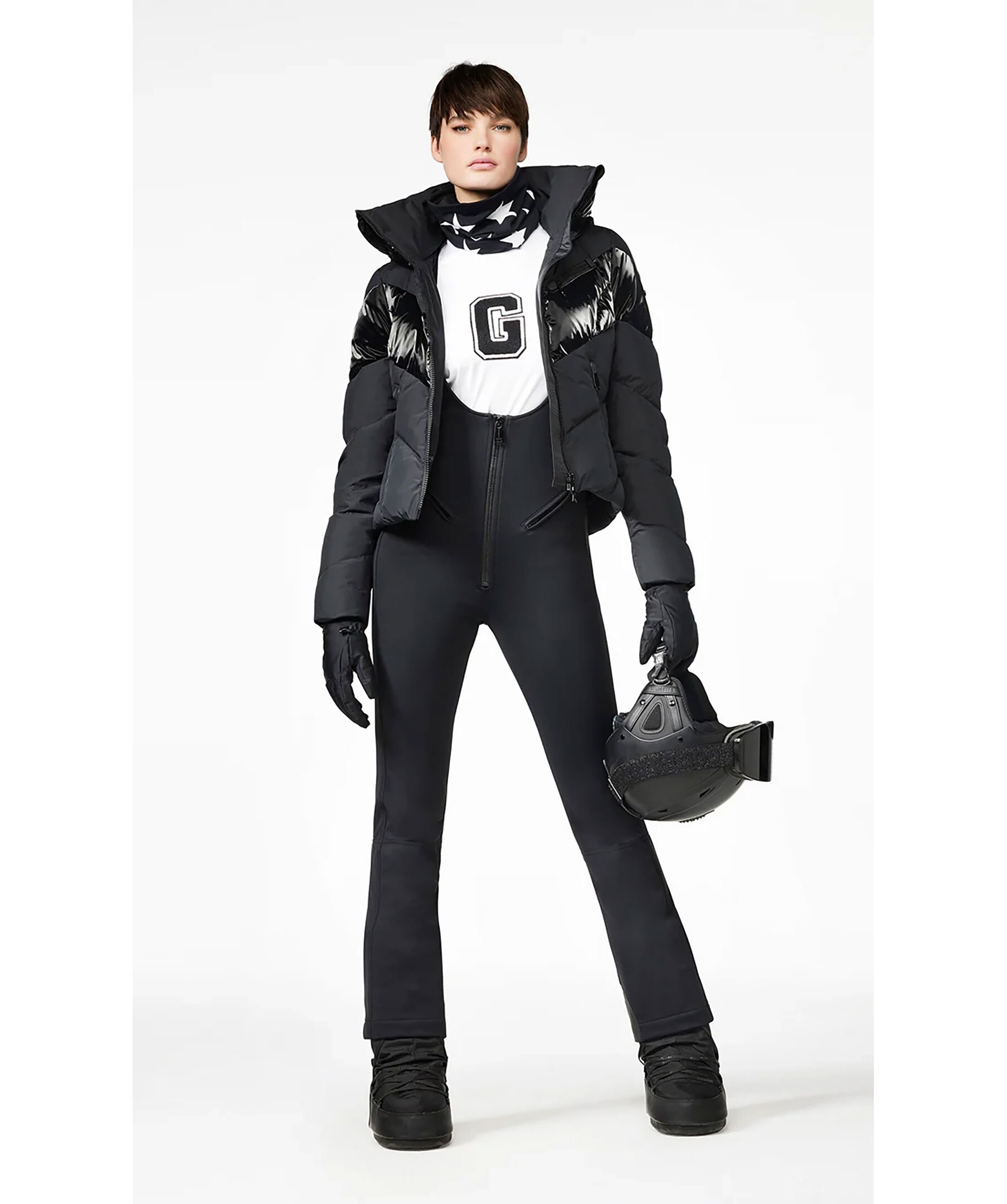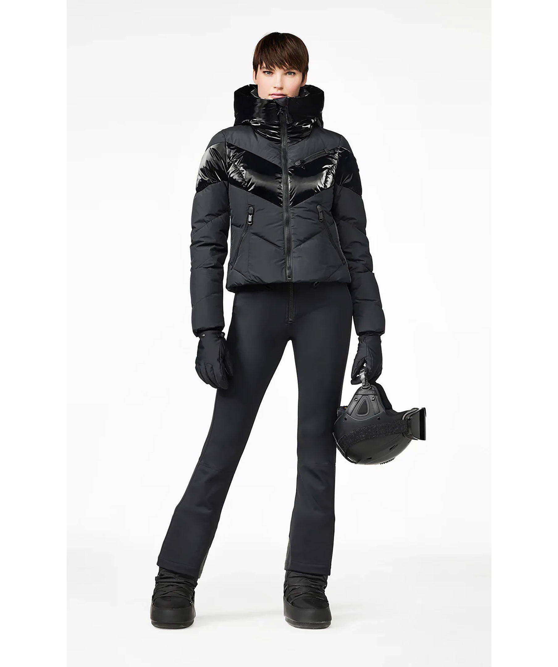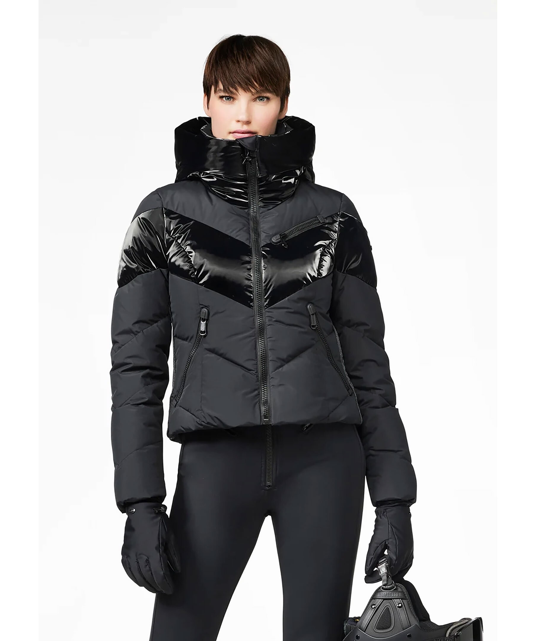 Svart quiltad dunjacka med huva och blanka delar från Goldbergh. Två sidfickor med dragkedja, två innerfickor och en bröstficka för liftkort. Avtagbart snölås. Tillverkad i polyester.