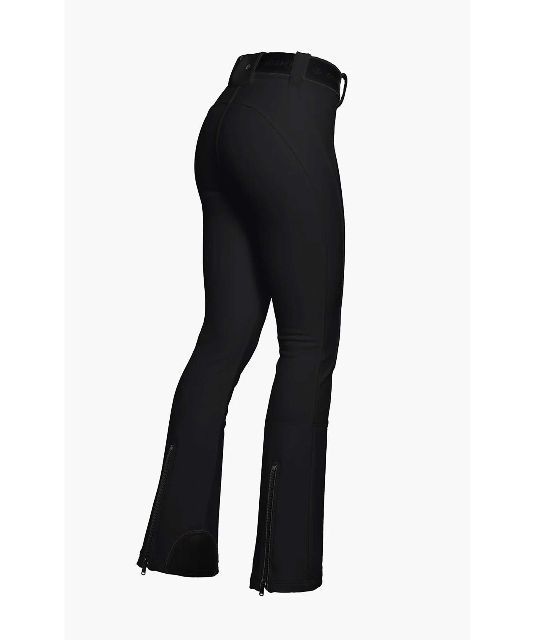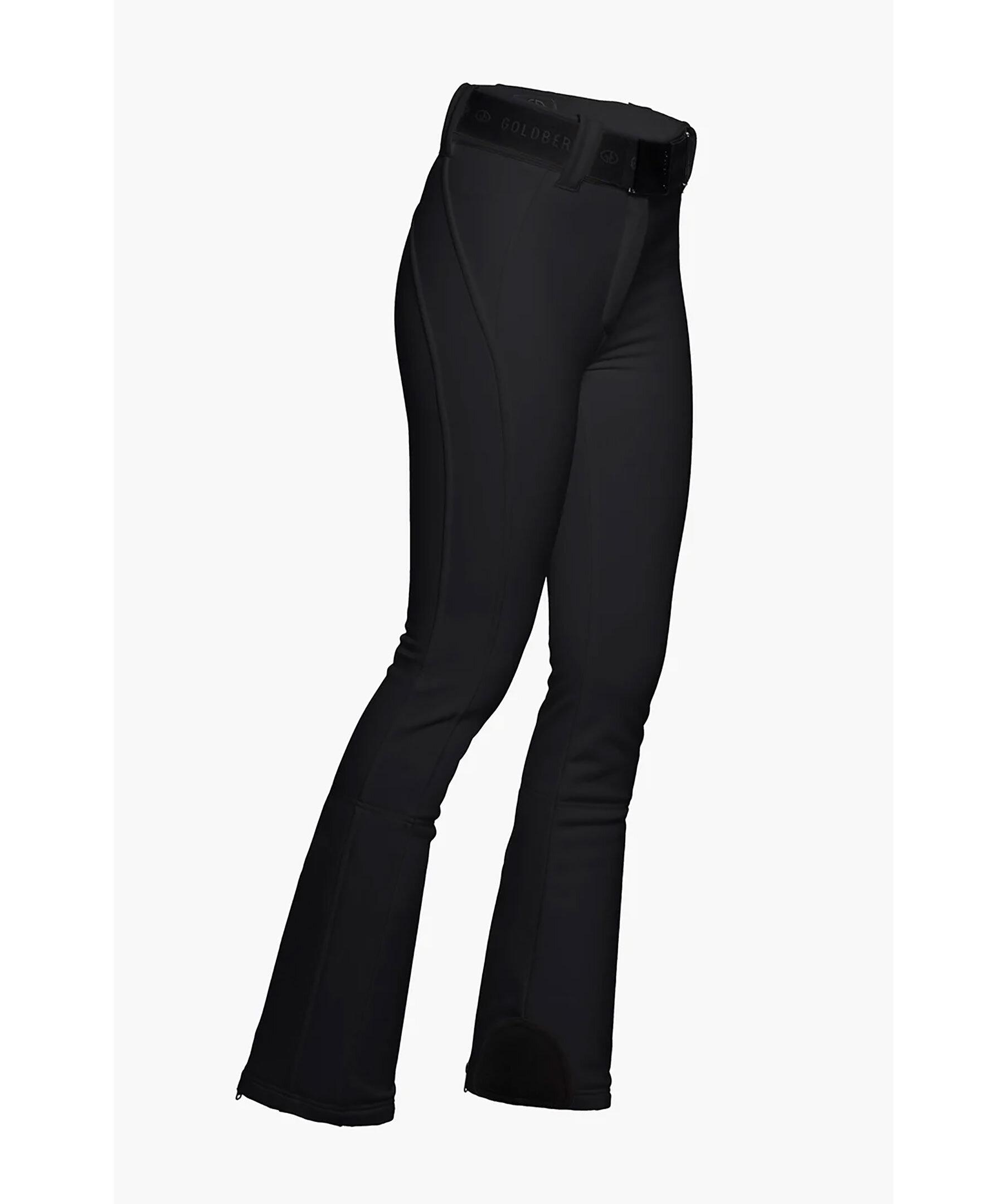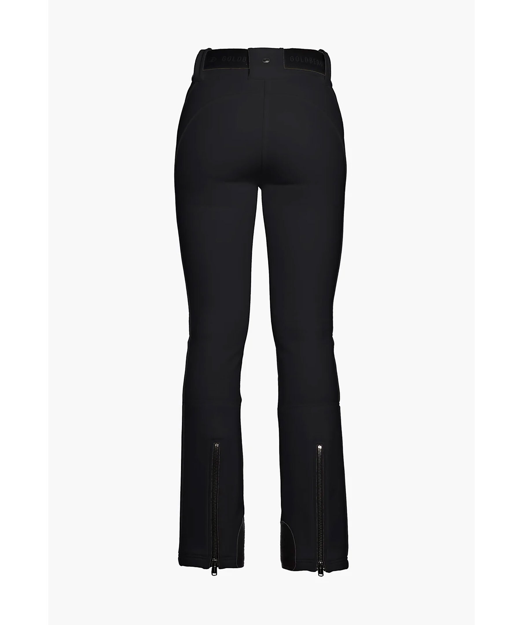 Svarta skidbyxor från Goldbergh. Avtagbart, justerbart elastiskt bälte i midjan. Slim fit passform. Byxorna är vindtäta och vatten avstötande. Tillverkade i tre lager softshell. Dragkedja på byxornas baksida vid benslut. Logotyp i metall baktill på byxorna.