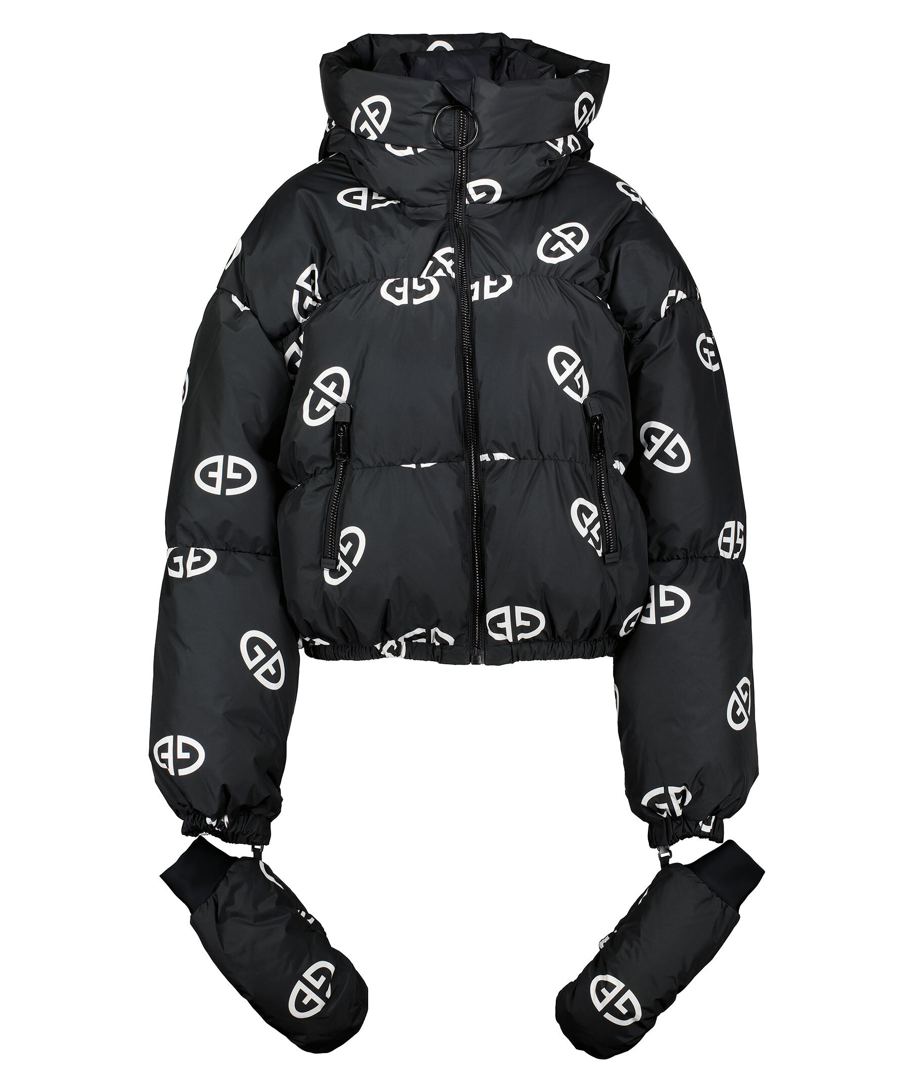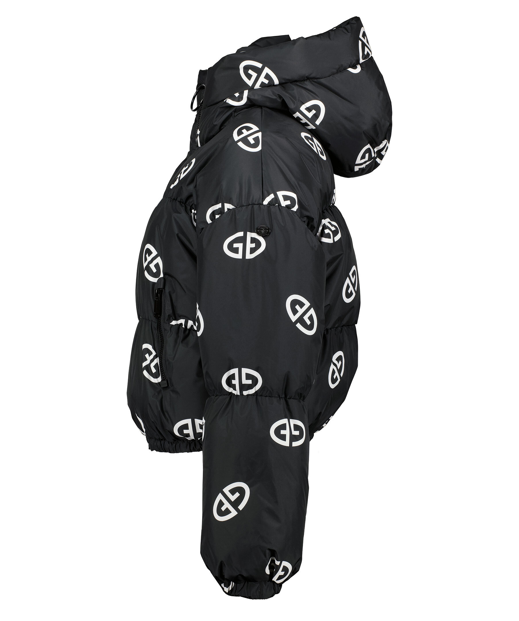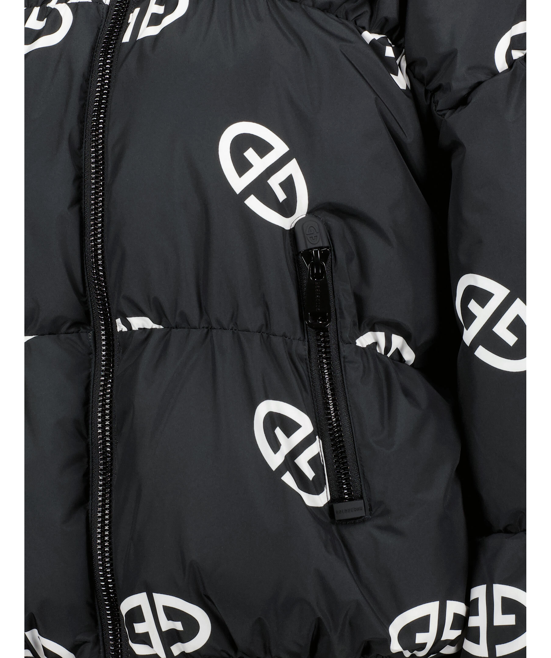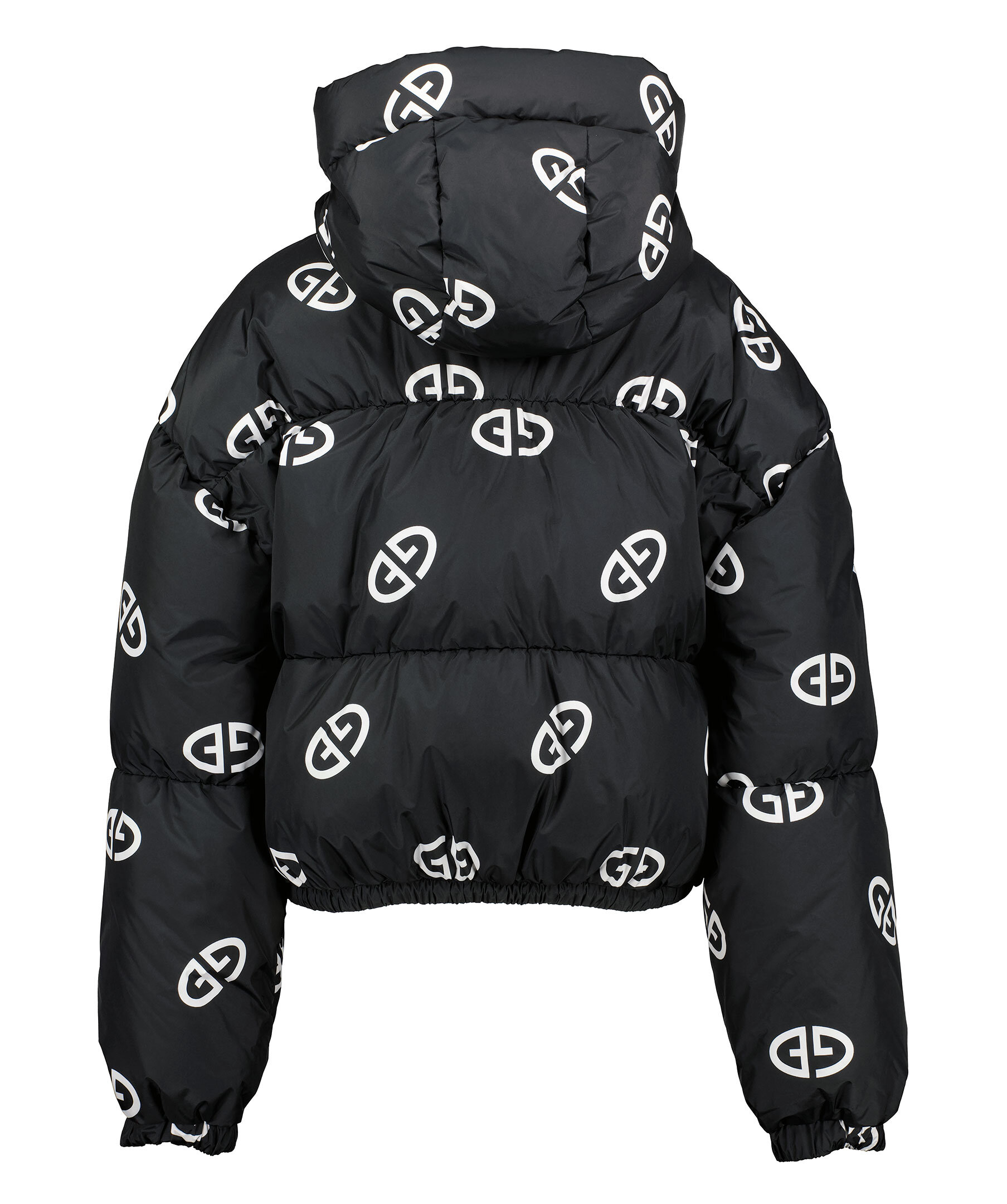 Svart och vit monogrammönstrad kort skidjacka från Goldbergh. Stängs med dragkedja. framtill. Luva med dragsko. Två fickor framtill som stängs med dragkedja. Innerficka som stängs med dragkedja. Medföljande vadderade vantar som kan knäppas fast vid ärmslut. Logotyp i metall på vänster ärm. Dragsko vid jackslut.