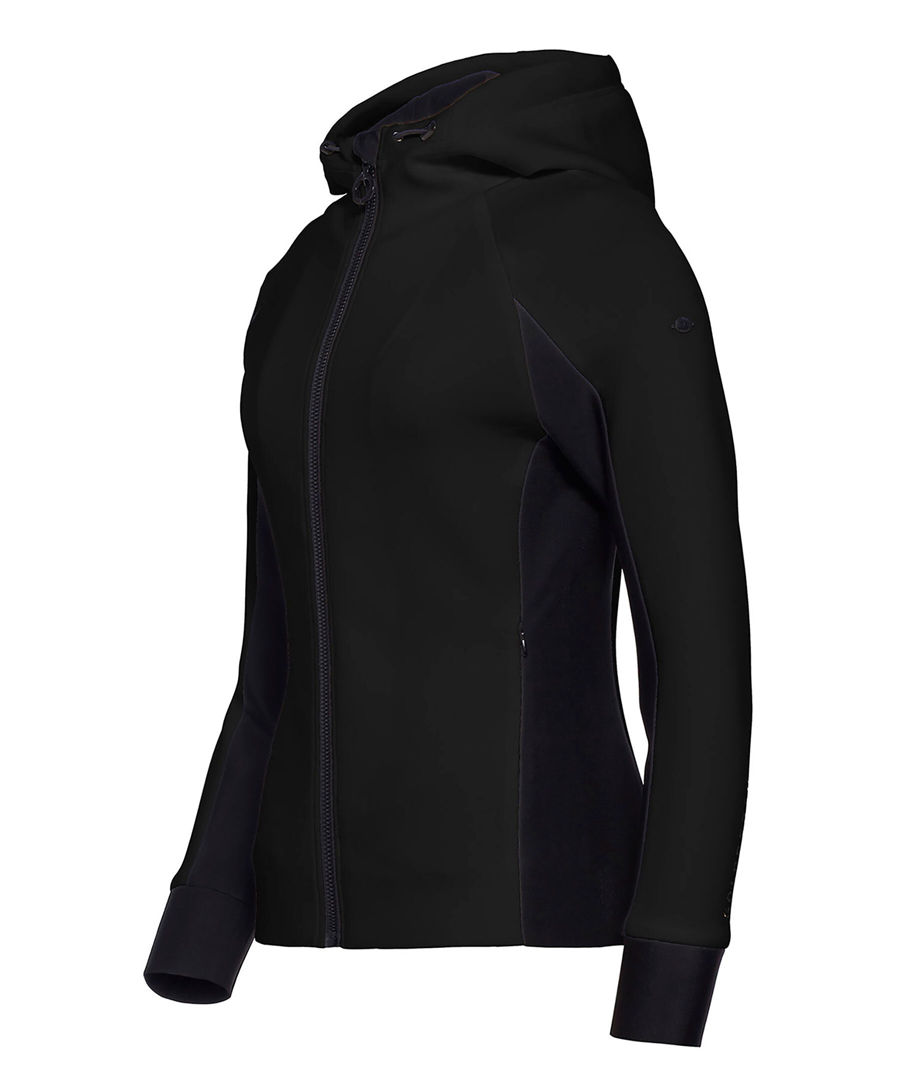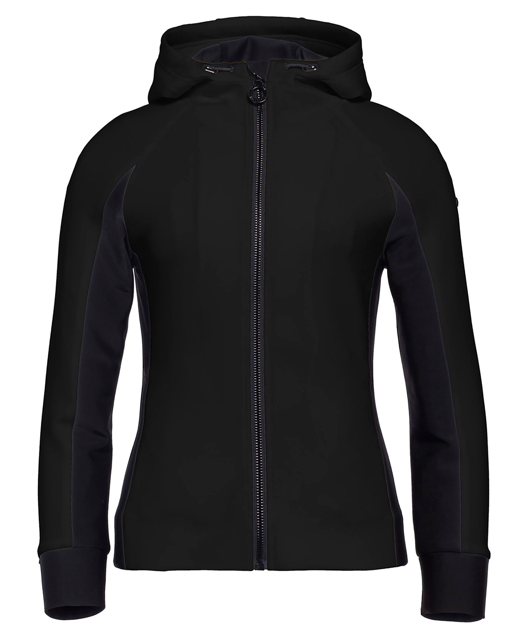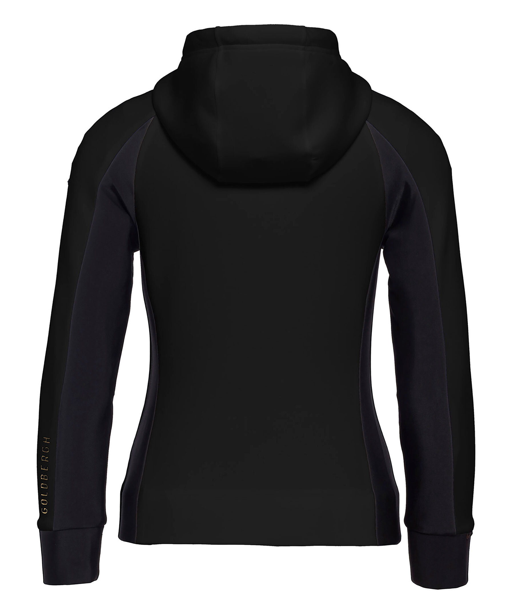 Svart funktions hoodie med figursydd passform och dragkedja fram från Goldbergh. Sidofickor som stängs med diskret dragkedja och hög krage med dragkedja ända upp. Liten svart logotyp upptill på vänster ärm och större, guldfärgad logotyp skriven längs underärmen på vänster ärm. Muddar i ärmslut samt elastisk dragsko i luva.