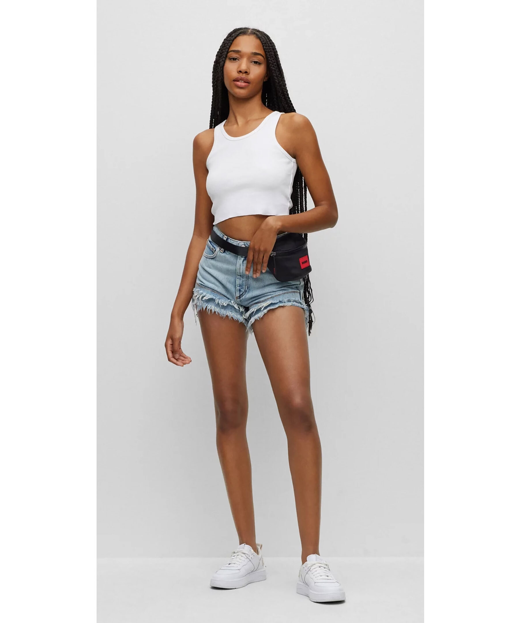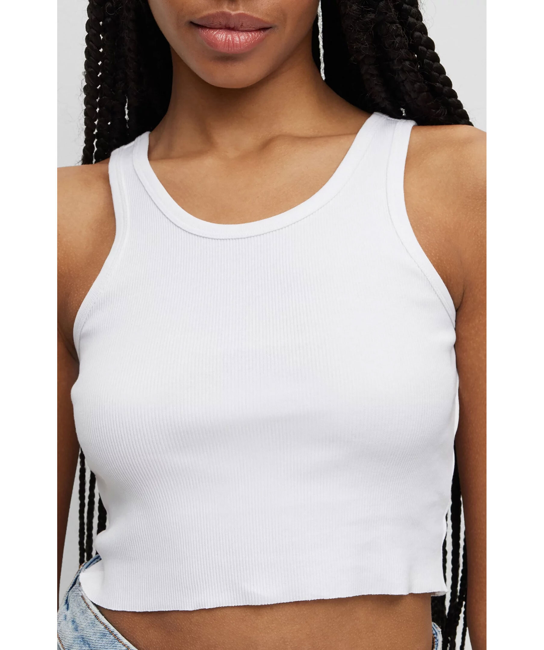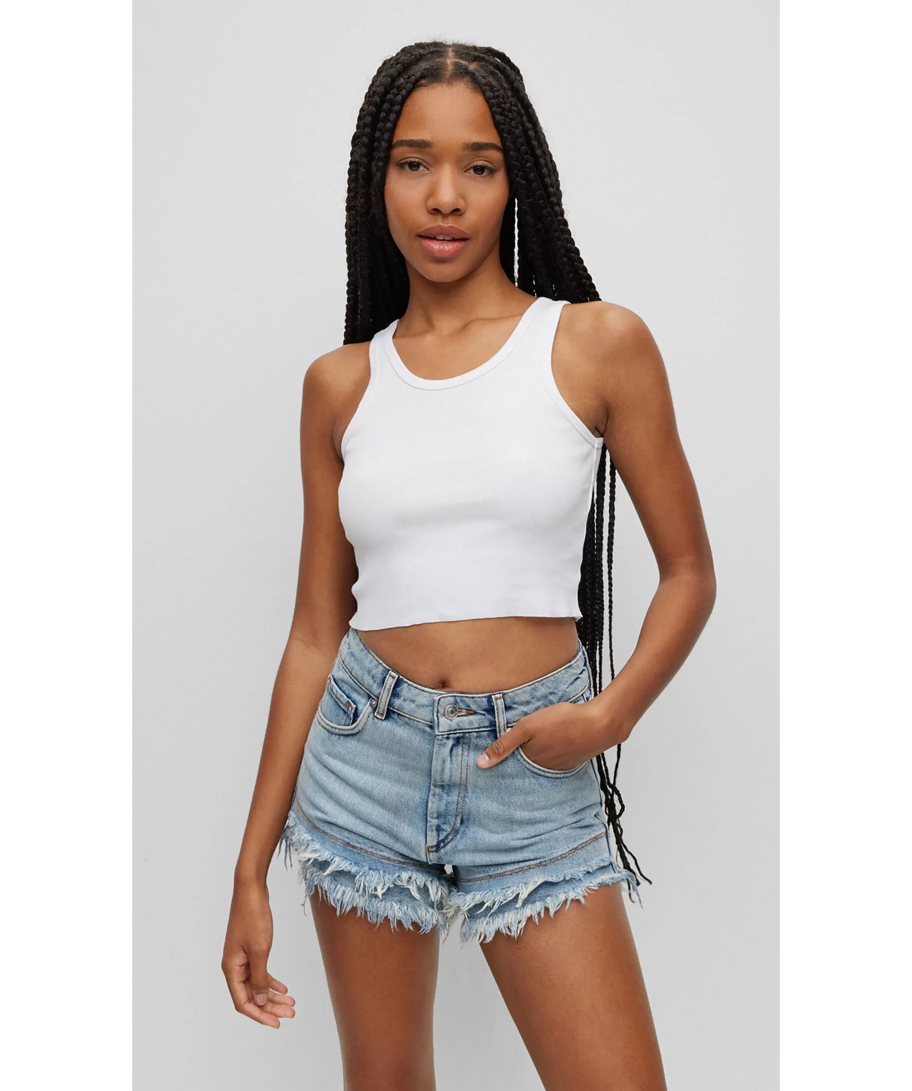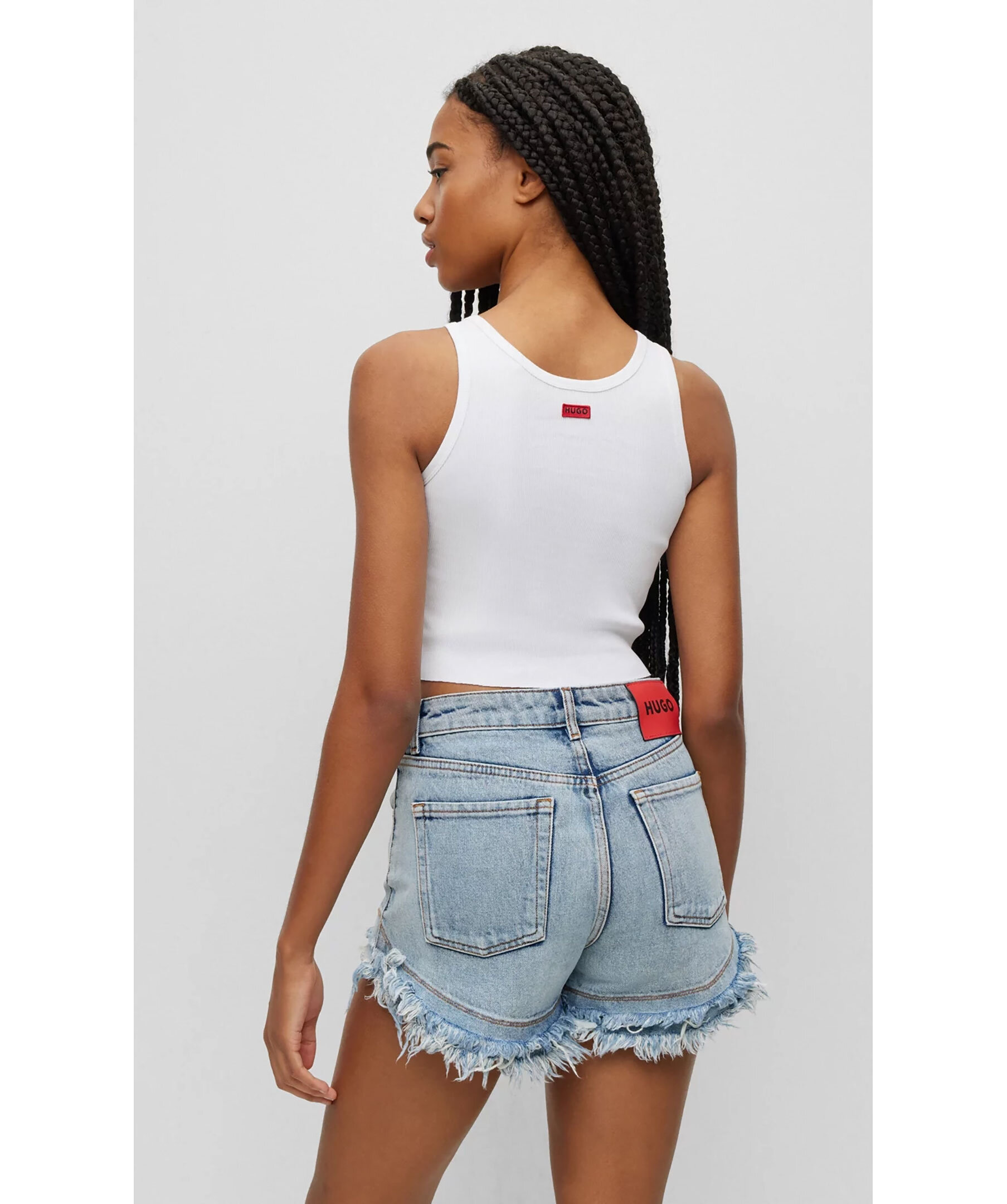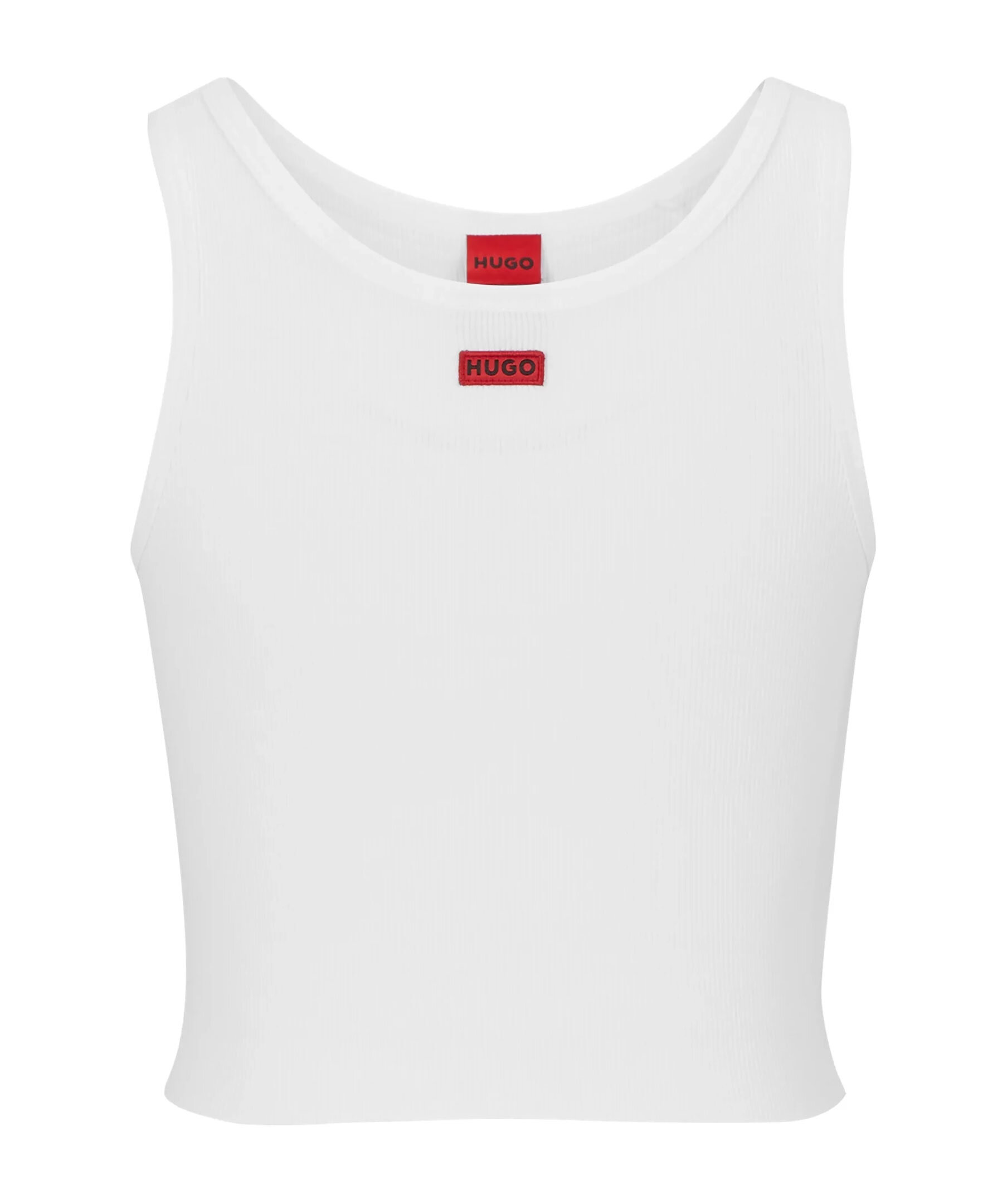 Vitt ribbat linne i cropad modell från HUGO. Rundad halsringning. Röd patch med logotyp baktill i nacken. Tillverkad i bomullsblandning.