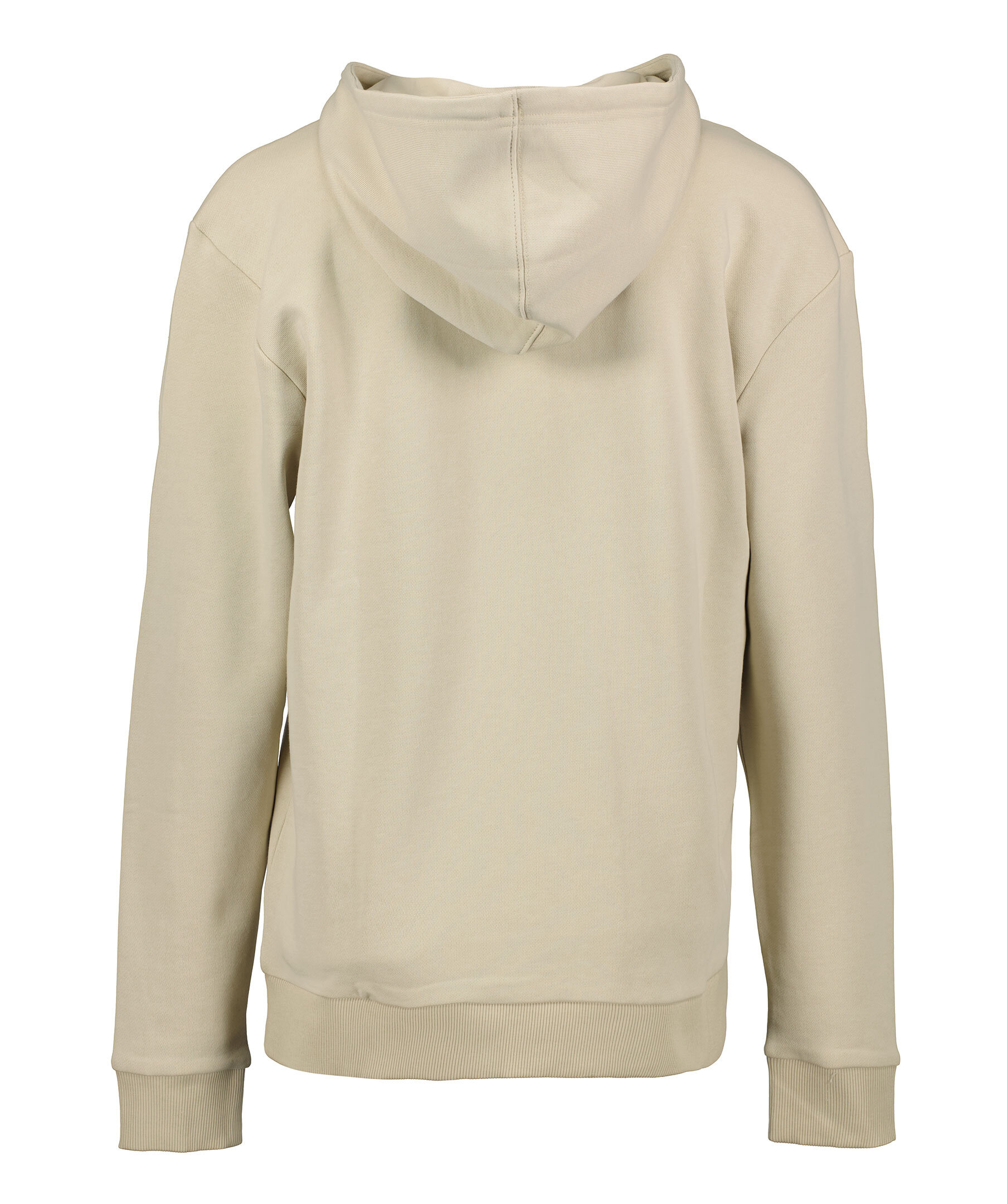 Beige hoodie från Hugo, Hugo Boss. Tillverkad i 100% bomull, har en liten röd patch med svart logotyp mitt på bröstet. Luva med snörning, ribbade muddar i ärmslut och i plaggslut samt ficka på magen.