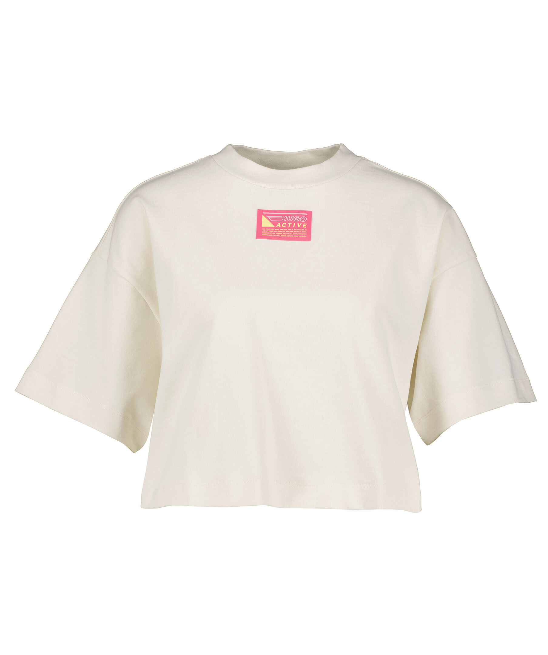 Benvit cropad T-shirt från HUGO Women. Rosa Gummerad logotyp på mitten av bröstet. Multifärgat tryck på ryggen. Tillverkad i Bomull.