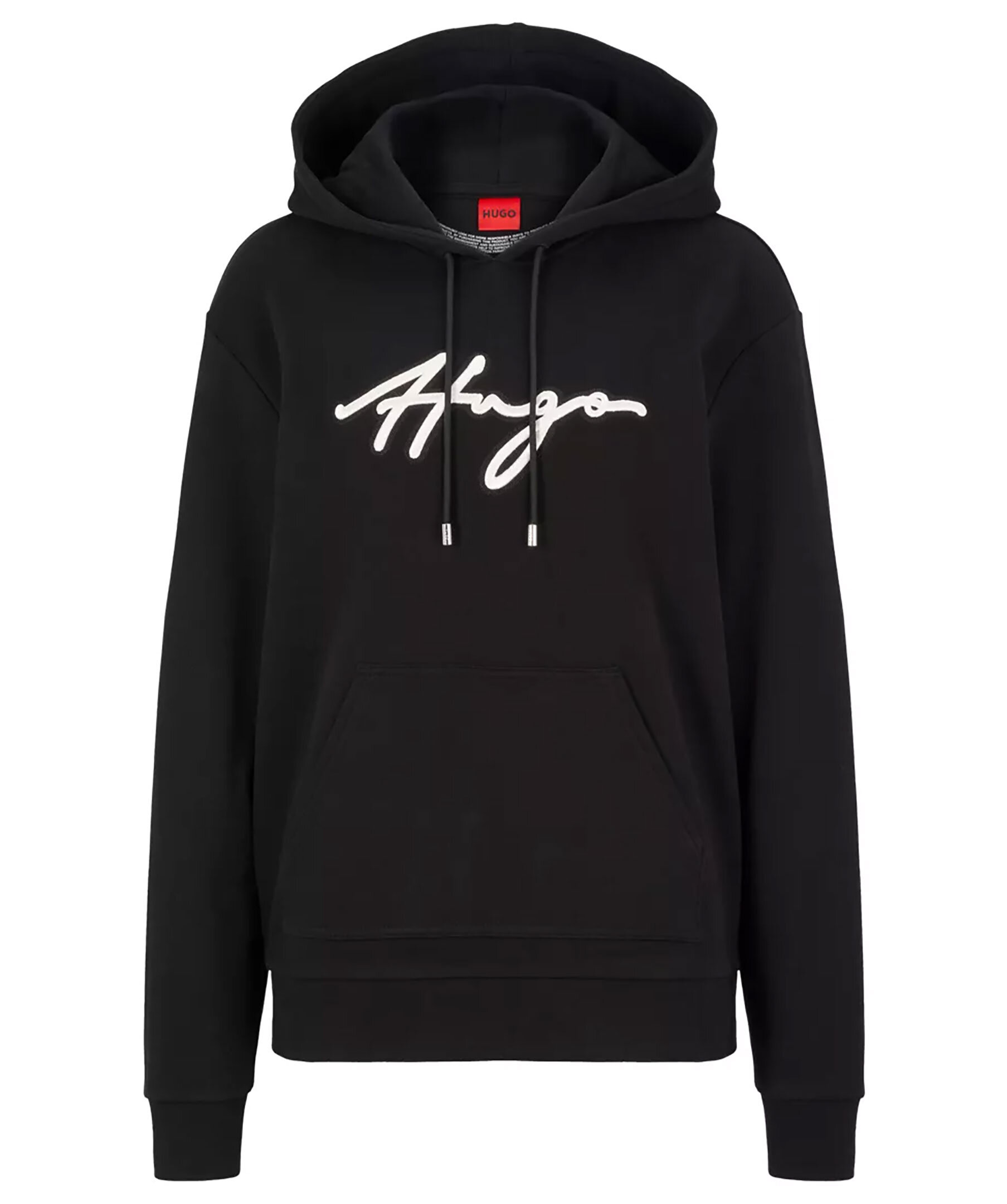 Svart hoodie från HUGO. Luva med svart snörning. Känguruficka på mage. Ribbstickade muddar i både plagg och ärmslut. Broderad HUGO logotyp på bröstet. Tillverkad i 100% bomull, även tillverkad i minst 60% hållbart material. Modellen är en storlek S och är 176 cm lång med en, 85 cm byst, 62 cm midja och 90 cm höft.