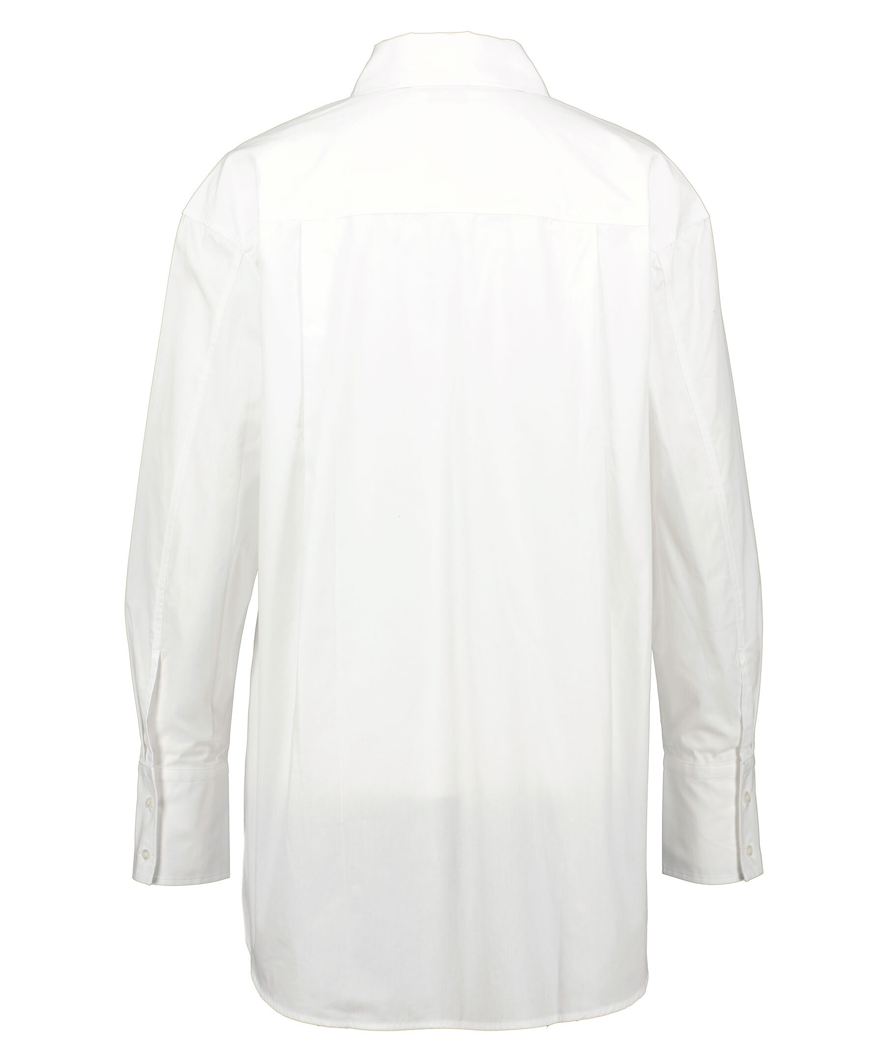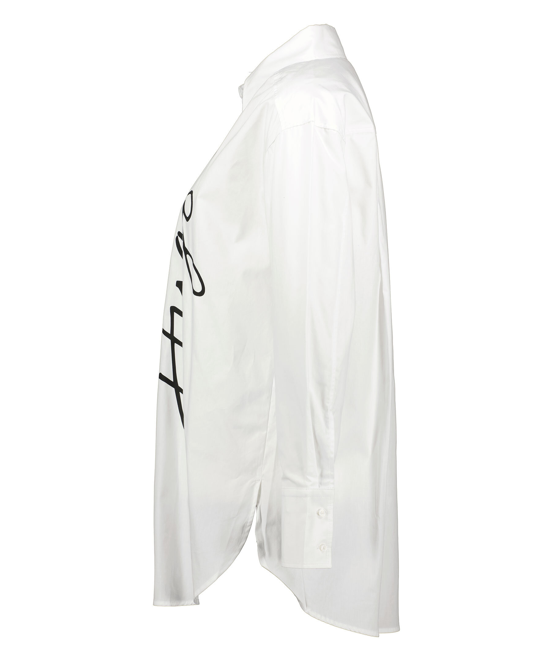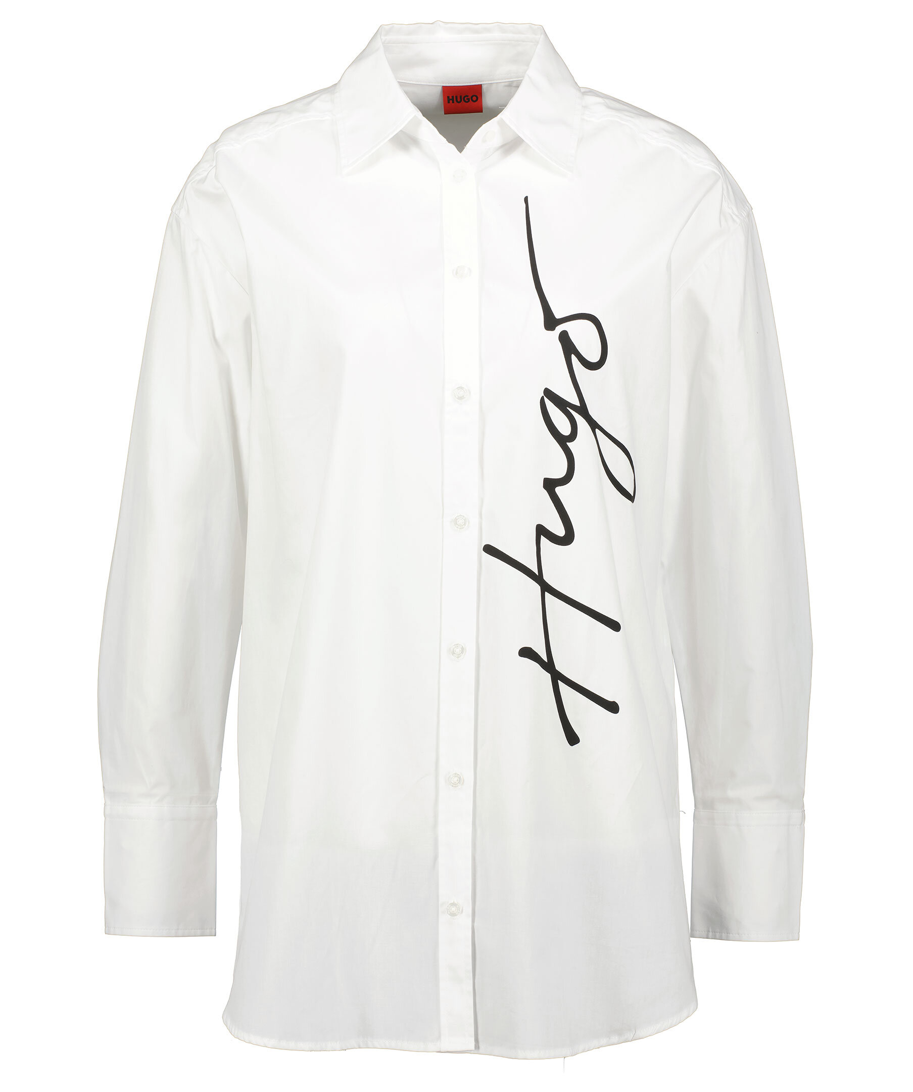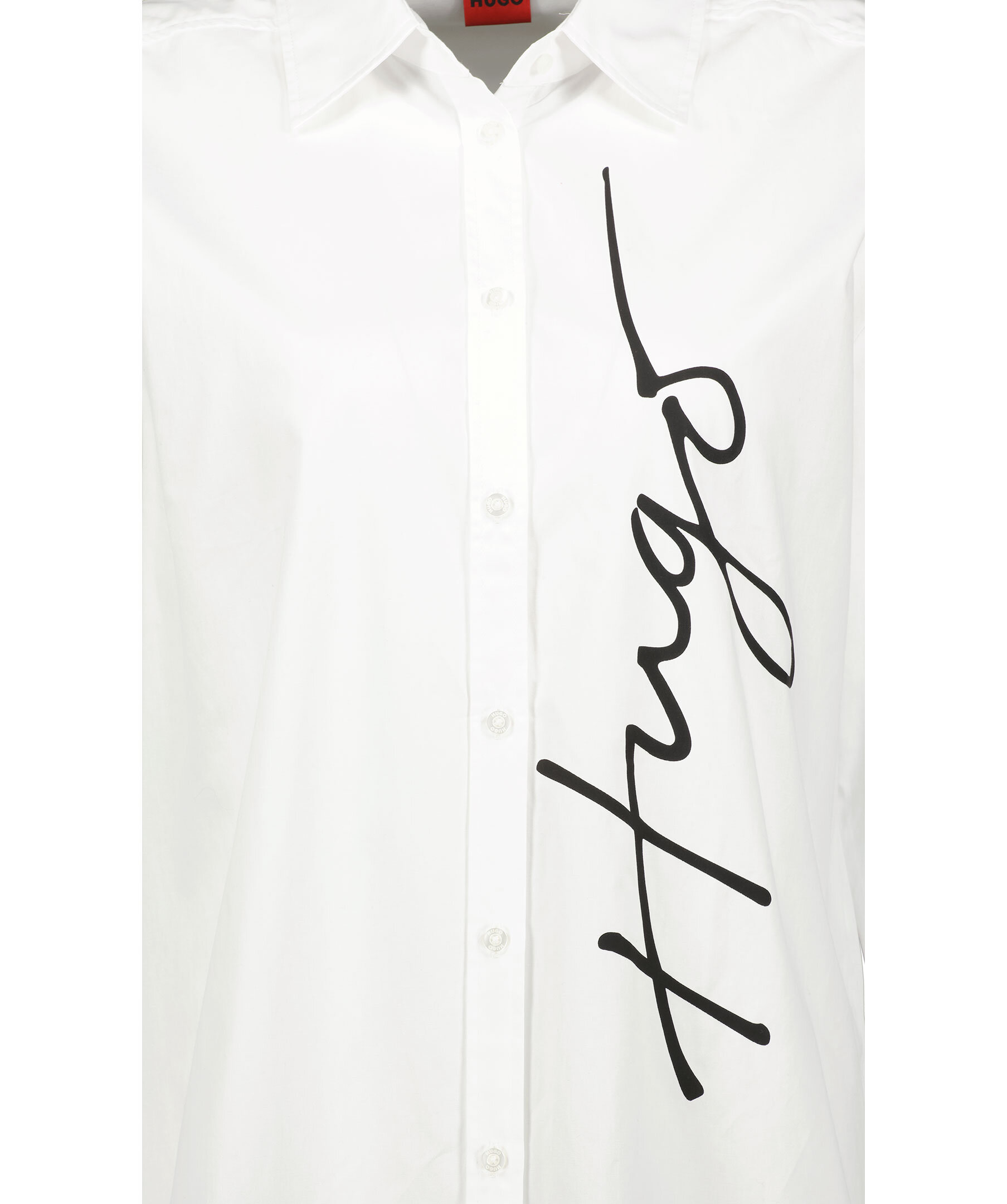 Vit skjorta från Hugo. Stor svart vertikal logotyp på höger sida över bröst och mage. Rundad plaggslut. Skjortan är detaljerad med enkla pärlemoknappar, manschetter och en klassisk krage. Tillverkad av 100% bomull.