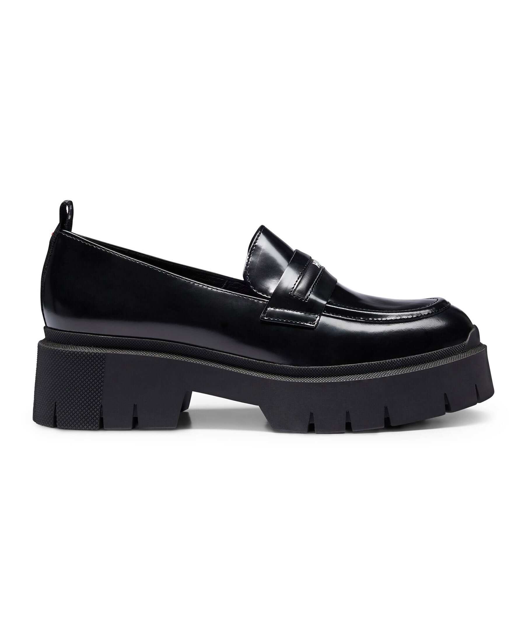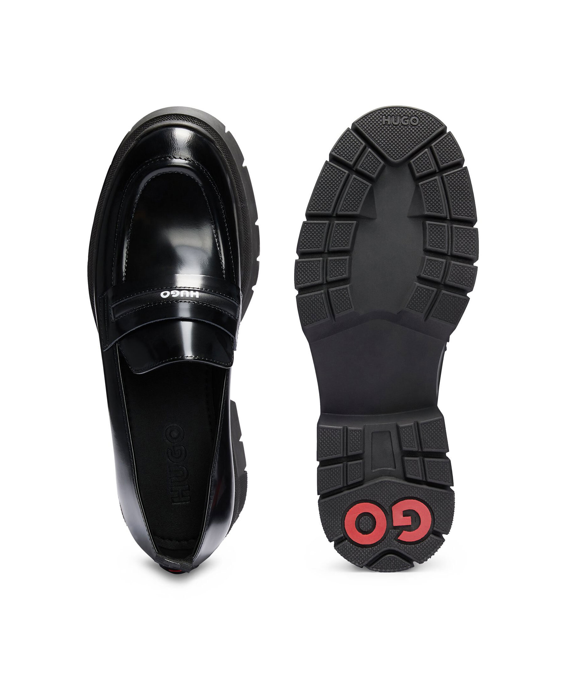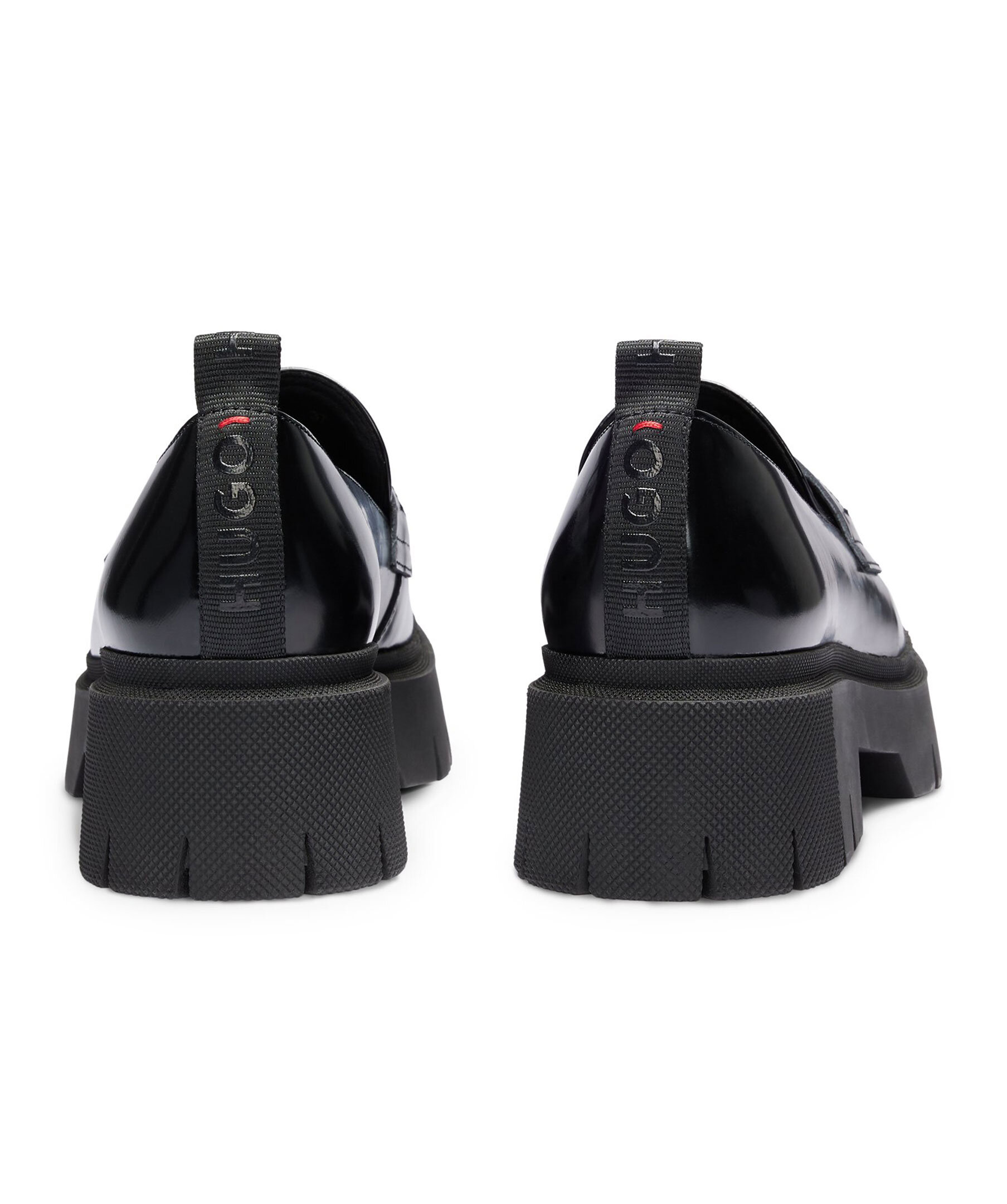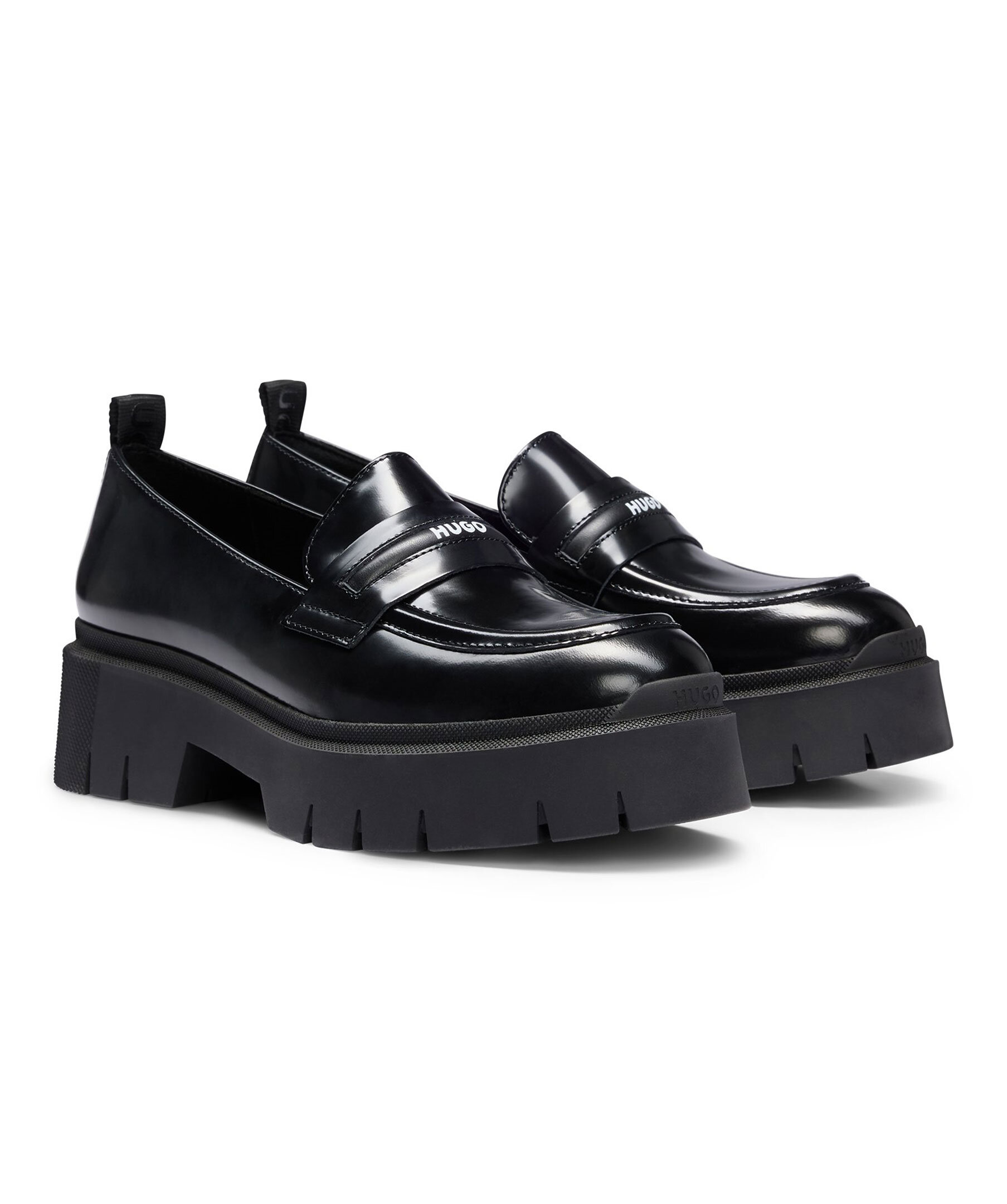 Svarta statement loafers från HUGO. Tillverkade och fodrade i läder och har en tjock sula i gummi. Detaljerad med en vit HUGO logotyp upptill och har en ögla i textil som fortsätter ned på hälen med tryckt ton-i-ton logotyp.