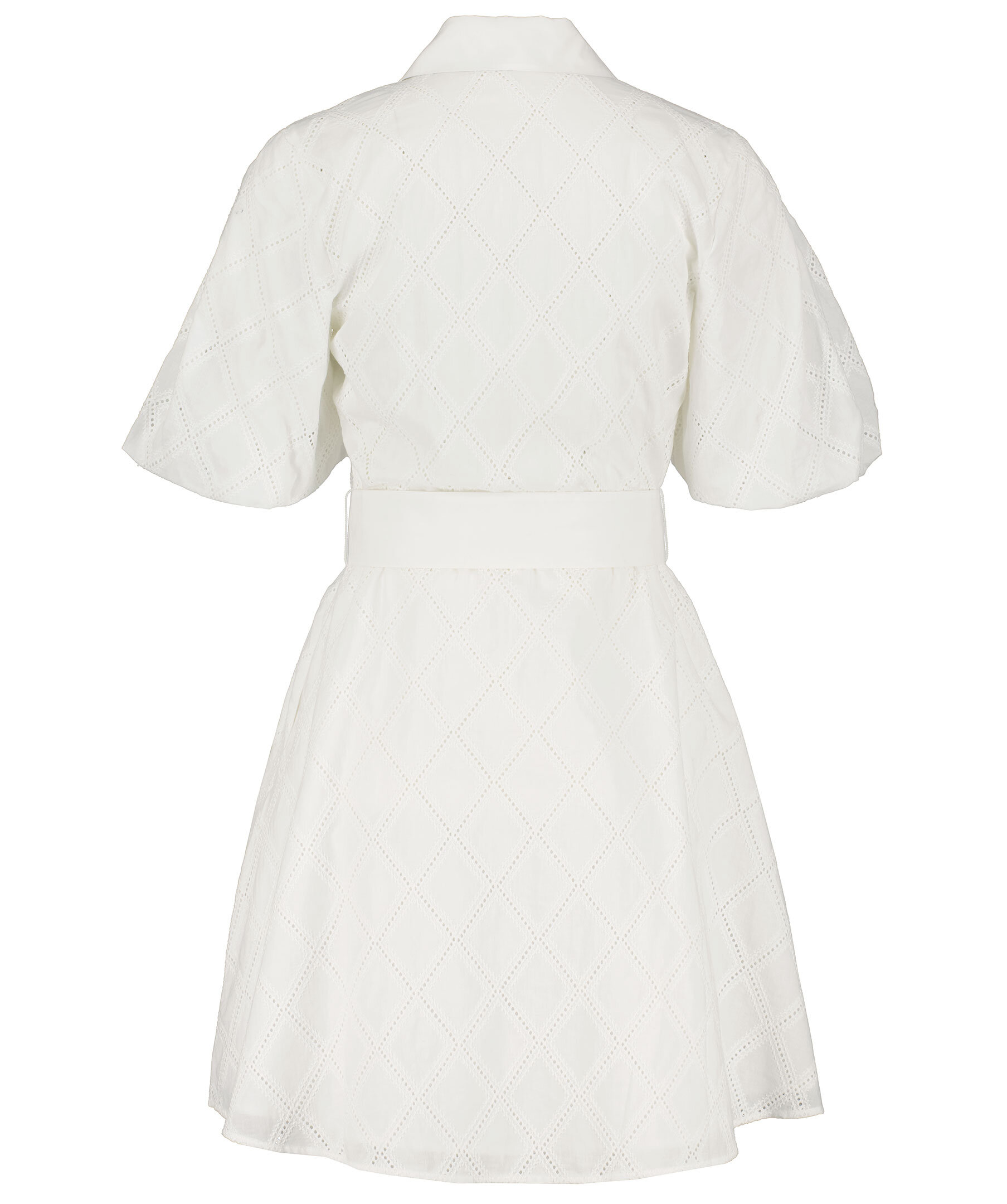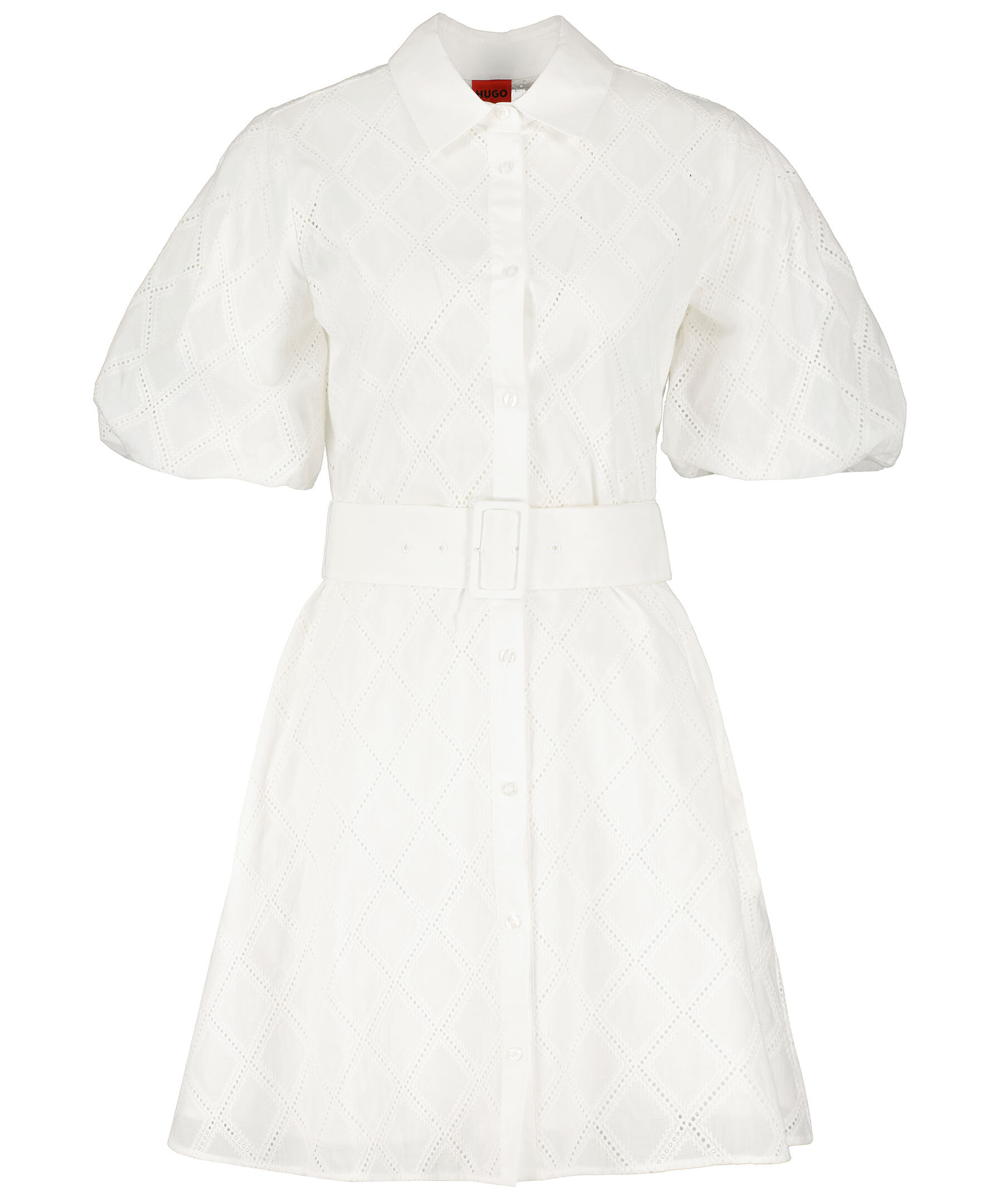 Vit klänning från HUGO. Tillverkad i 100% Bomull. Stängs framtill med knappar och bälte, avtagbart. Spetsig krage och korta puffärmar.