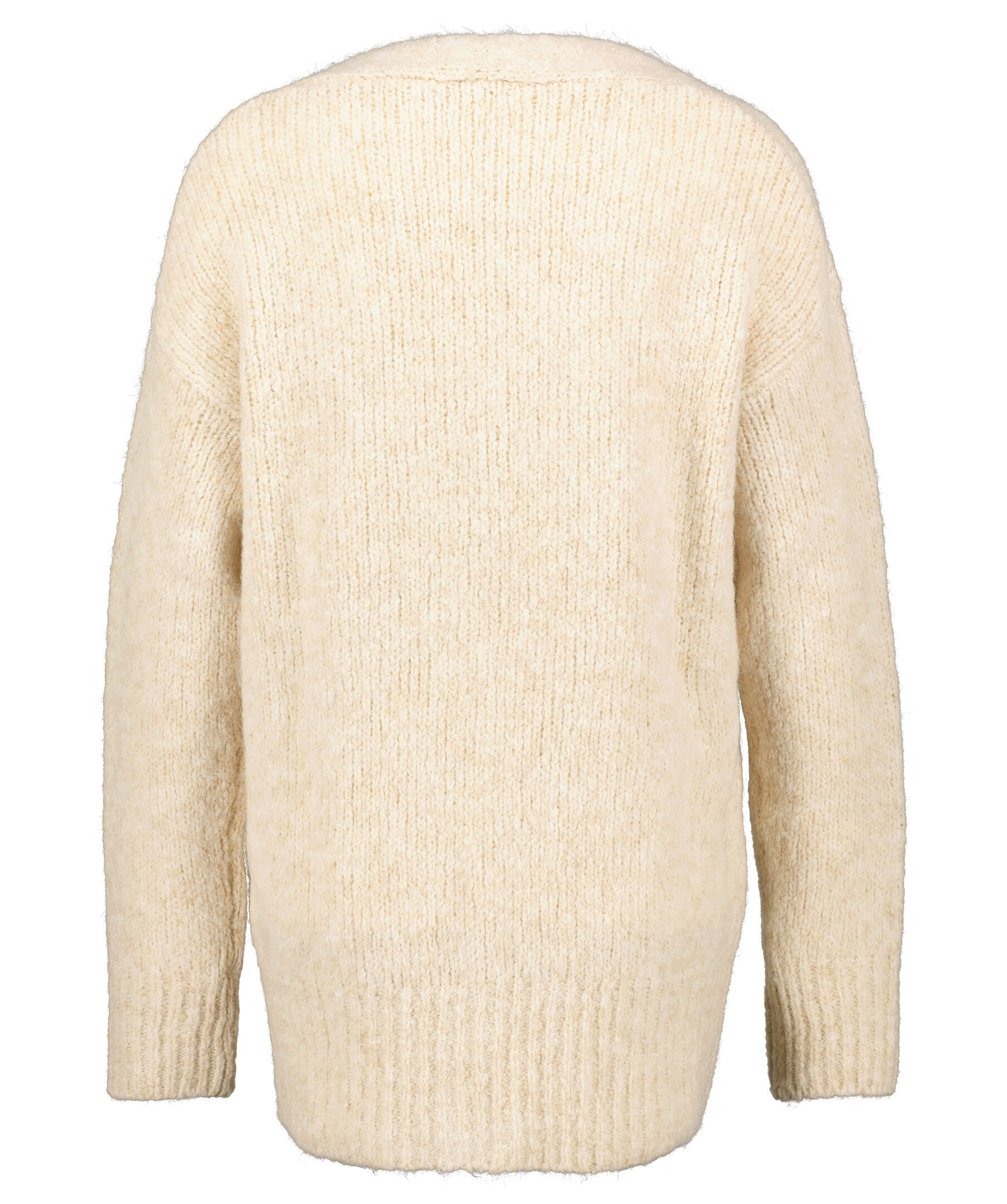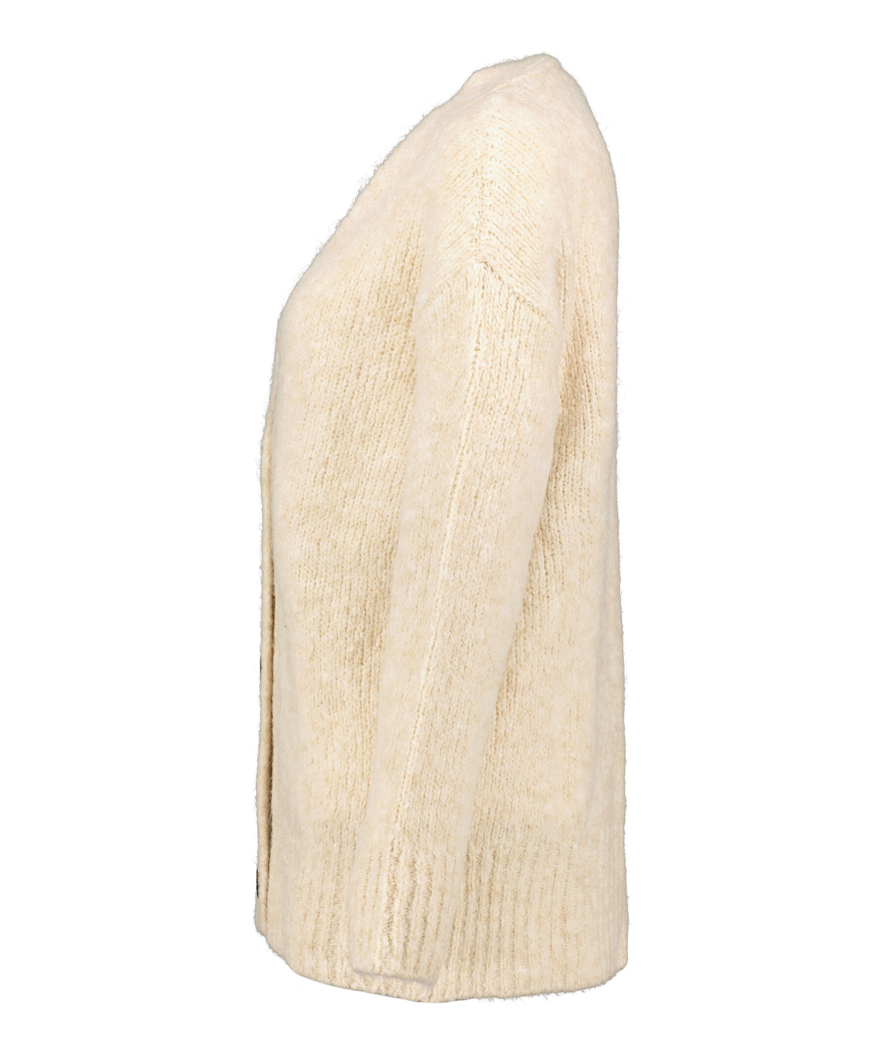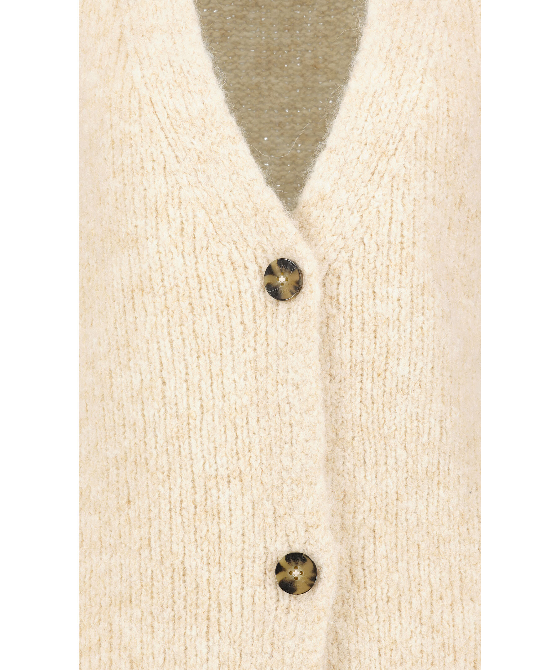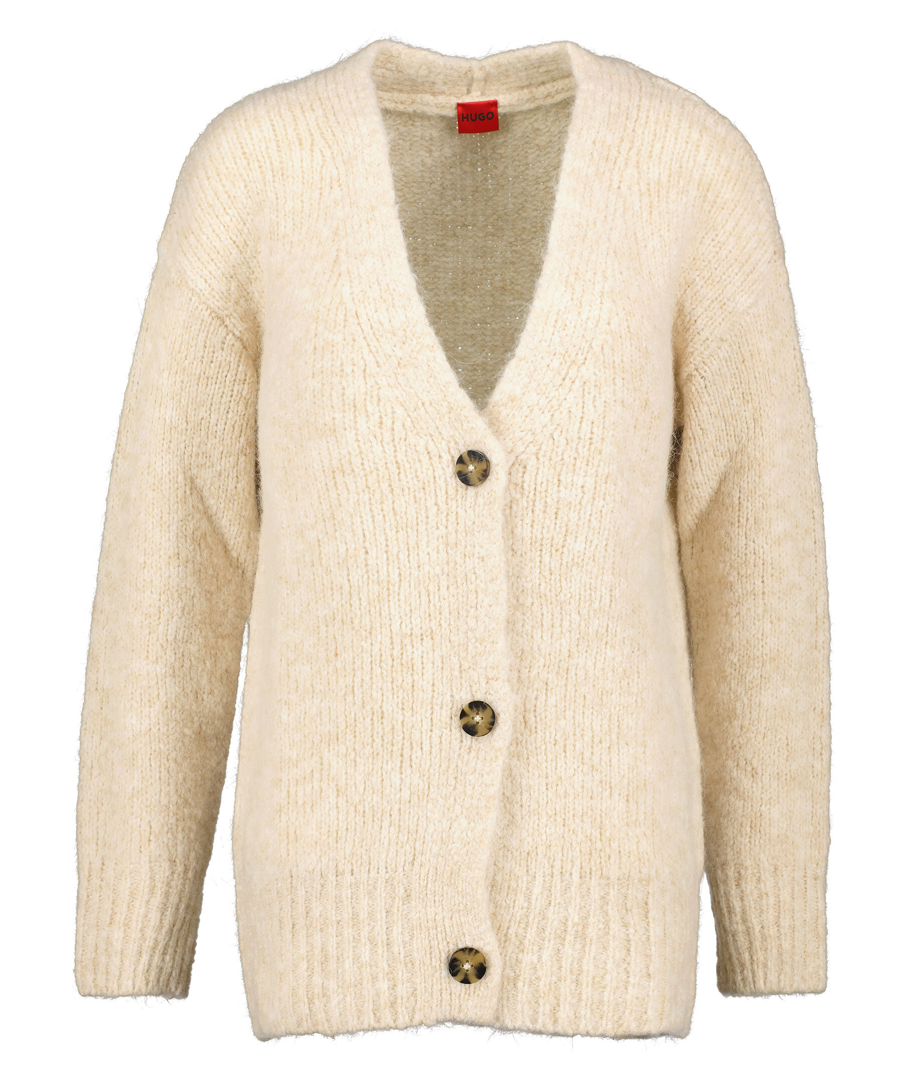 Beige, ribbstickad kofta från HUGO women. V-ringad och stängs med tre melerade knappar. Avslappnad passform och är gjord i en varm ullblandning.