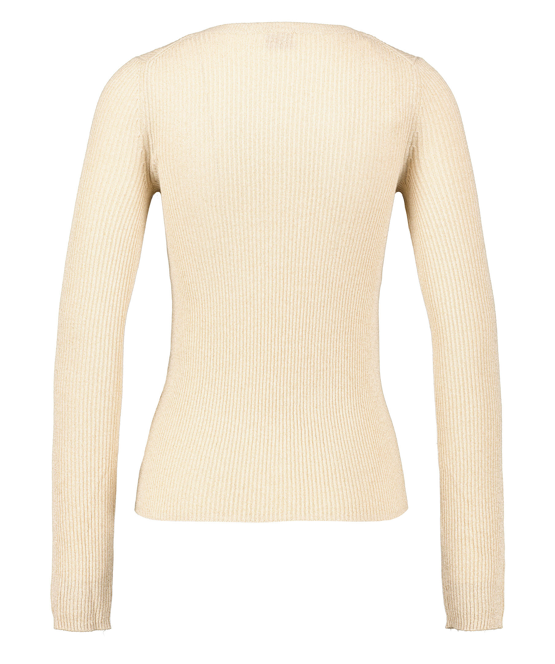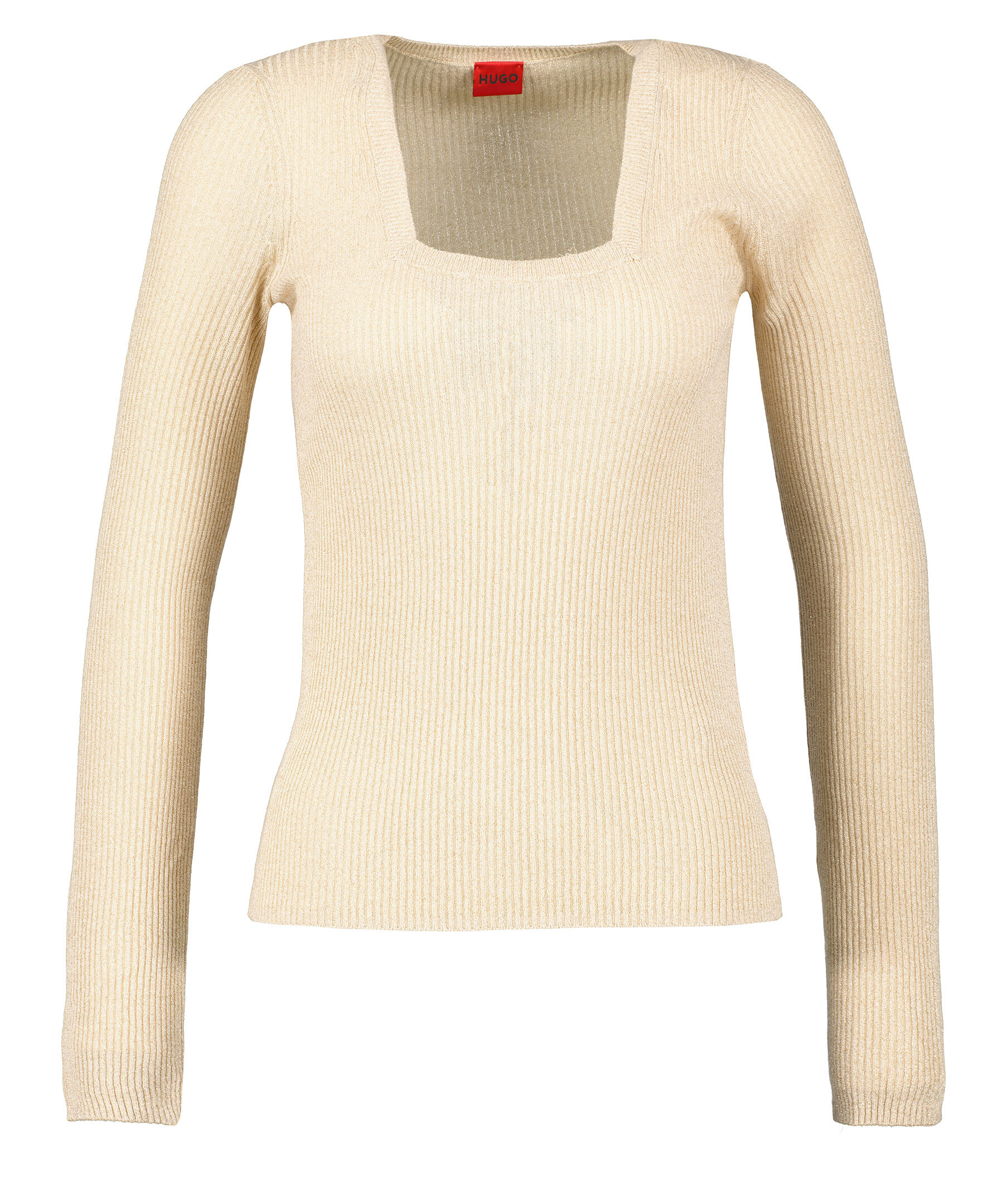 Guldfärgad finstickad ribbad tröja från HUGO. Fyrkantig halsringning. Tillverkad i viskos blandning.