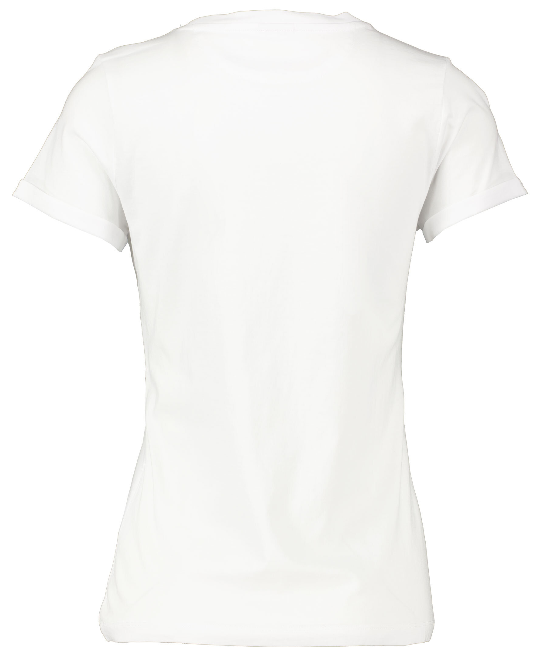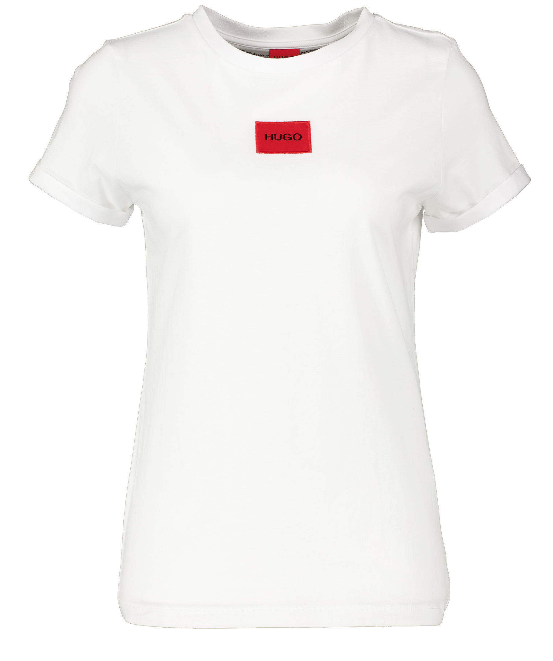 Vit t-shirt i slim fit modell från HUGO. Toppen är gjord i ett skönt bomullstyg. Röd broderad tygpatch på mitten av bröstet. Uppvikta ärmar.