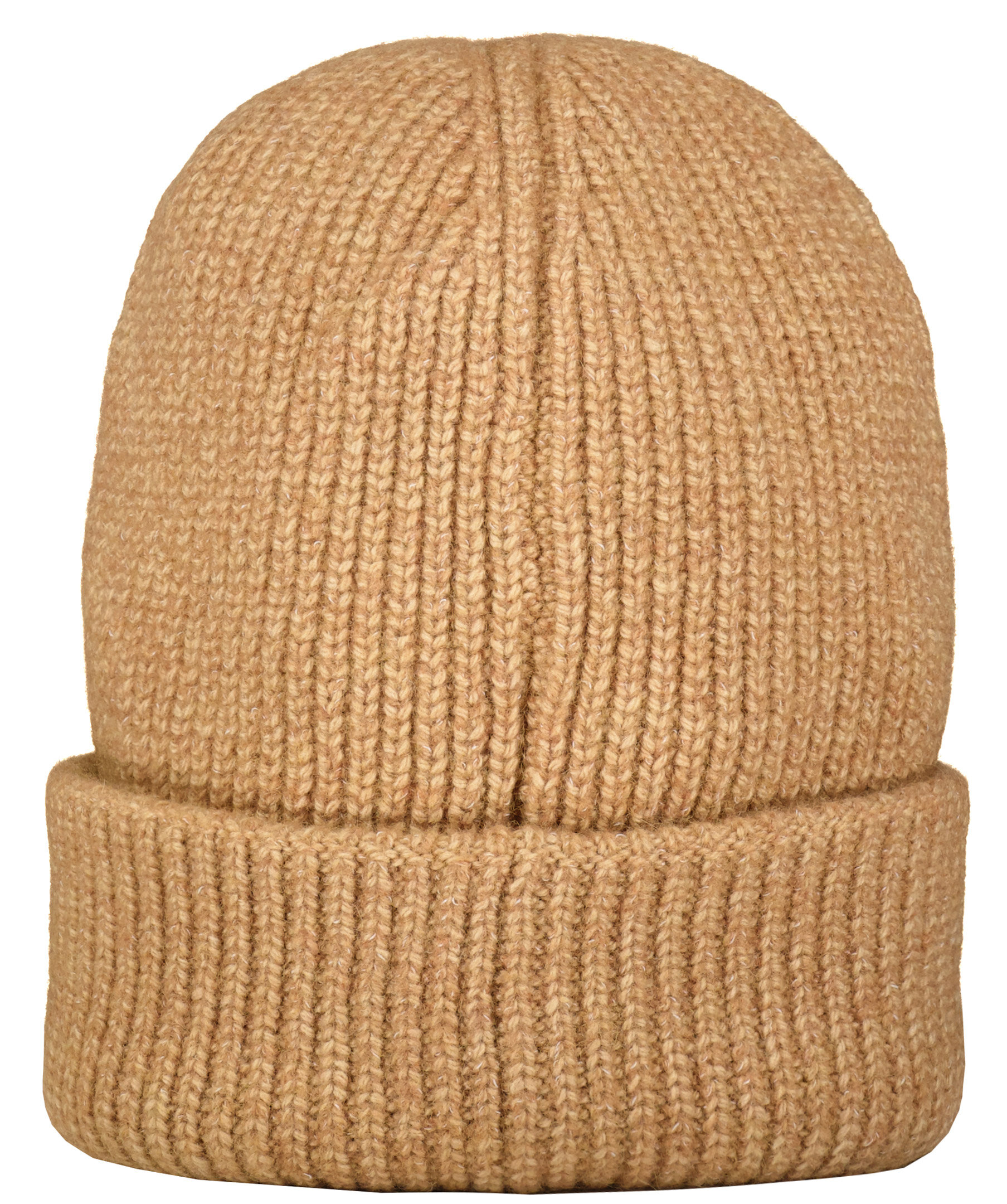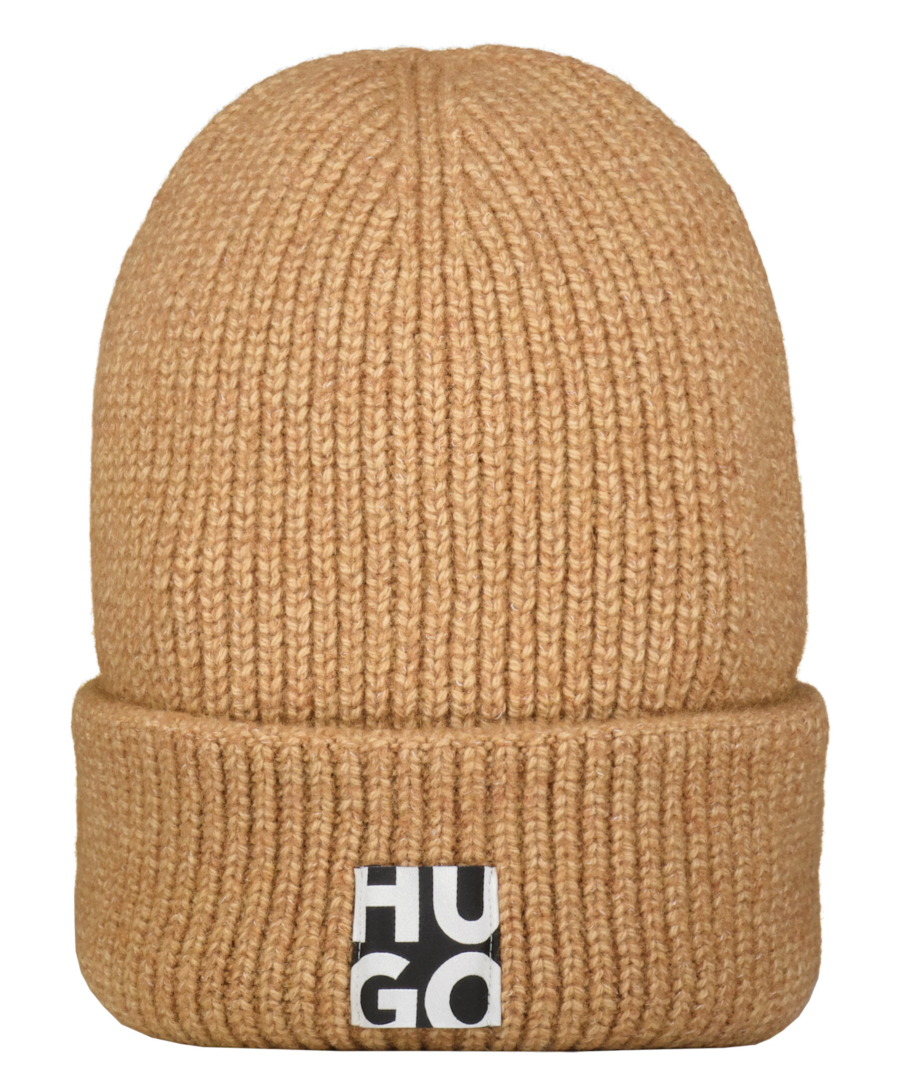 Kamelfärgad, melerad och ribbstickad mössa från HUGO. Tillverkad i ullblandning. Tygpatch med logotyp mitt på framsidan och uppvikt kant.