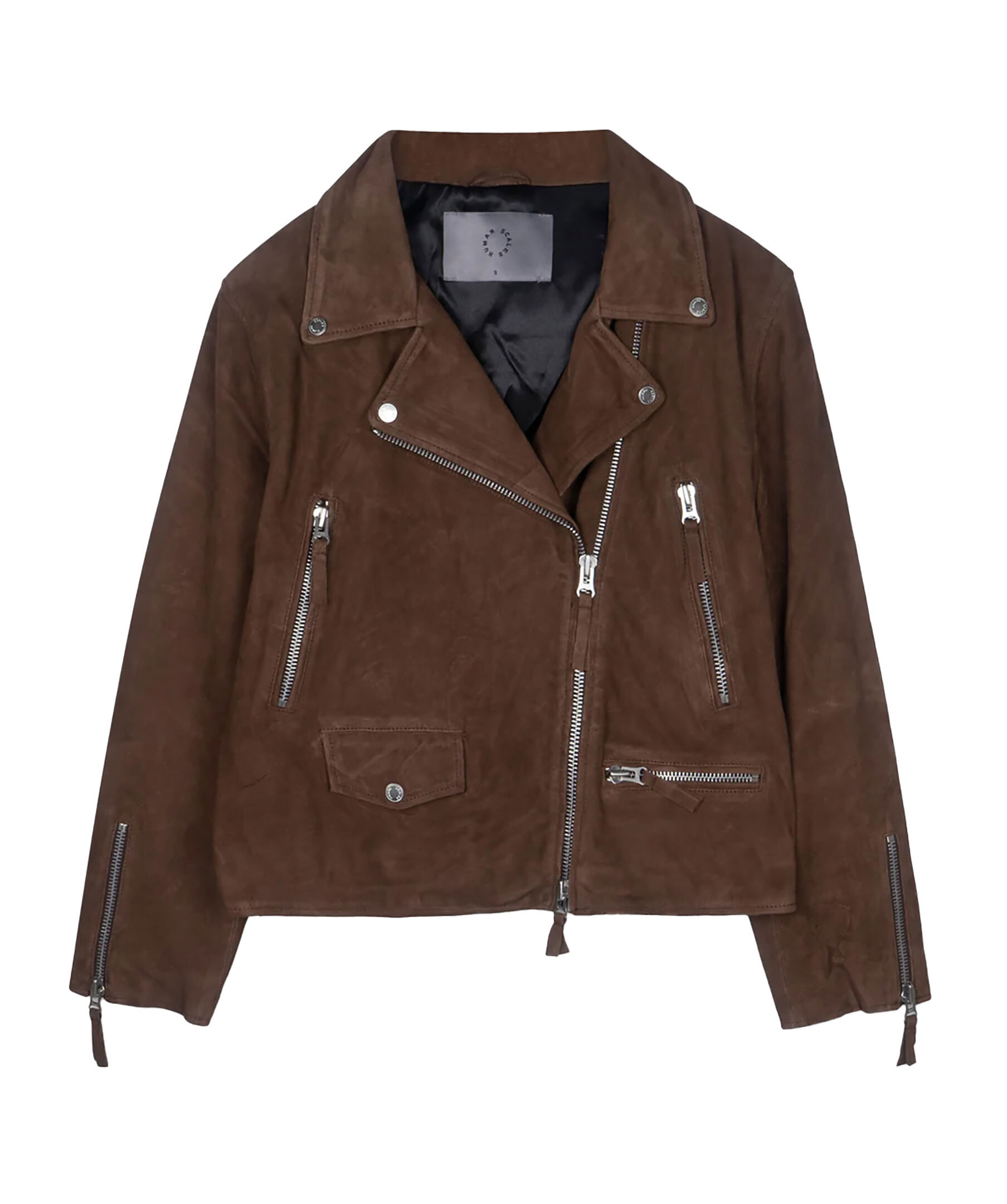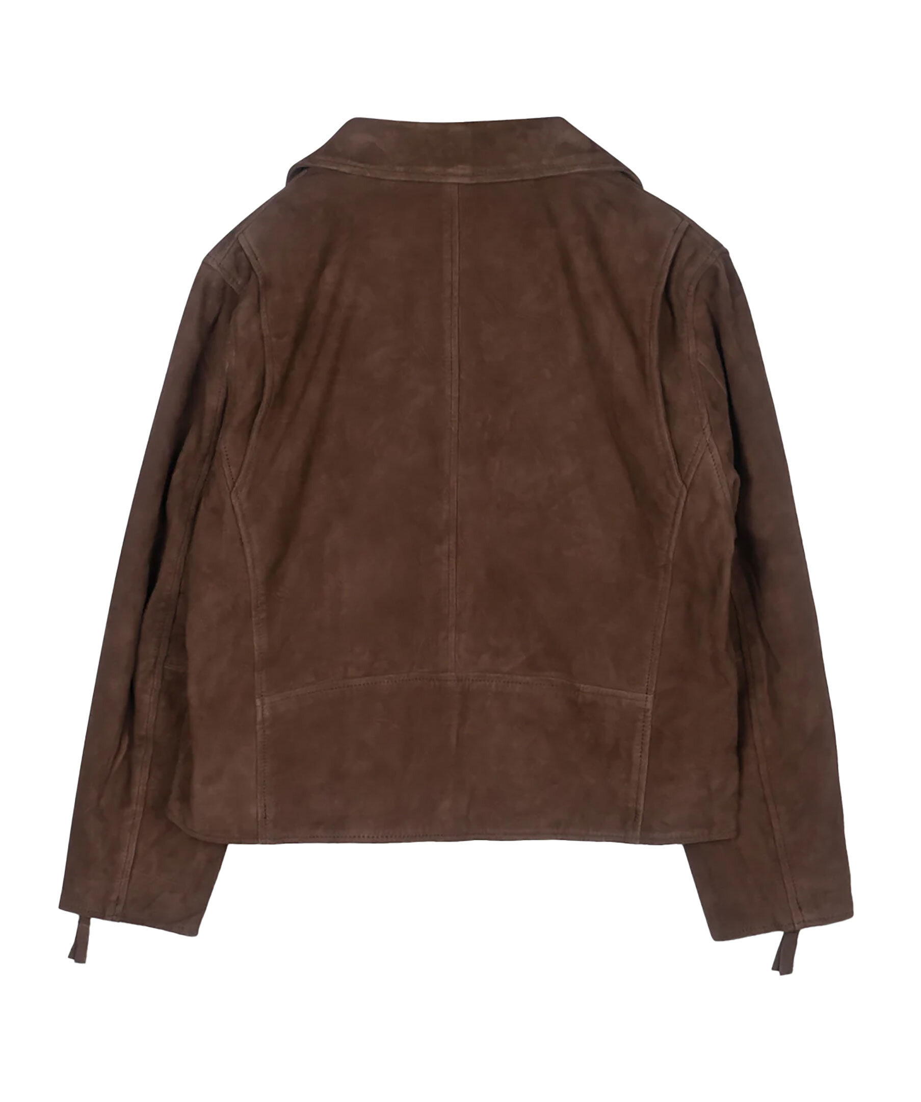Brun jacka i mocka från Human Scales. Jackan har tre fickor med dragkedja och en med knappstängning. Satin insida i svart och två innerfickor samt tvåvägsdragkedja. Tillverkad av mocka.