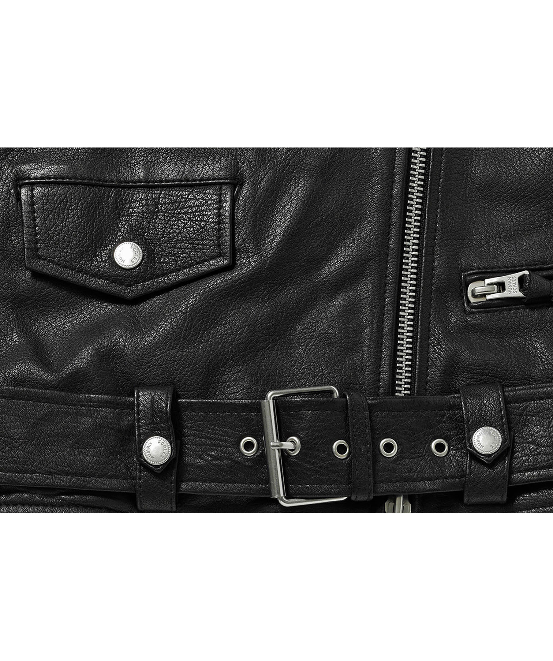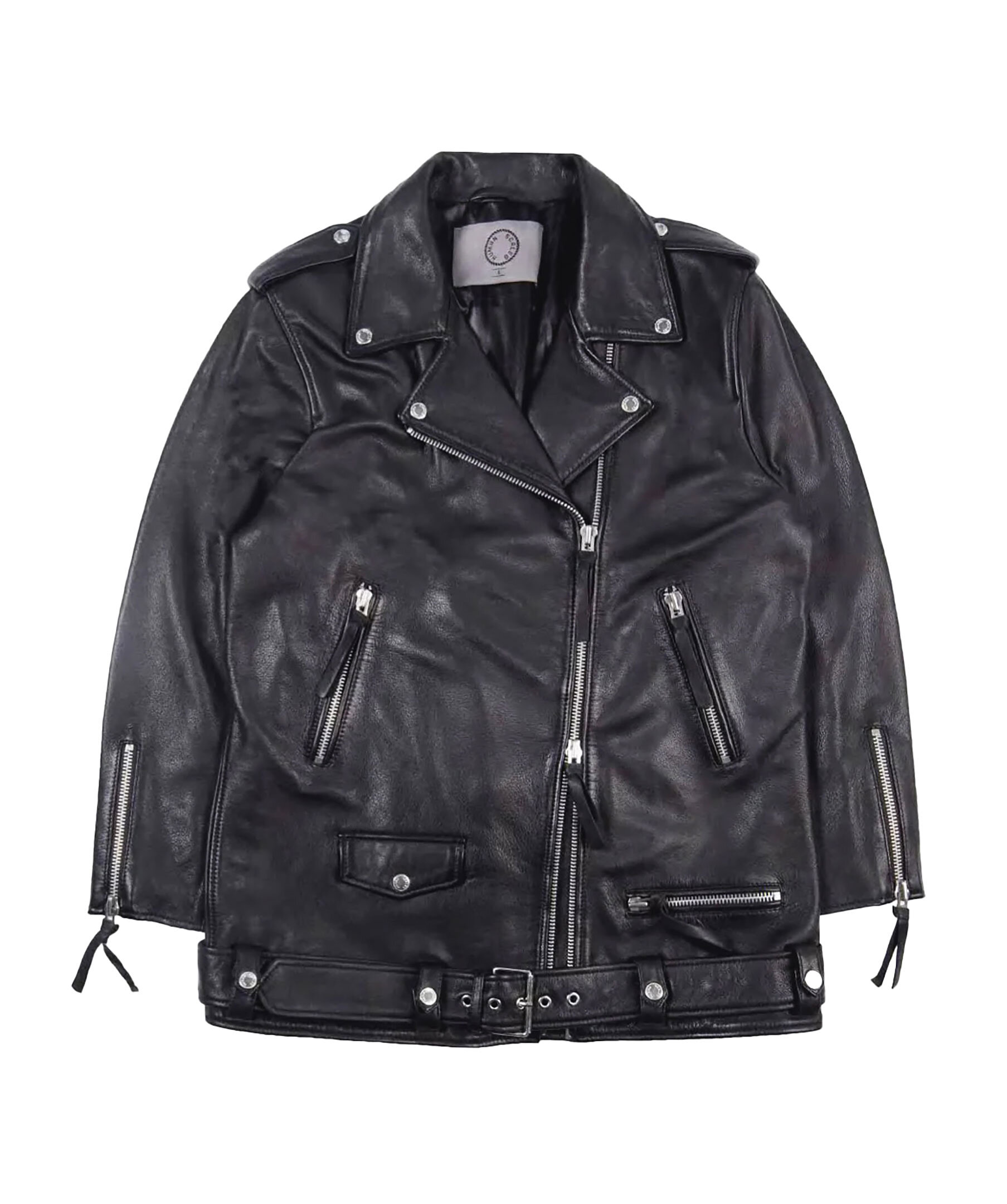 Svart läder jacka i en biker inspirerad stil från Human Scales. Jackan har en oversized passform med bälte och asymmetrisk dragkedja samt blå innersida. Tre fickor med dragkedja, en med knappstängning, samt innerficka. Tillverkad av läder.