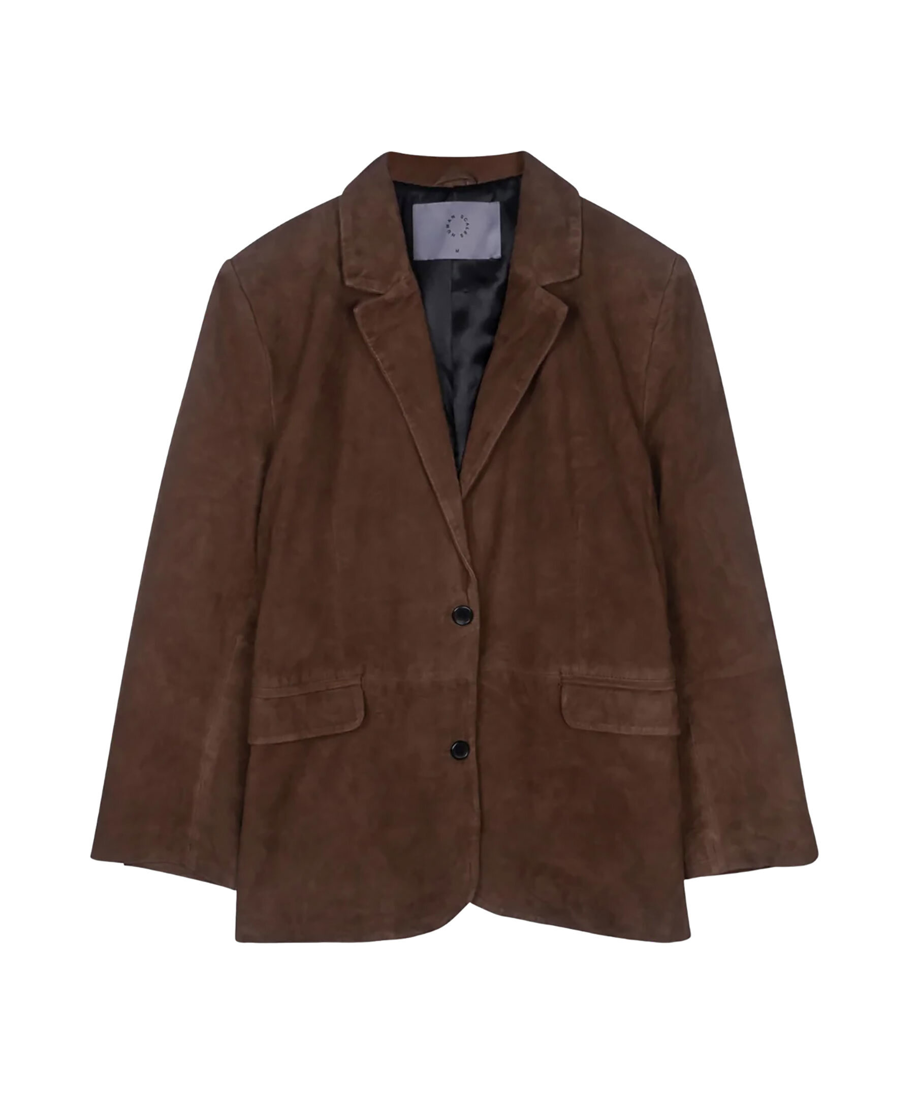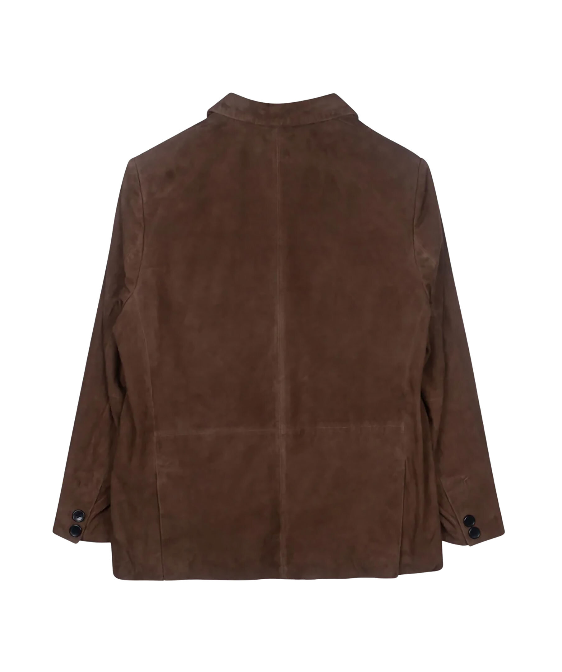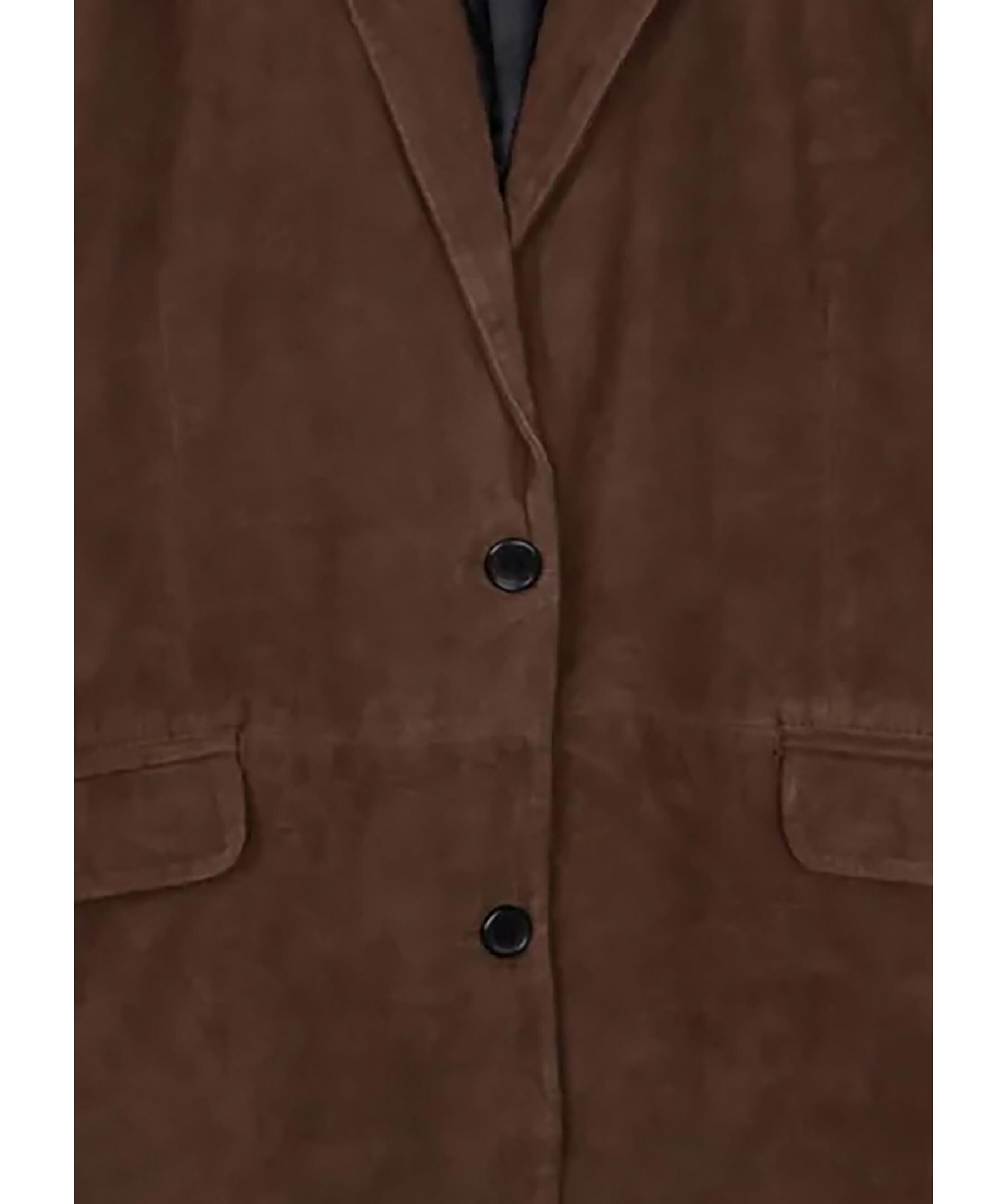 Brun kavaj i mocka från Human Scales. Kavajen stängs med knappar framtill och har två yttre fickor samt två innerfickor och är helfodrad. Tillverkad i läder.