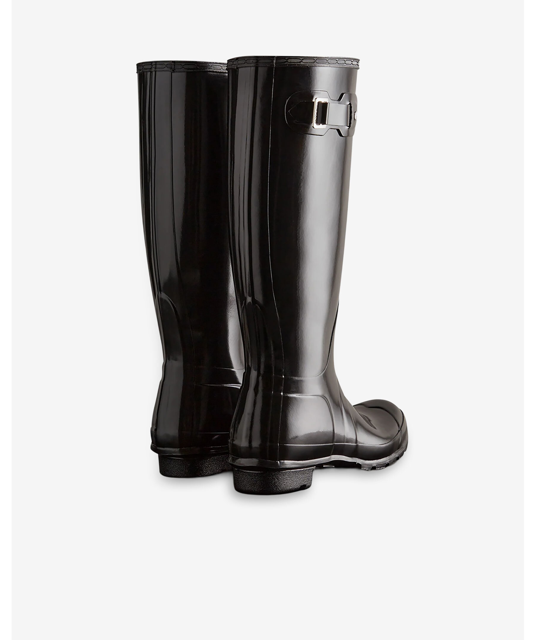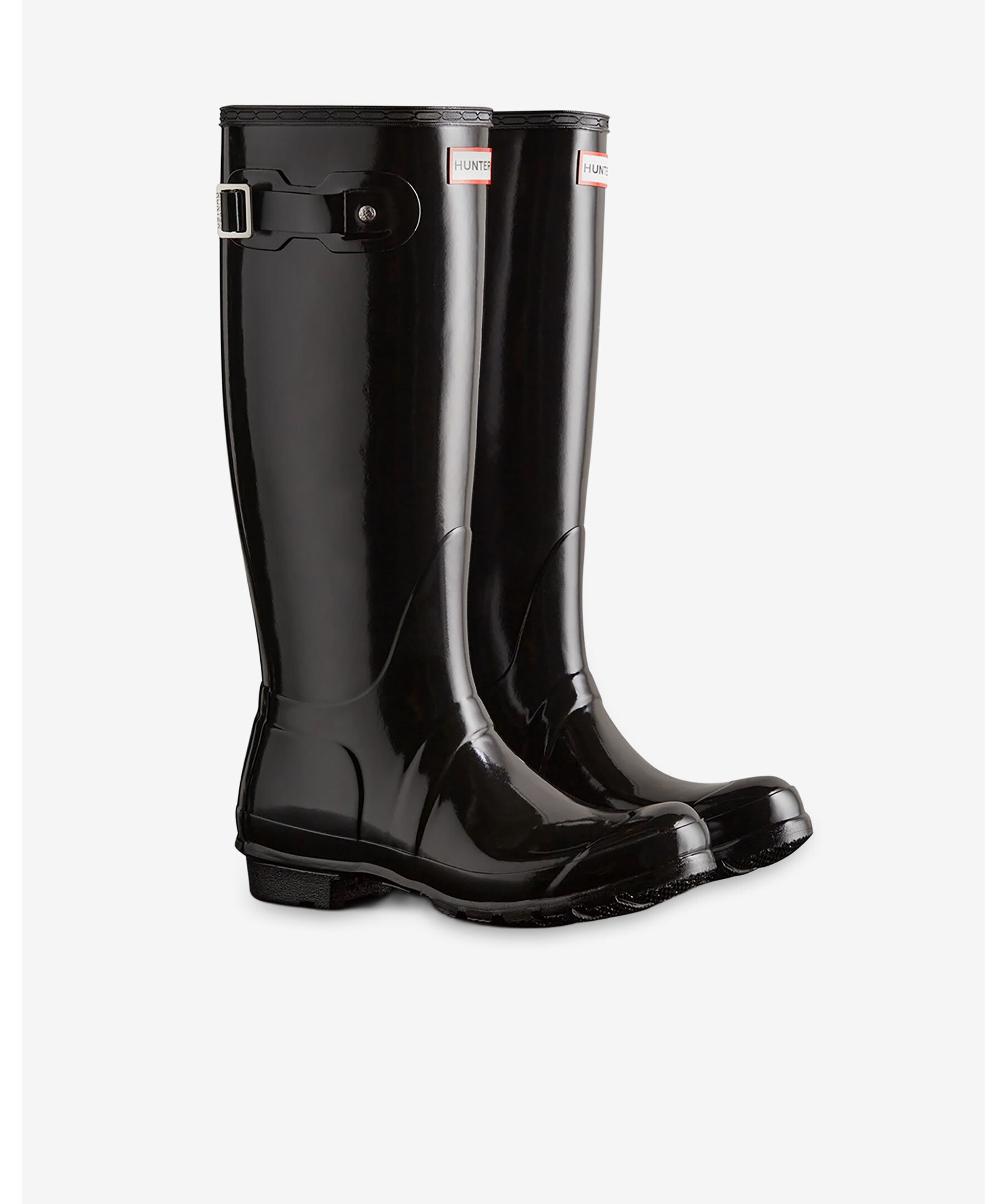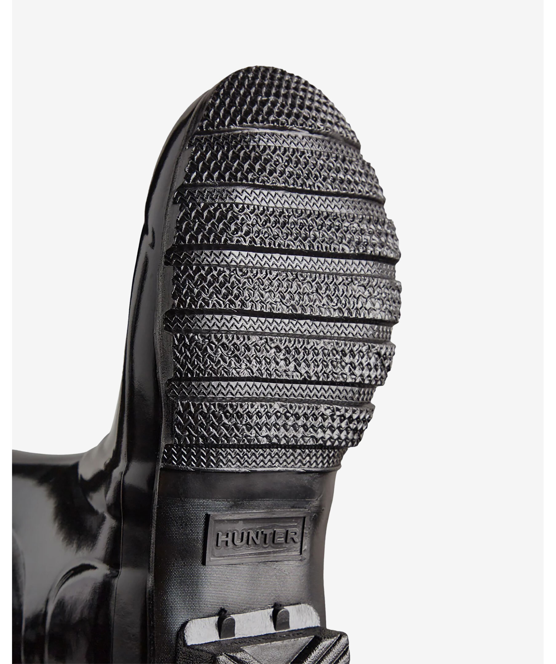 Svarta gummistövlar från Hunter. Stövlarna har en klassisk, hög design med en glänsande yta. De är tillverkade av naturligt gummi och har en justerbar rem med spänne på sidan. Denna stil är en del av Hunter Originals-kollektionen och har varit en favorit sedan 1956. Perfekta för regniga dagar eller som en stilren accessoar till vardags.
