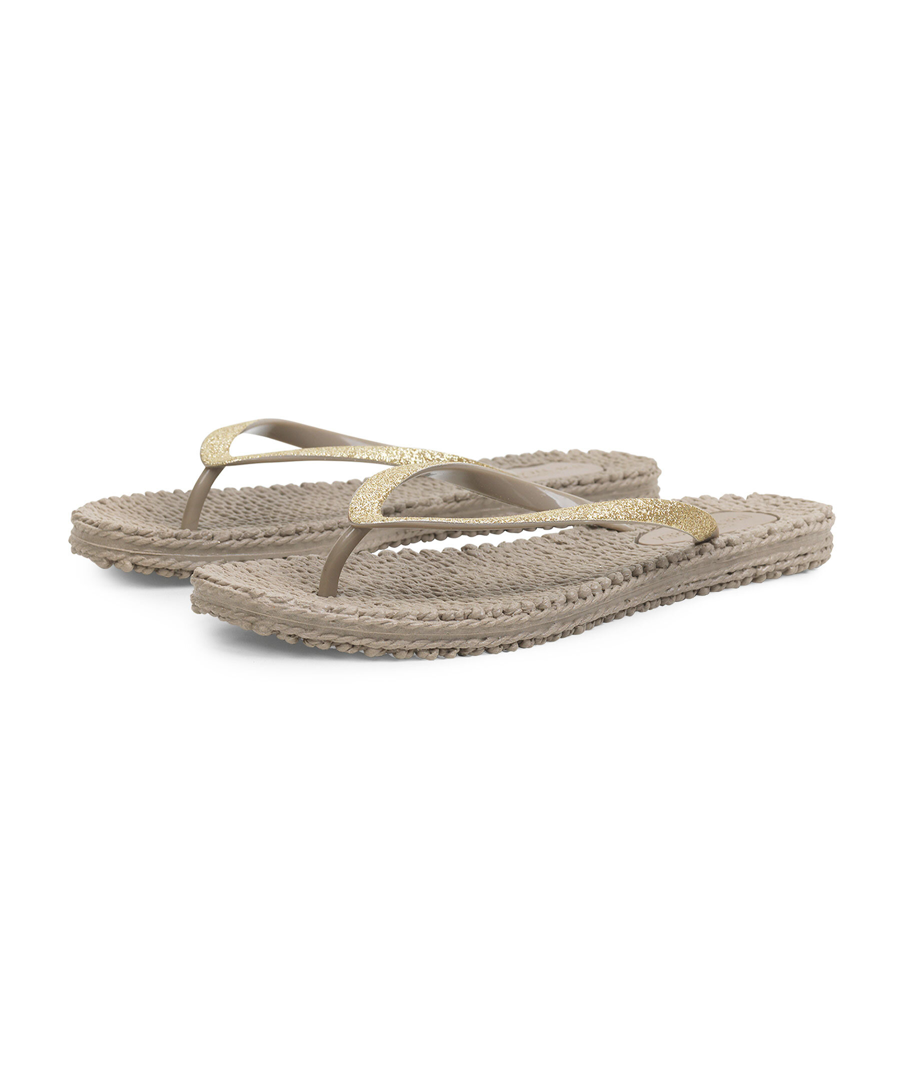 Beiga Flip flops från ILSE JACOBSEN. Tillverkade av lätt och flexibel luftrubber. Den strukturerade sulan ger en skön massageeffekt. Glitterdekorerad rem. Perfekta för strandpromenader och somriga tillfällen.