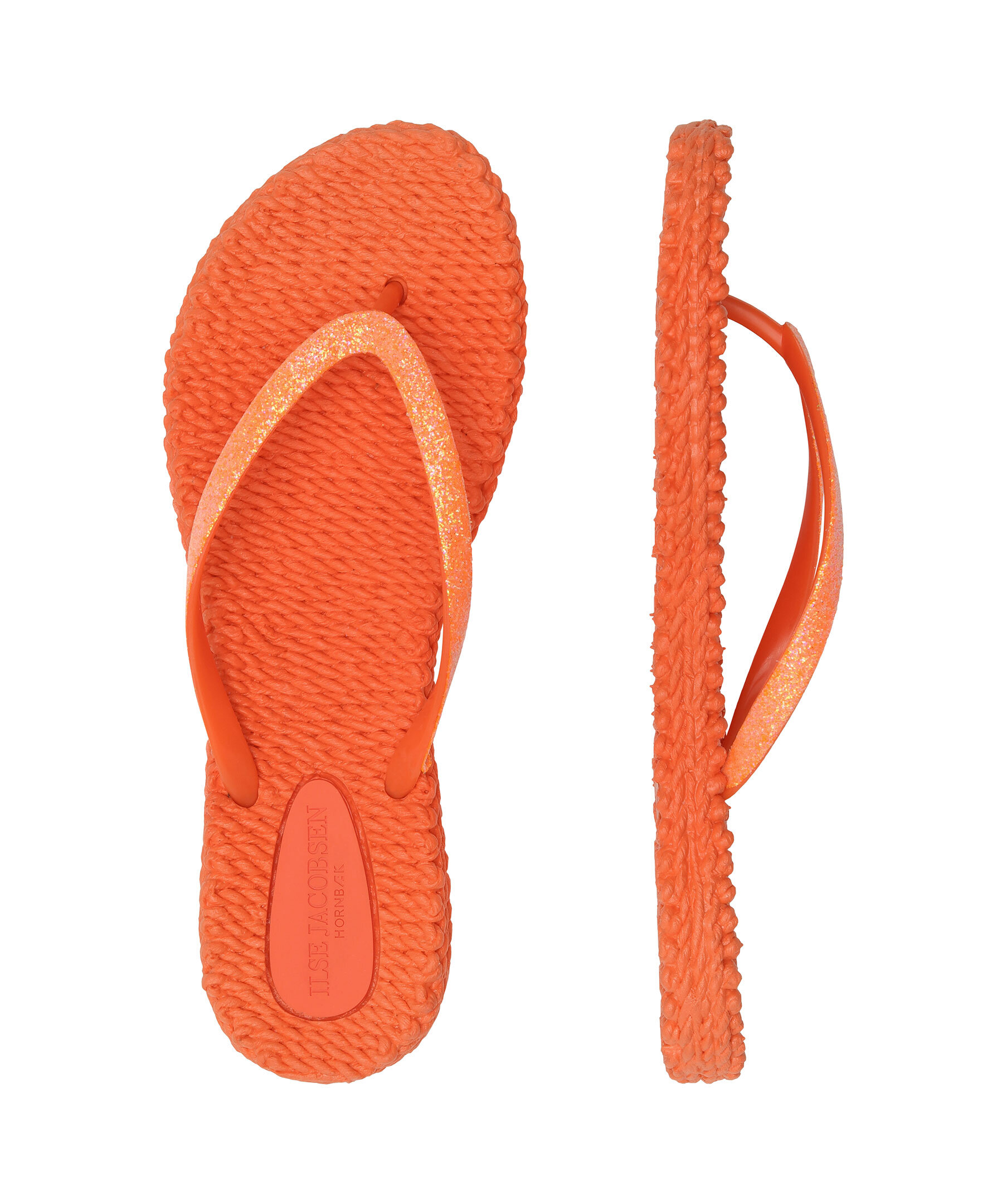 Flip flops från ILSE JACOBSEN i en härlig orange färg. Tillverkade av lätt och flexibel luftrubber. Den strukturerade sulan ger en skön massageeffekt. Glitterdekorerad rem. Perfekta för strandpromenader och somriga tillfällen.