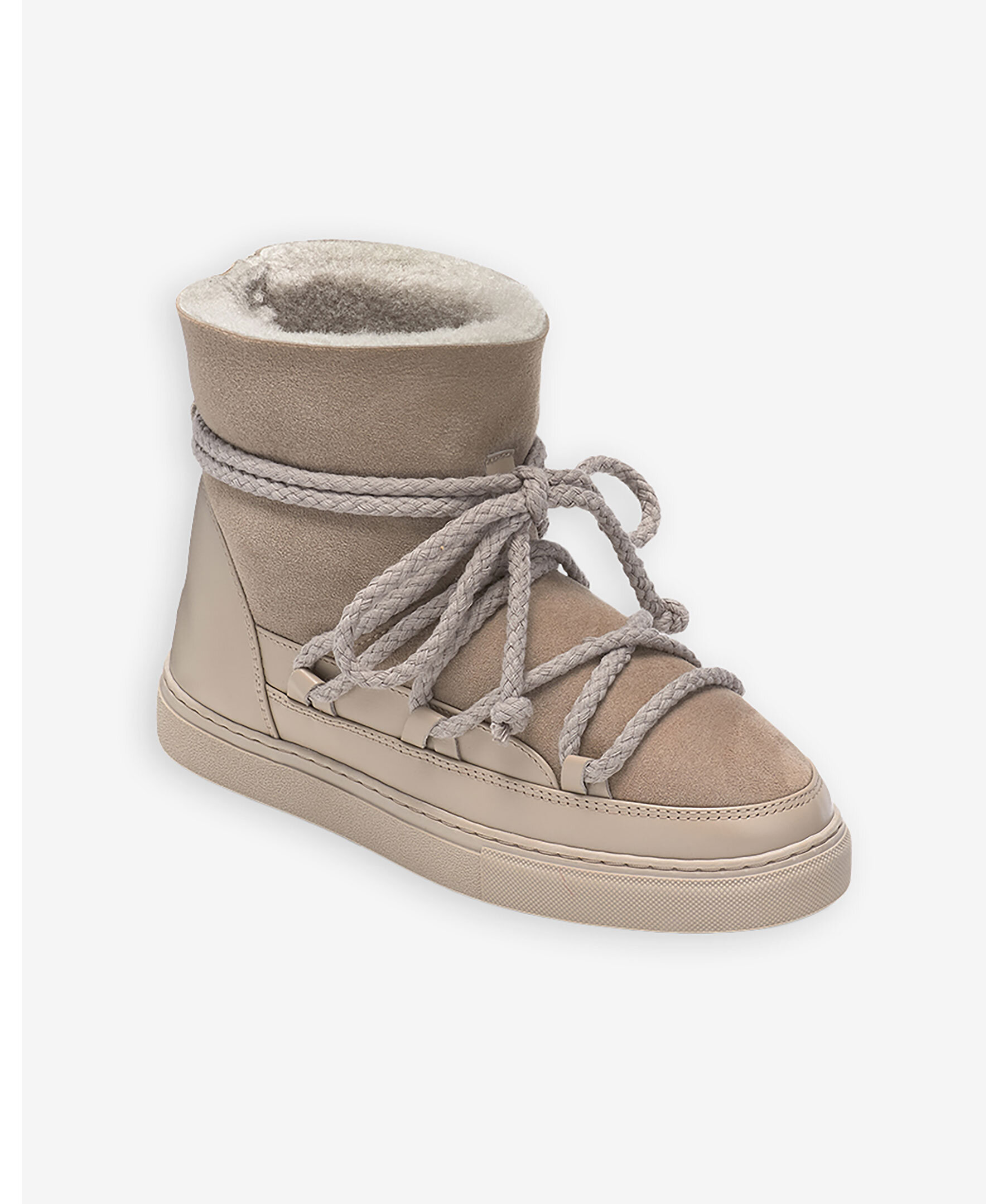 Gråa, varmfodrade skor från Inuikii. Foder och yttermaterial i fårskinn och detaljer i läder. Sula i gummi. Rundad tå samt snörning fram. Broderad logotyp bak på hälen.