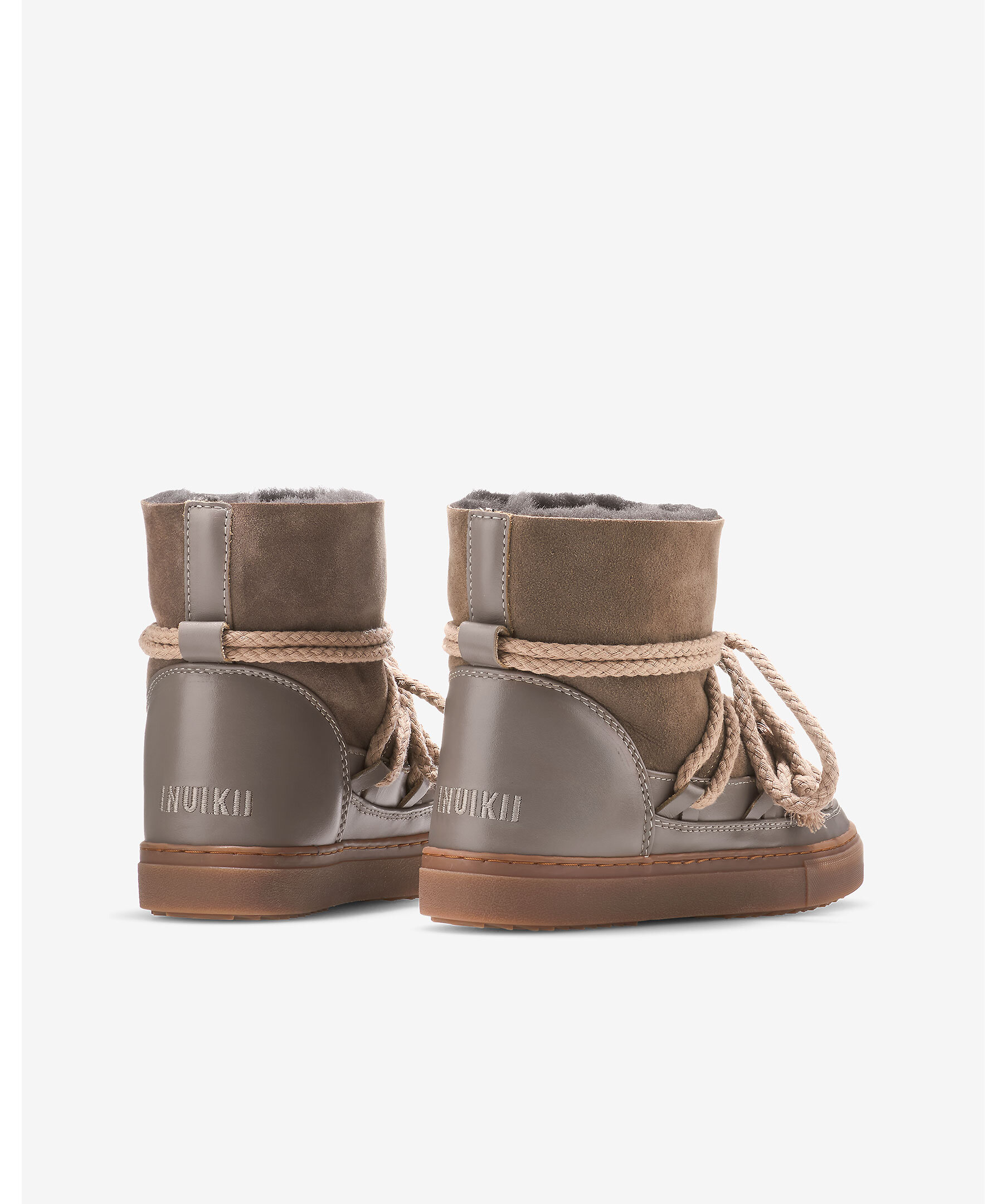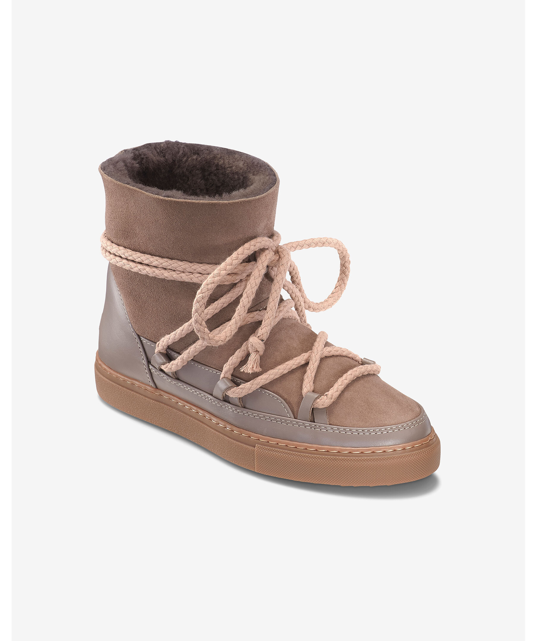 Mullvadsfärgade, varmfodrade skor från Inuikii. Foder och yttermaterial i fårskinn och detaljer i läder. Sula i gummi. Rundad tå samt snörning fram. Broderad logotyp bak på hälen.