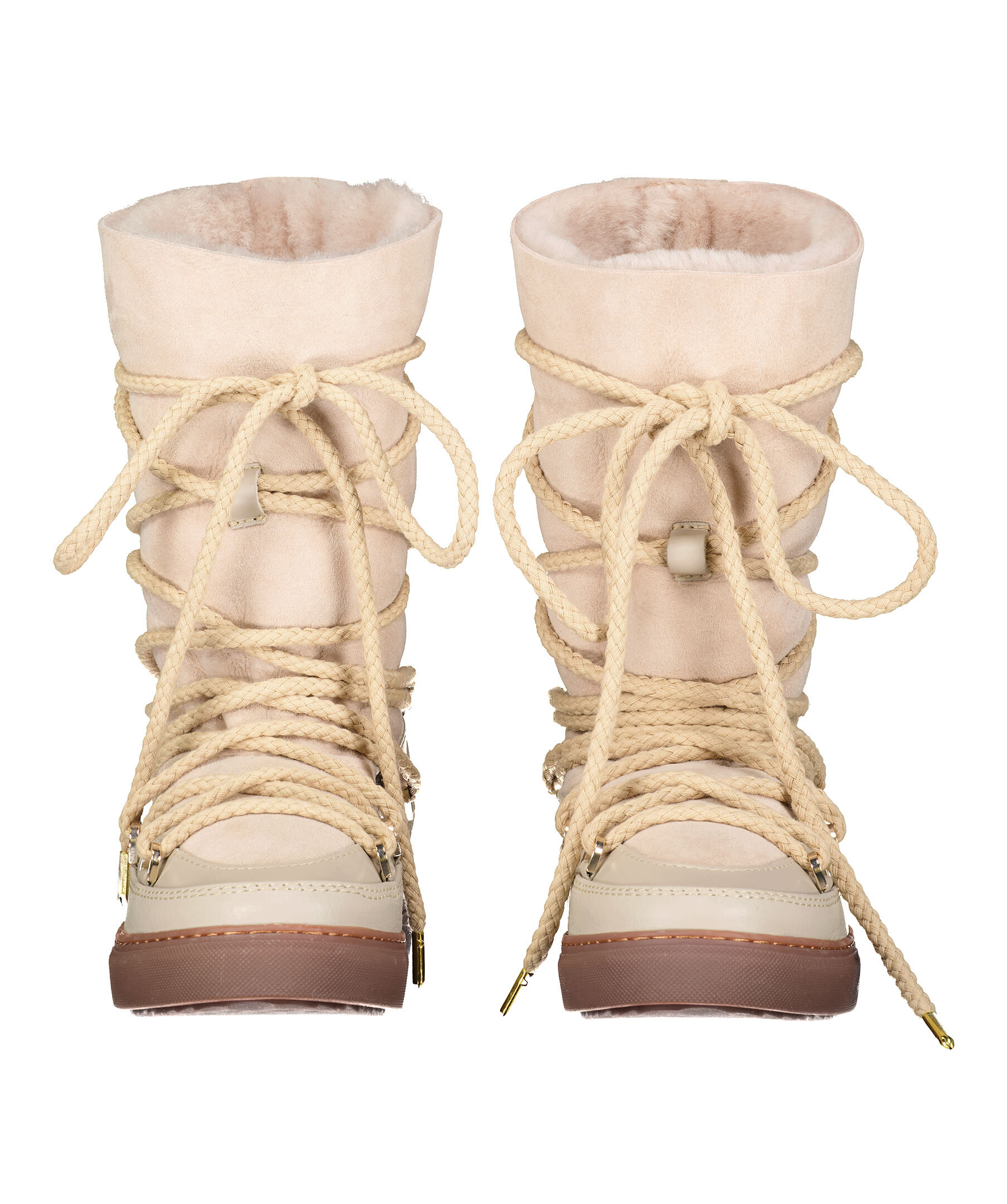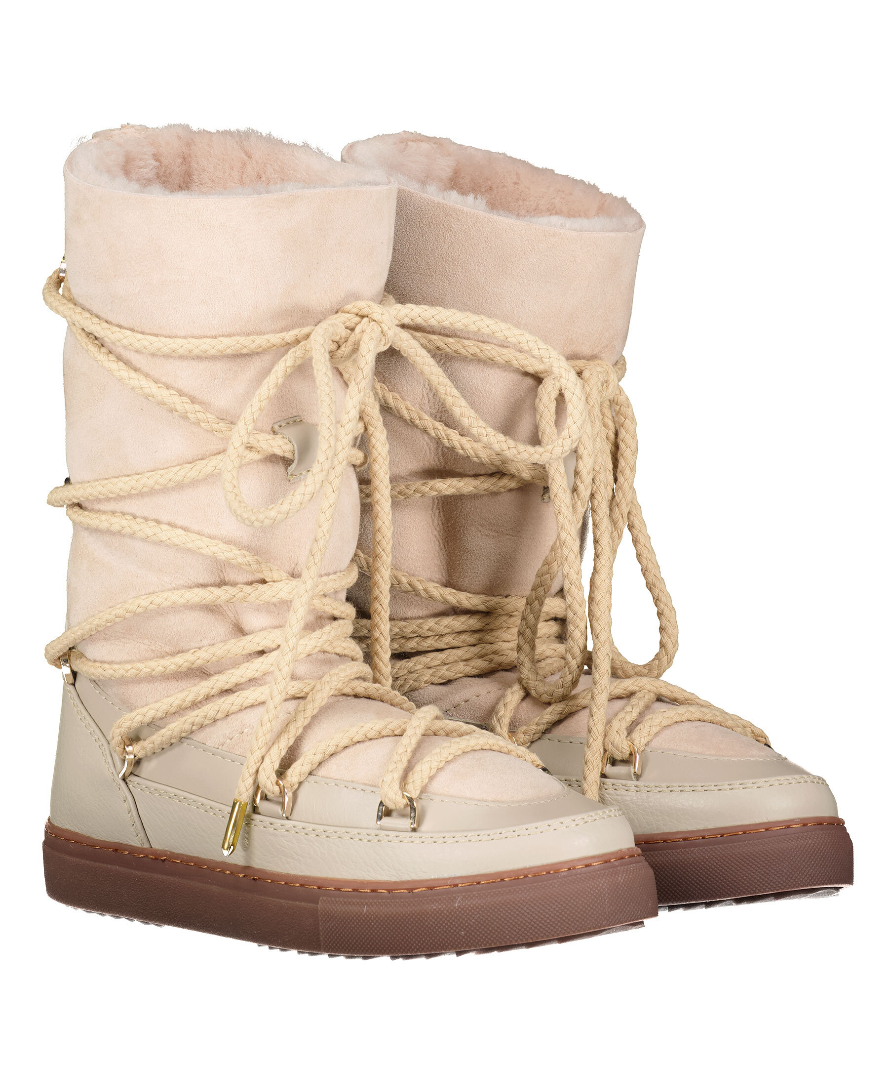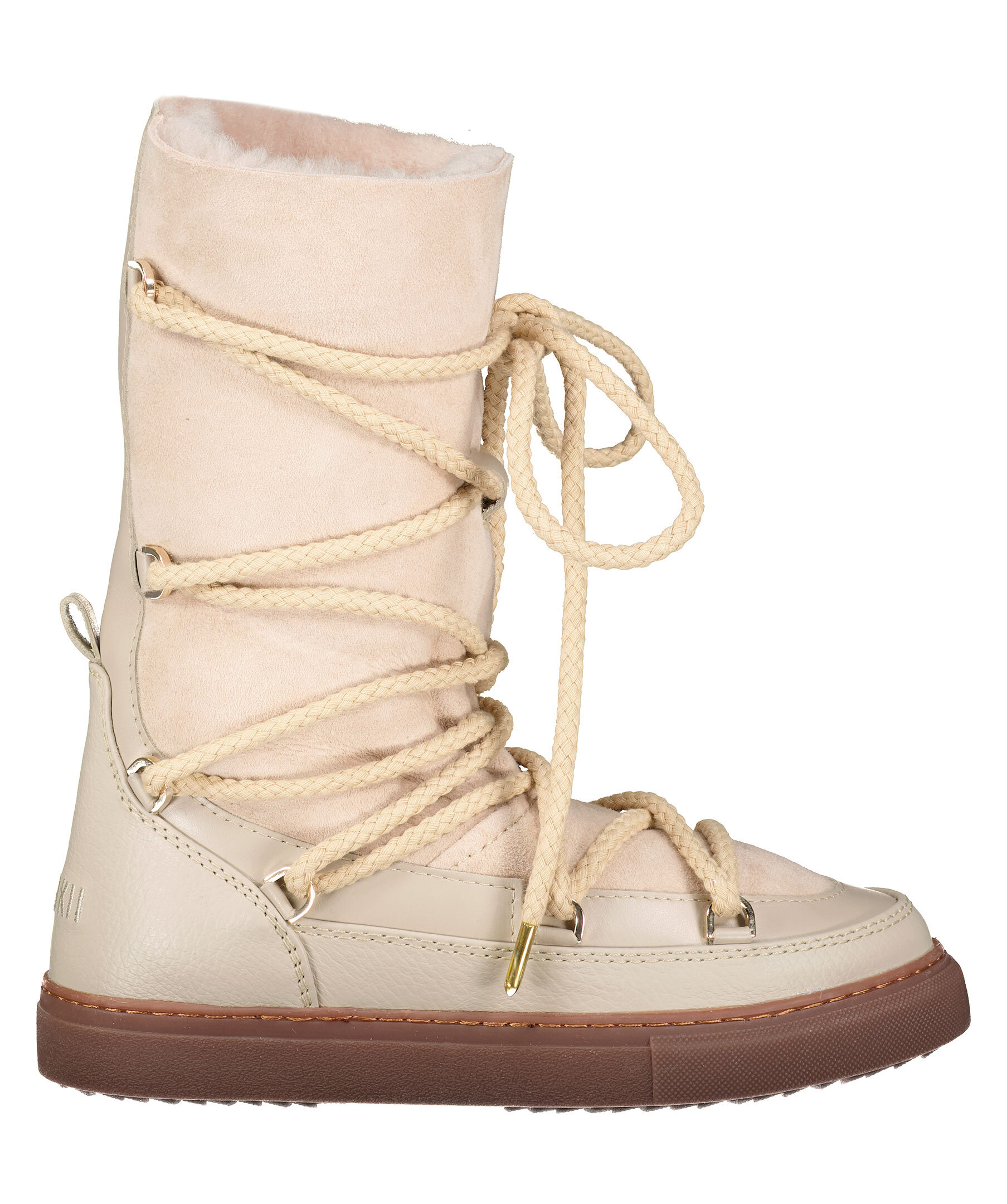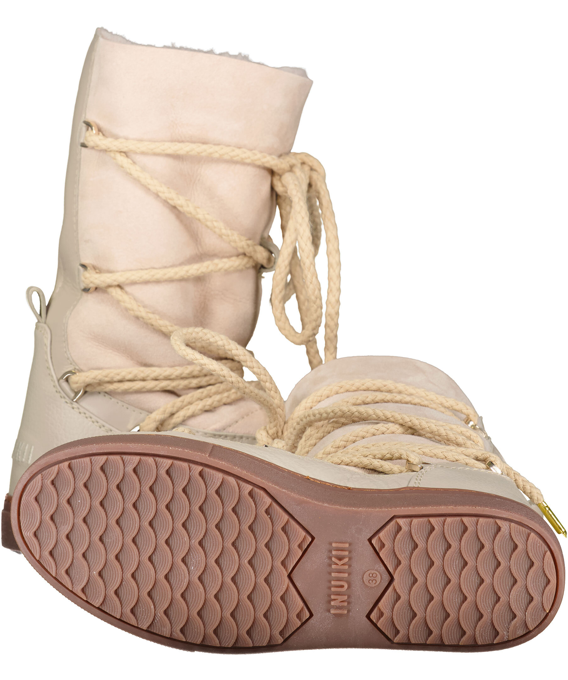 Beiga varmfodrade skor med högt skaft från Inuikii. Foder i fårskinn, yttermaterial i läder och sula i gummi. Rundad tå samt snörning fram. Broderad logotyp bak på hälen. Skorna är lite små i storleken, vi rekommenderar att gå upp en storlek.