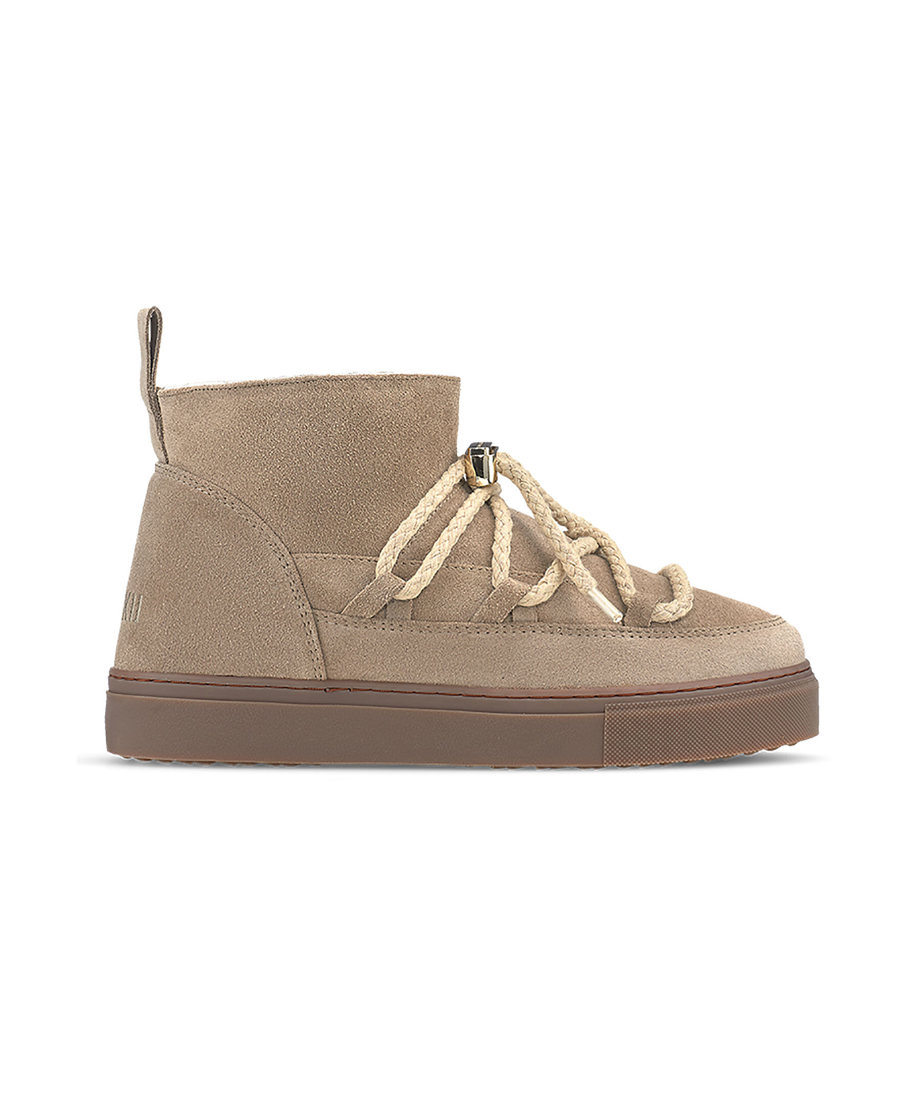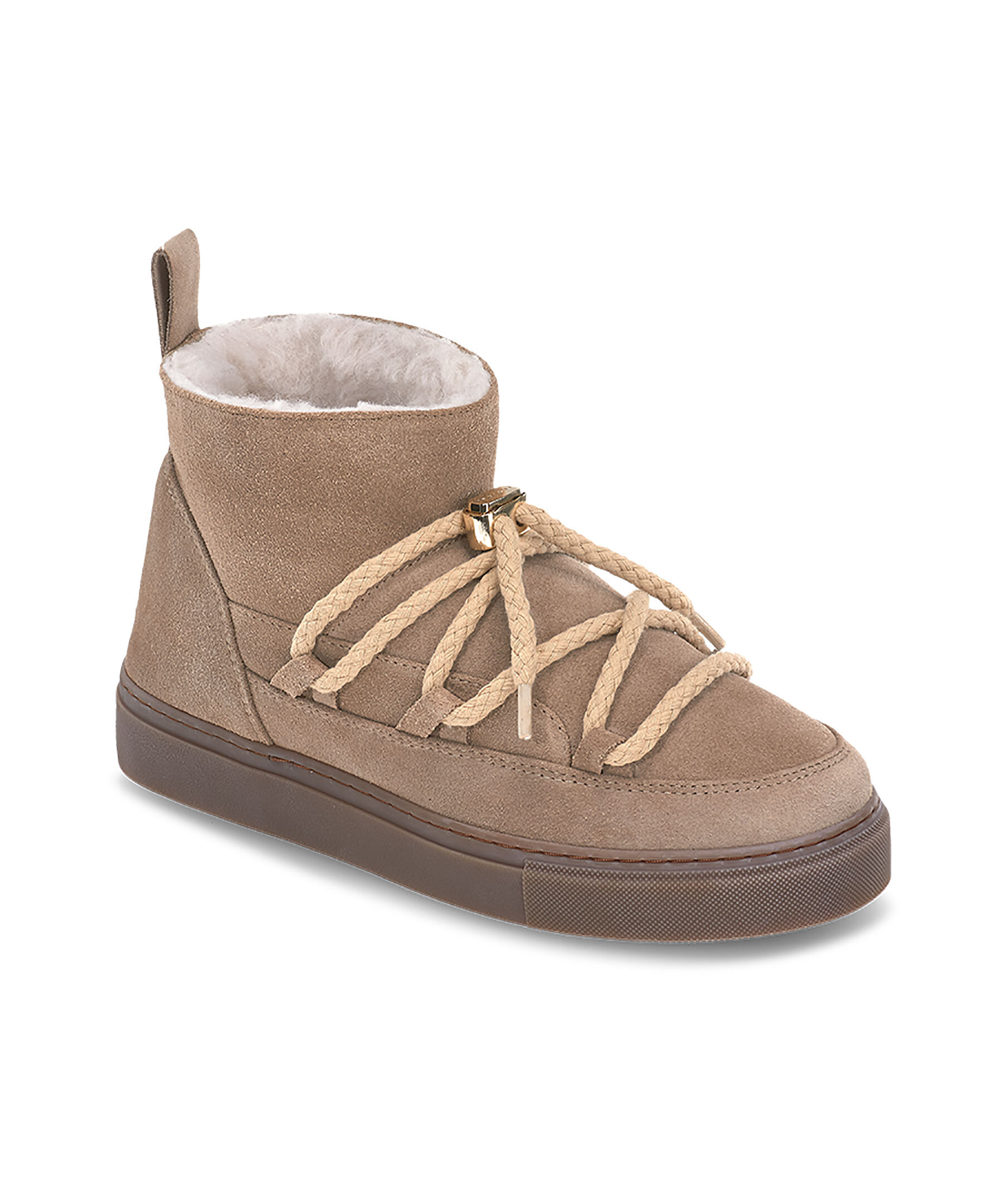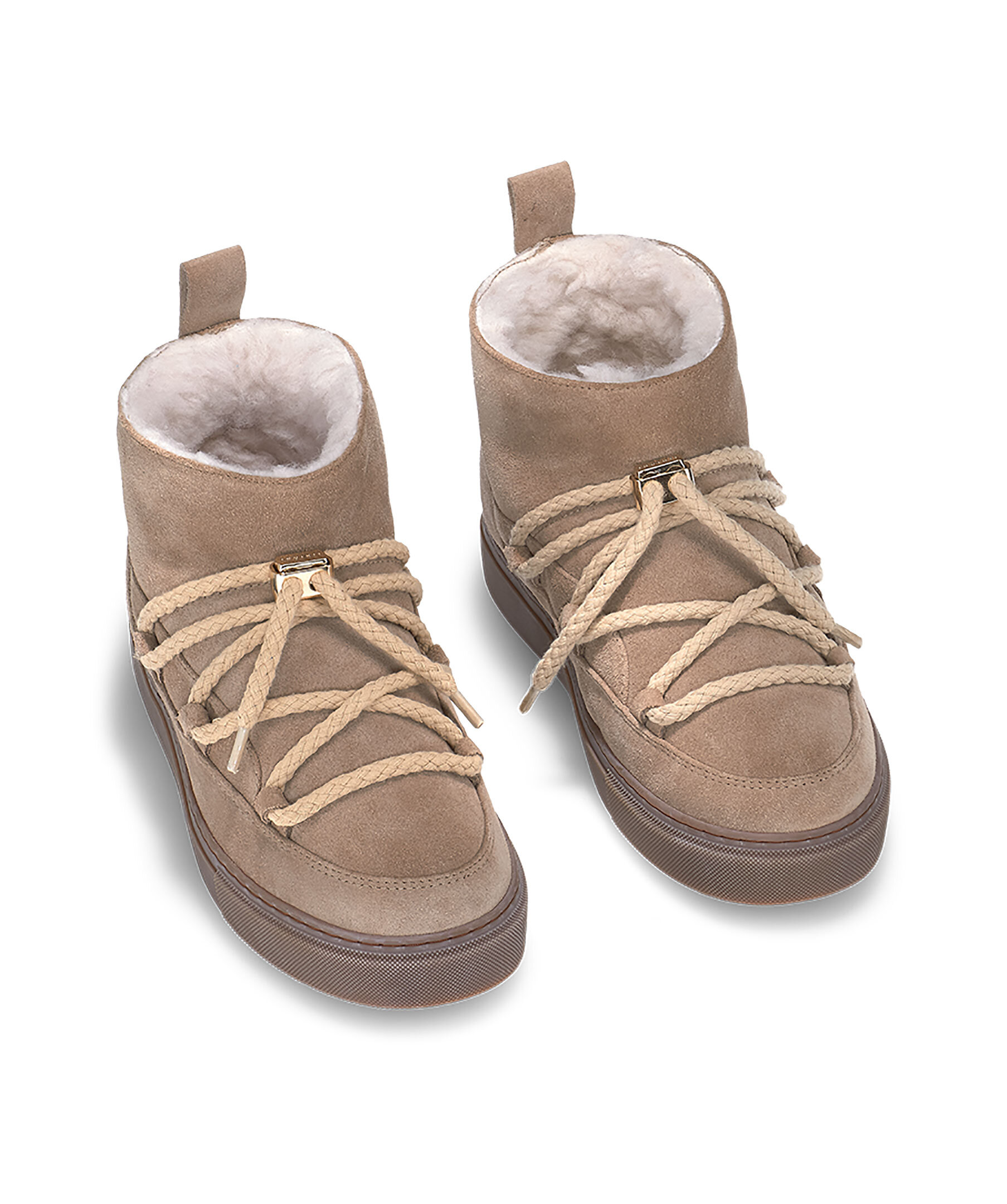 Beigea, varmfodrade skor från Inuikii med lägre skaft. Foder och yttermaterial i mockaläder och detaljer i läder. Sula i gummi. Rundad tå samt snörning fram. Broderad logotyp bak på hälen.