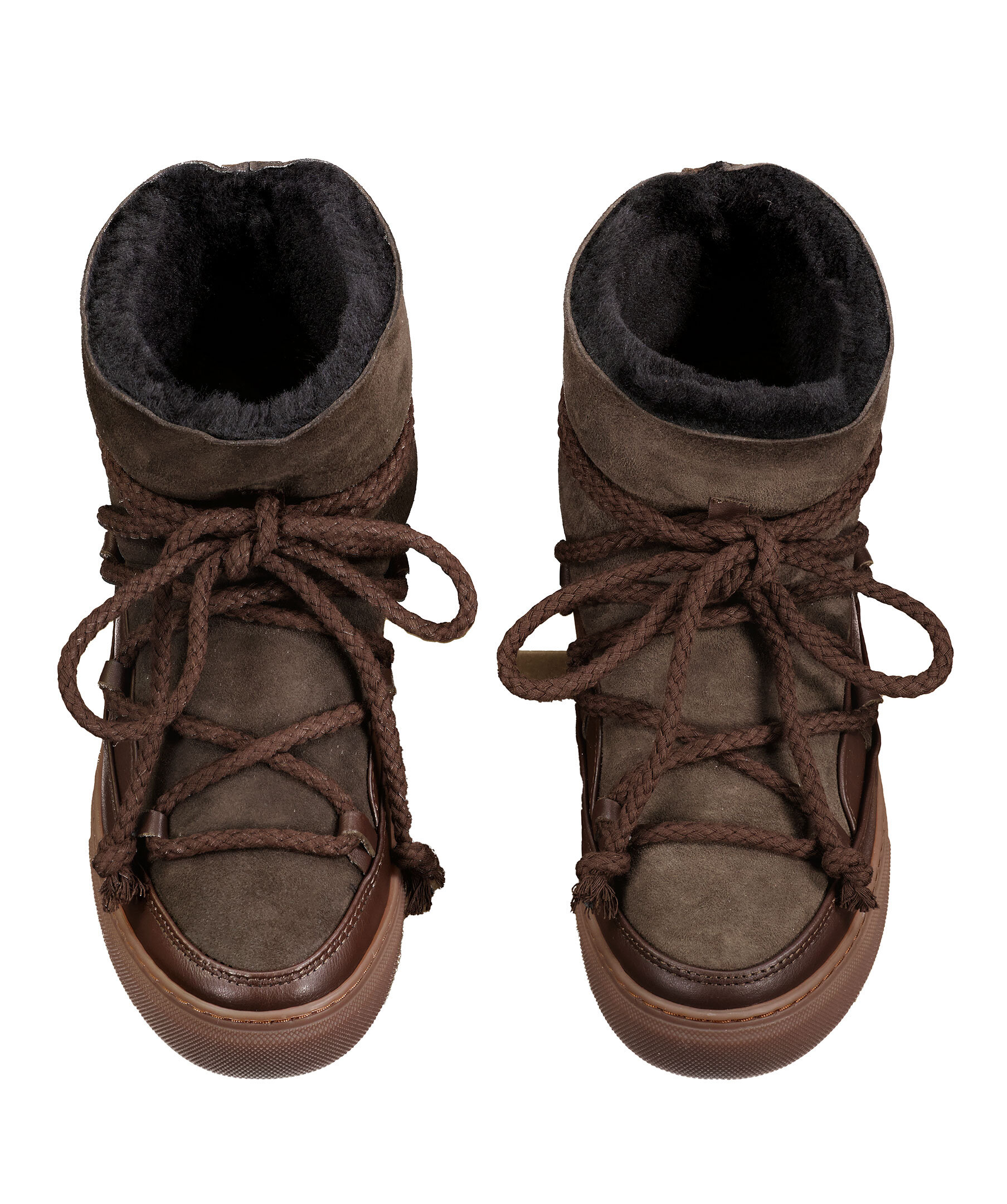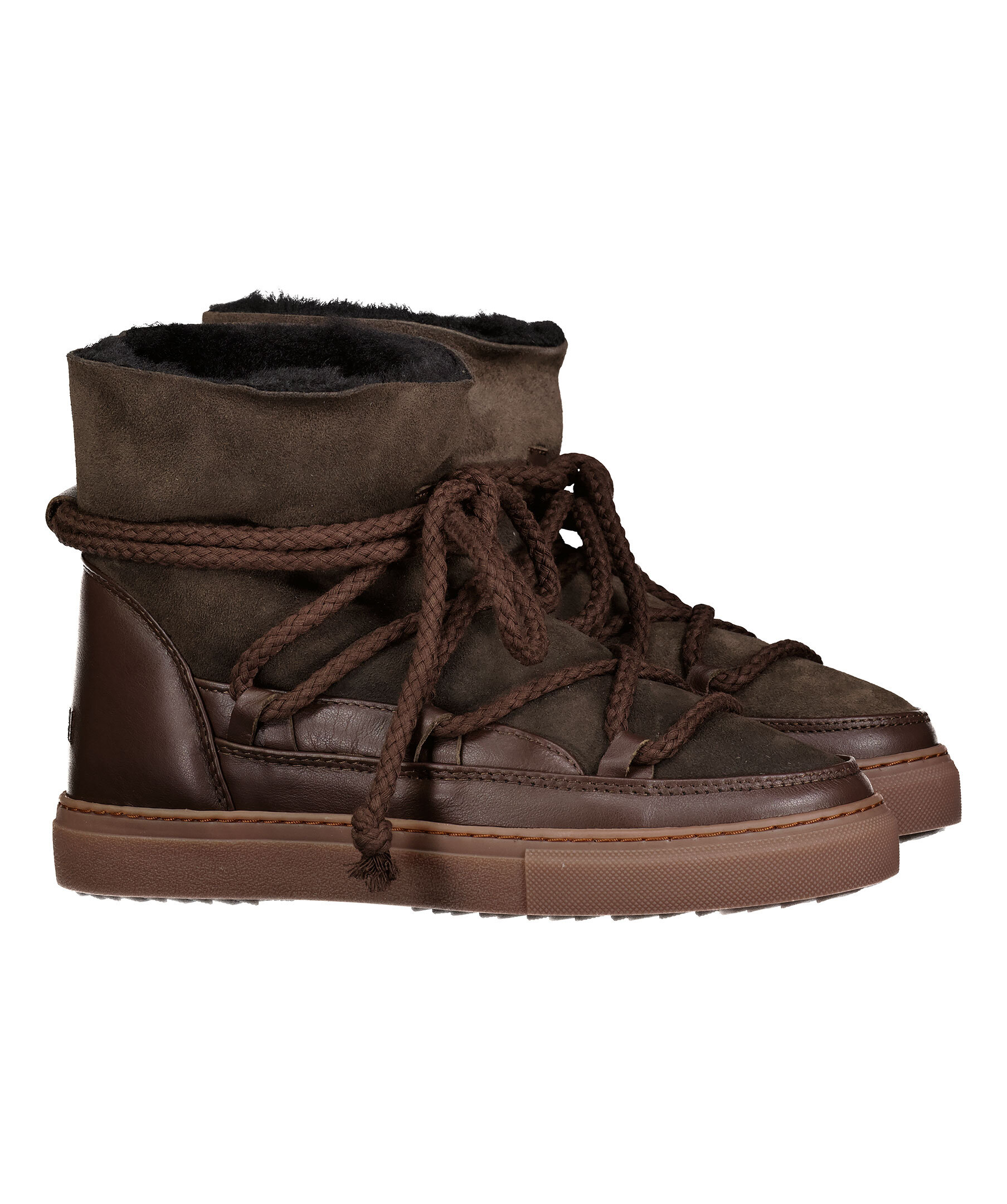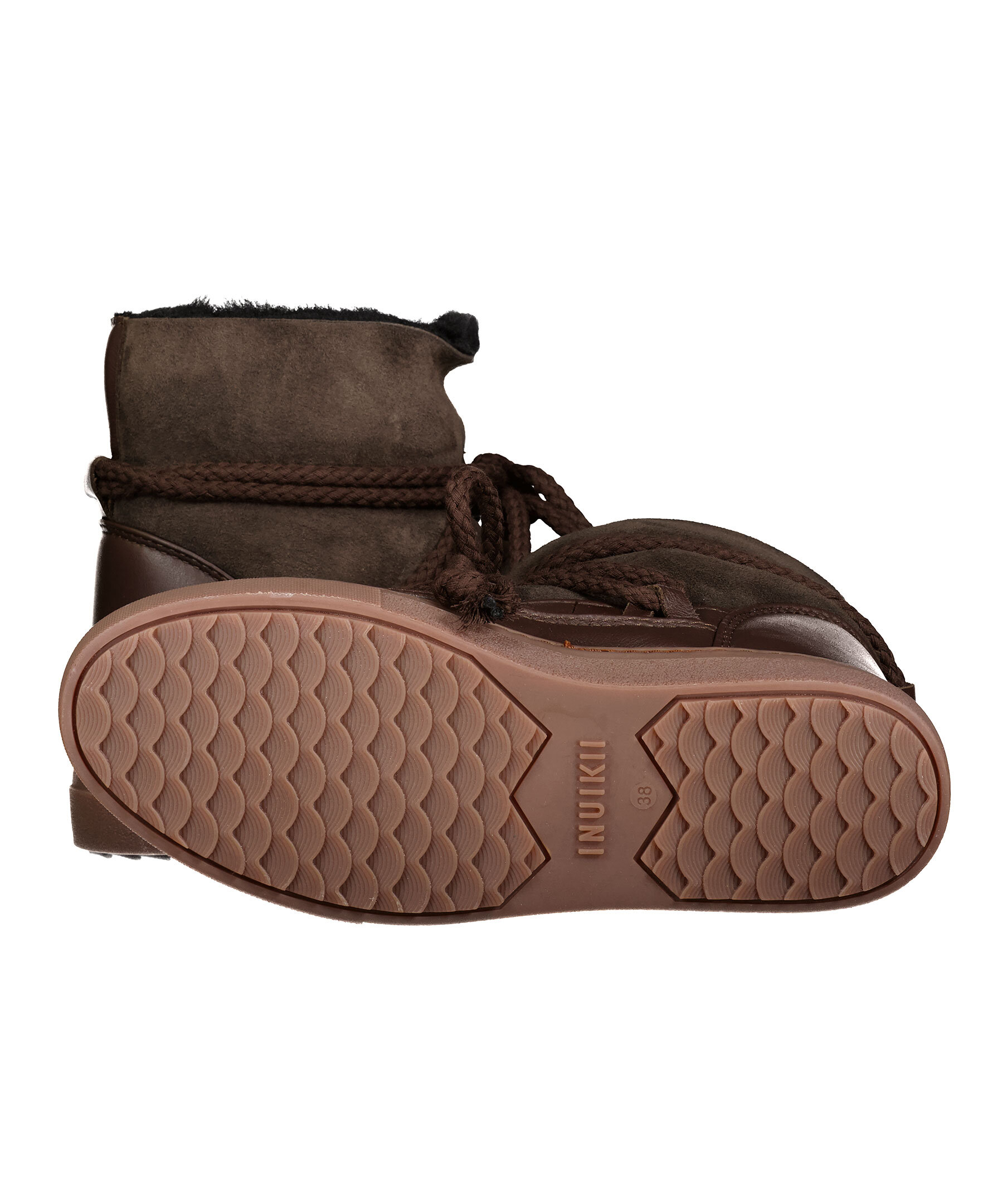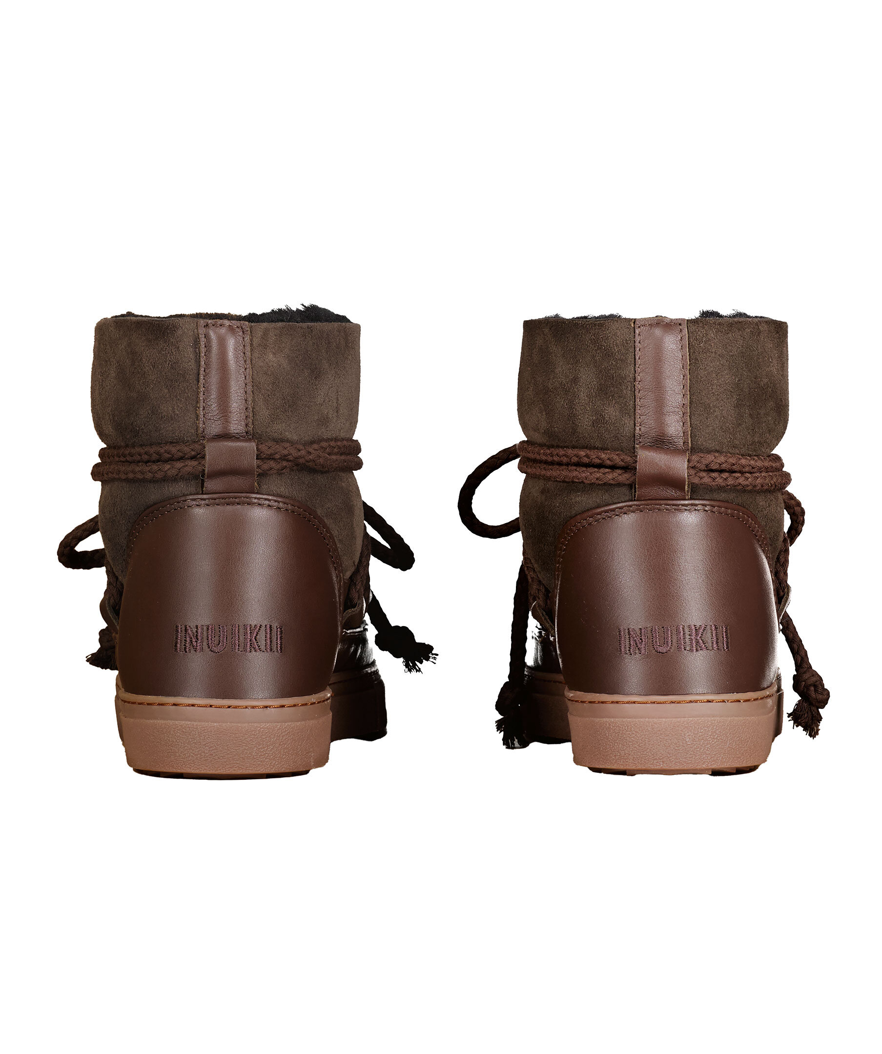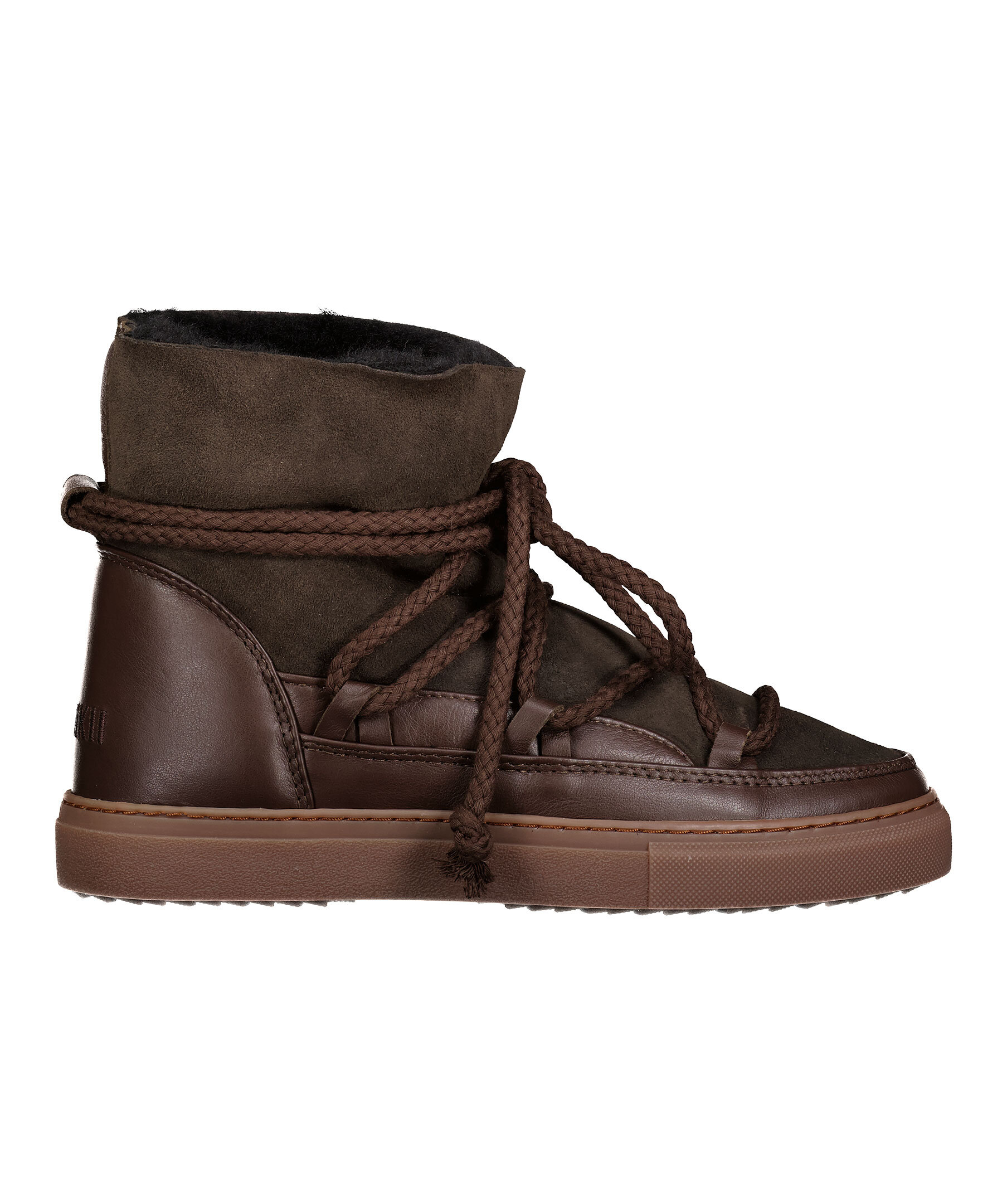 Mörkbruna, varmfodrade skor från Inuikii. Foder och yttermaterial i fårskinn, detaljer i läder och sula i gummi. Rundad tå samt snörning fram. Broderad logotyp bak på hälen. Skorna är lite små i storleken, vi rekommenderar att gå upp en storlek.