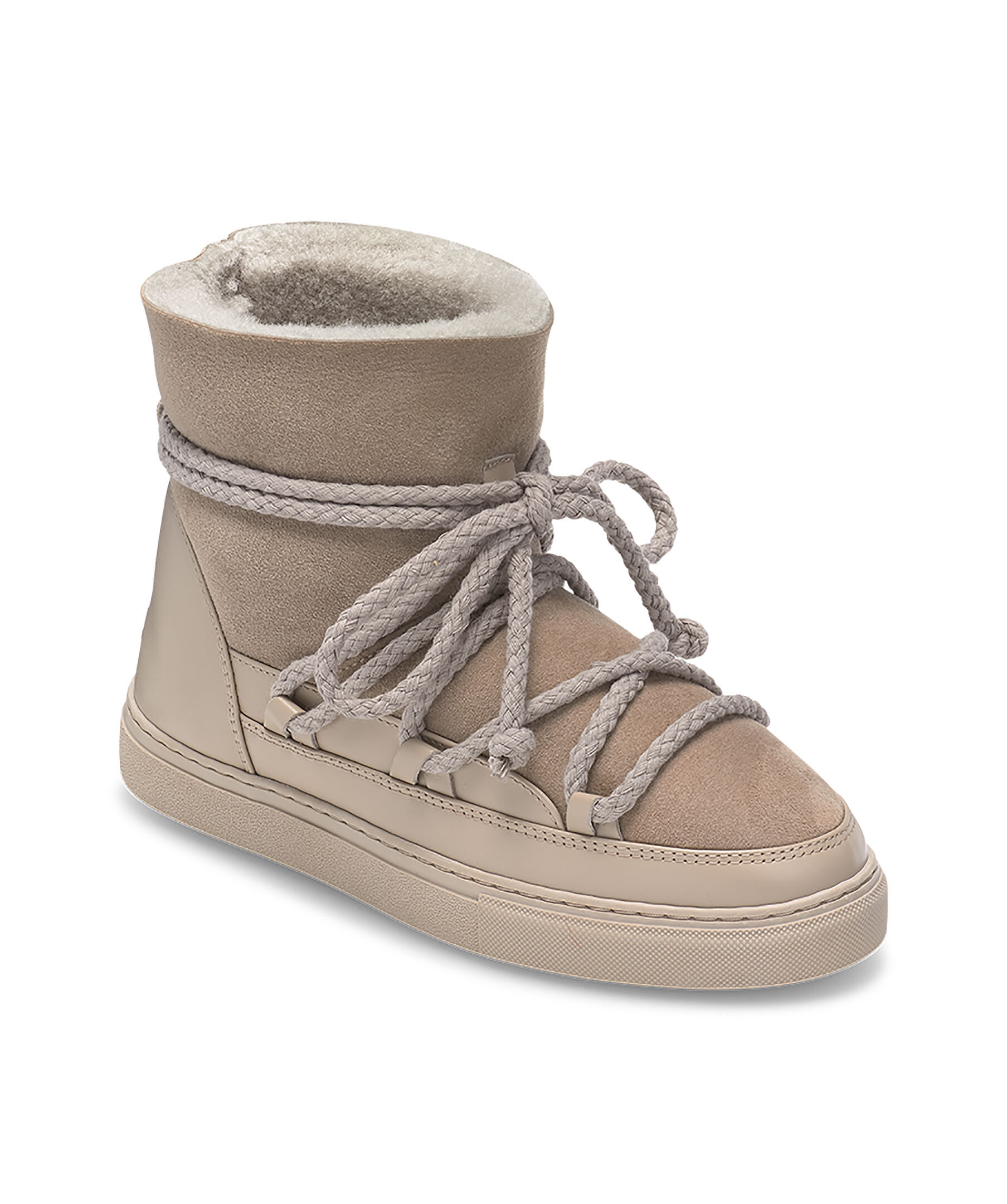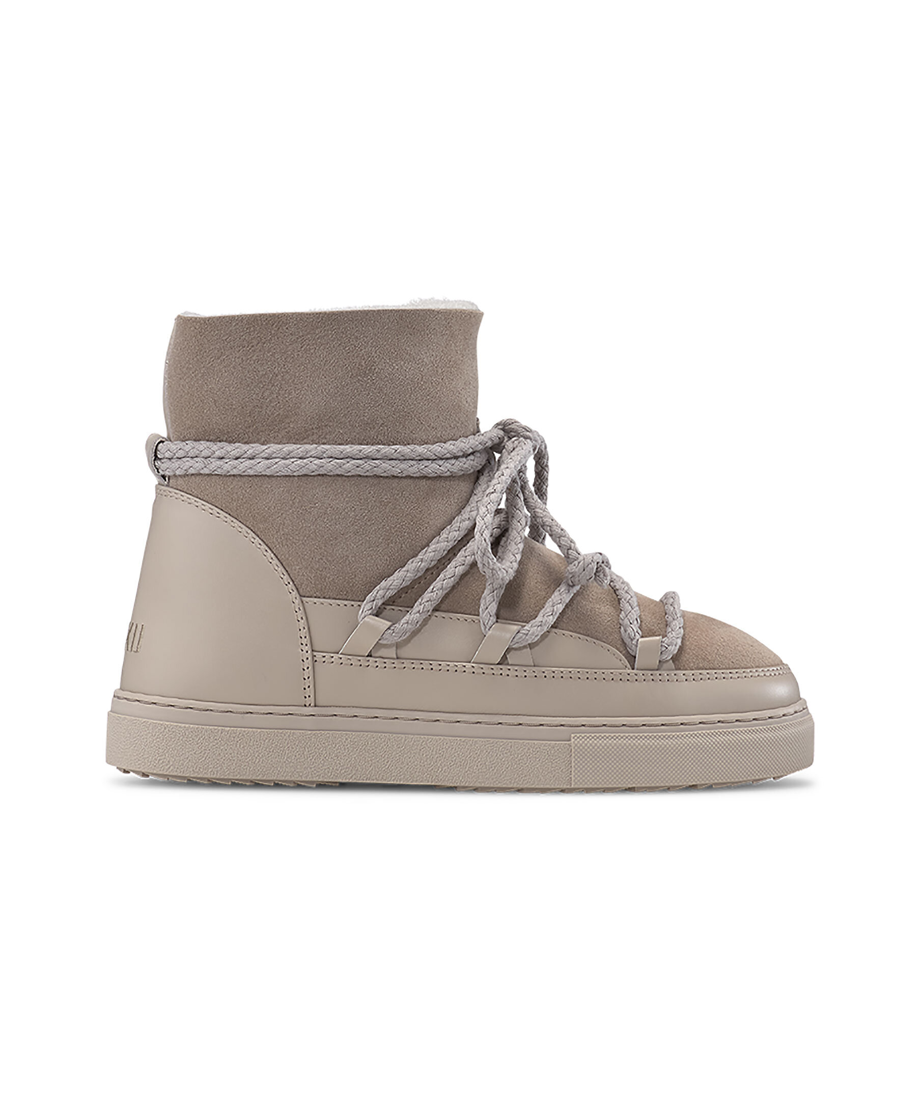 Gråa, varmfodrade skor från Inuikii. Foder och yttermaterial i fårskinn och detaljer i läder. Sula i gummi. Rundad tå samt snörning fram. Broderad logotyp bak på hälen.