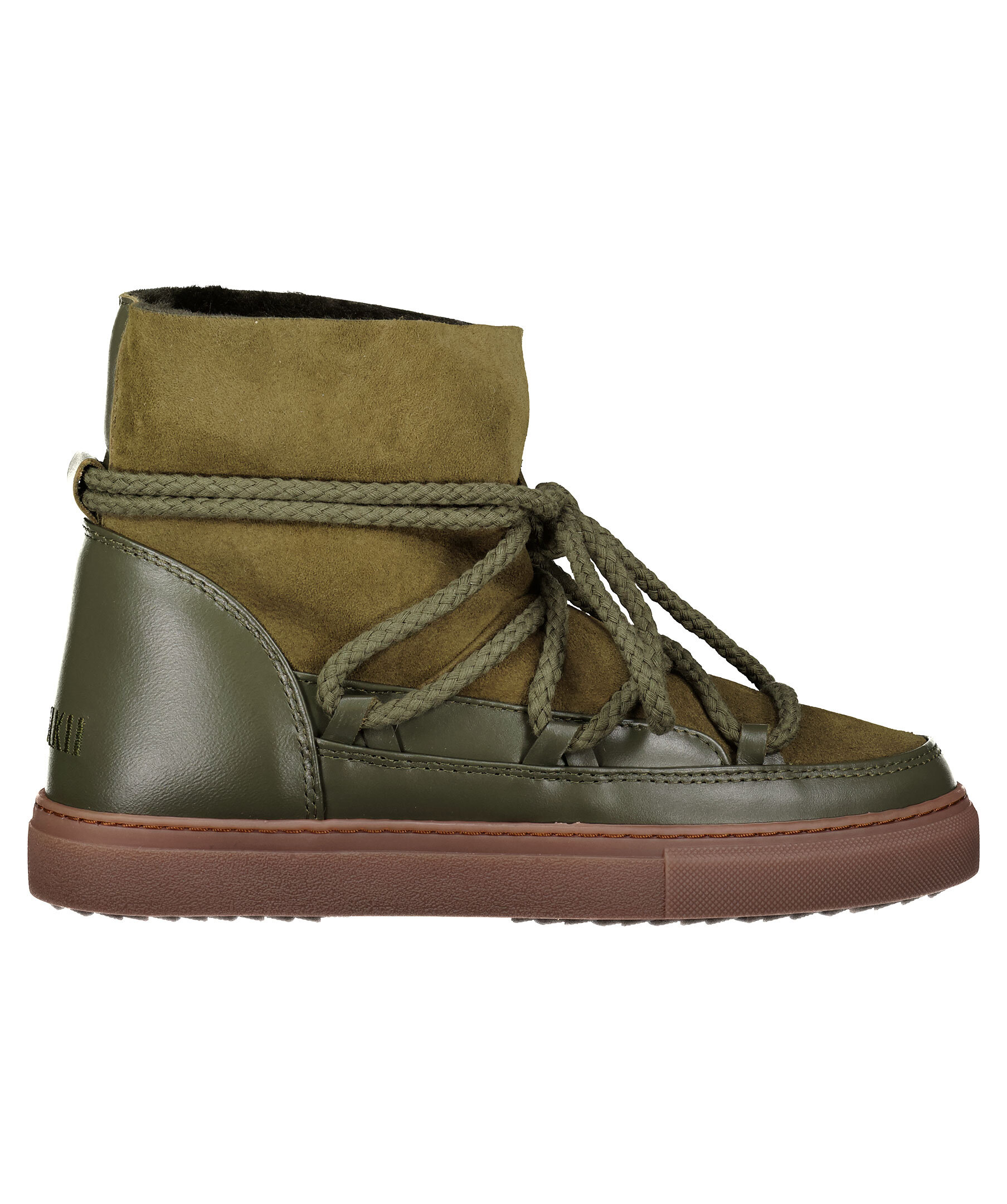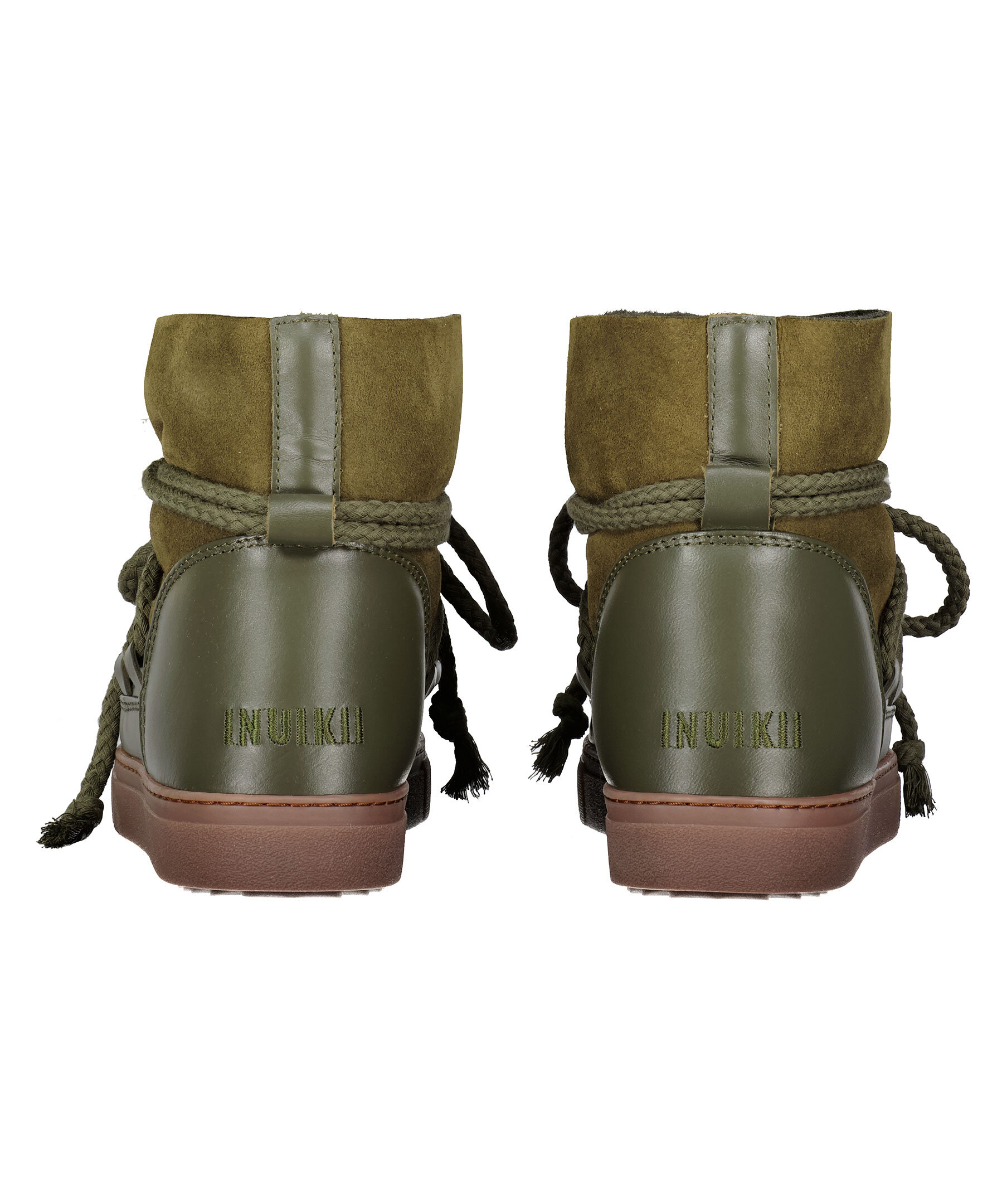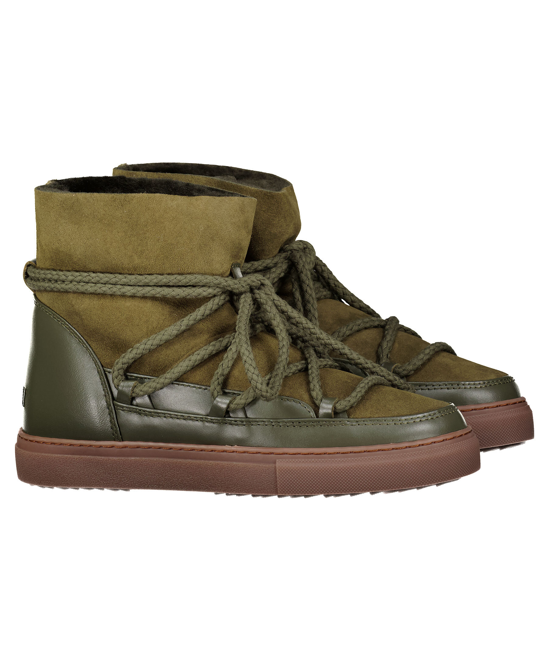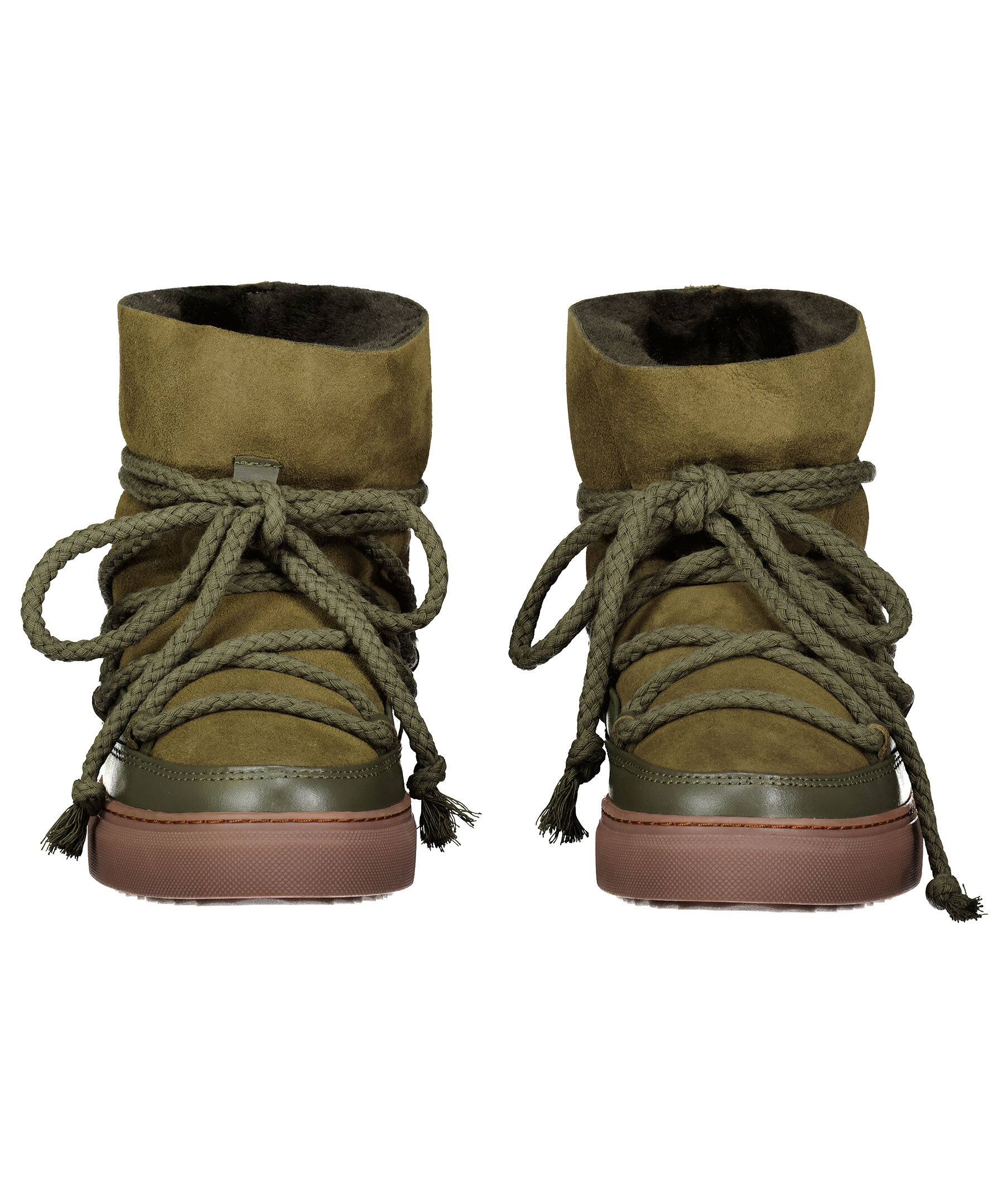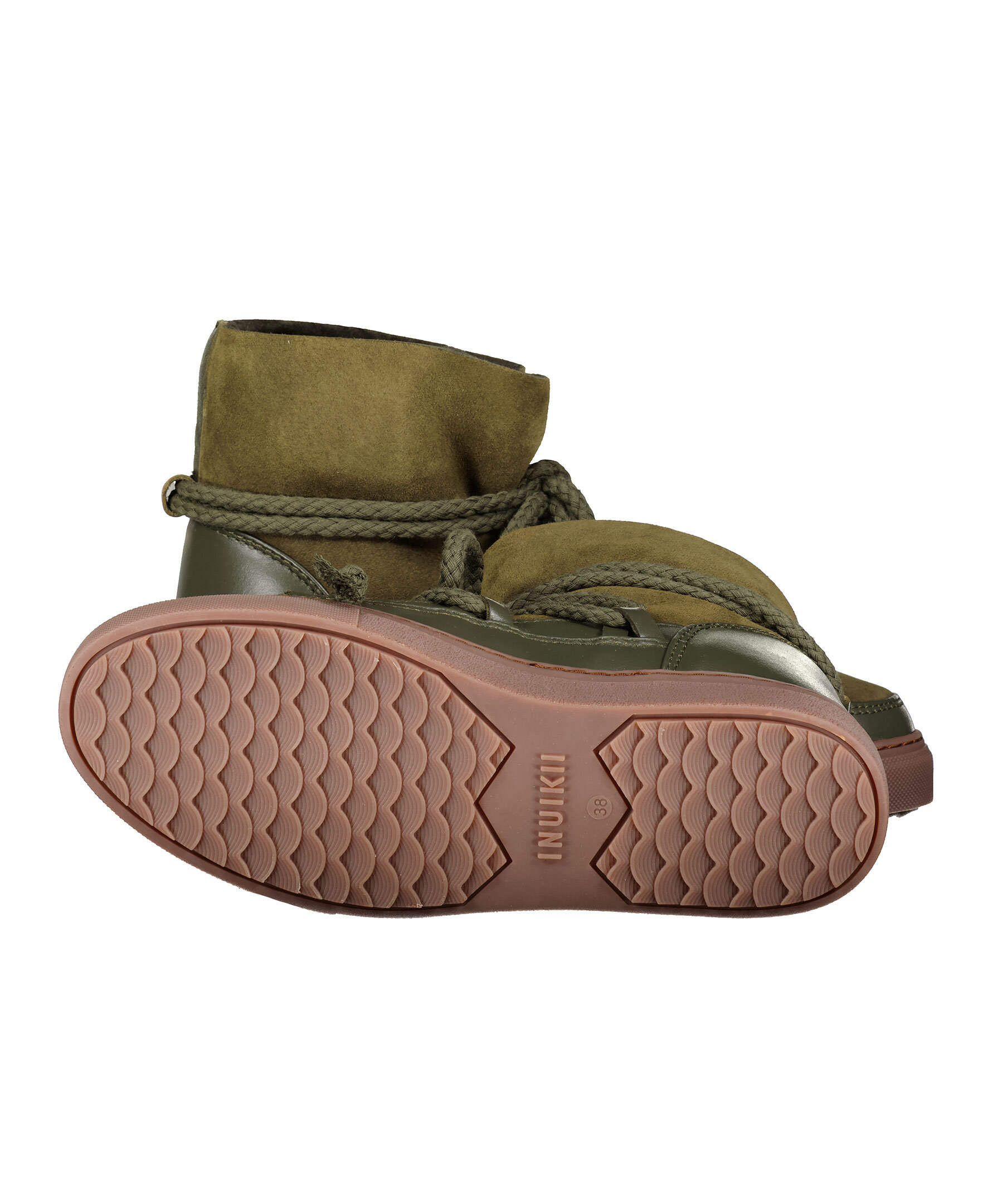 Skogsgröna, varmfodrade skor från Inuikii. Foder i fårskinn, yttermaterial i läder och sula i gummi. Rundad tå samt snörning fram. Broderad logotyp bak på hälen. Skorna är lite små i storleken, vi rekommenderar att gå upp en storlek.