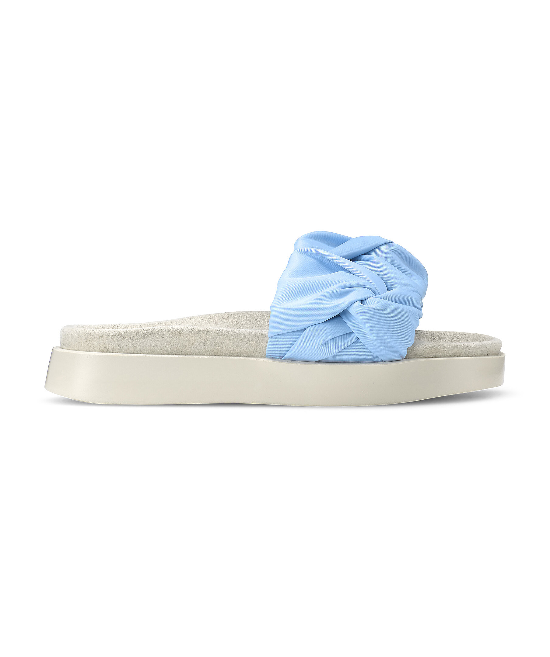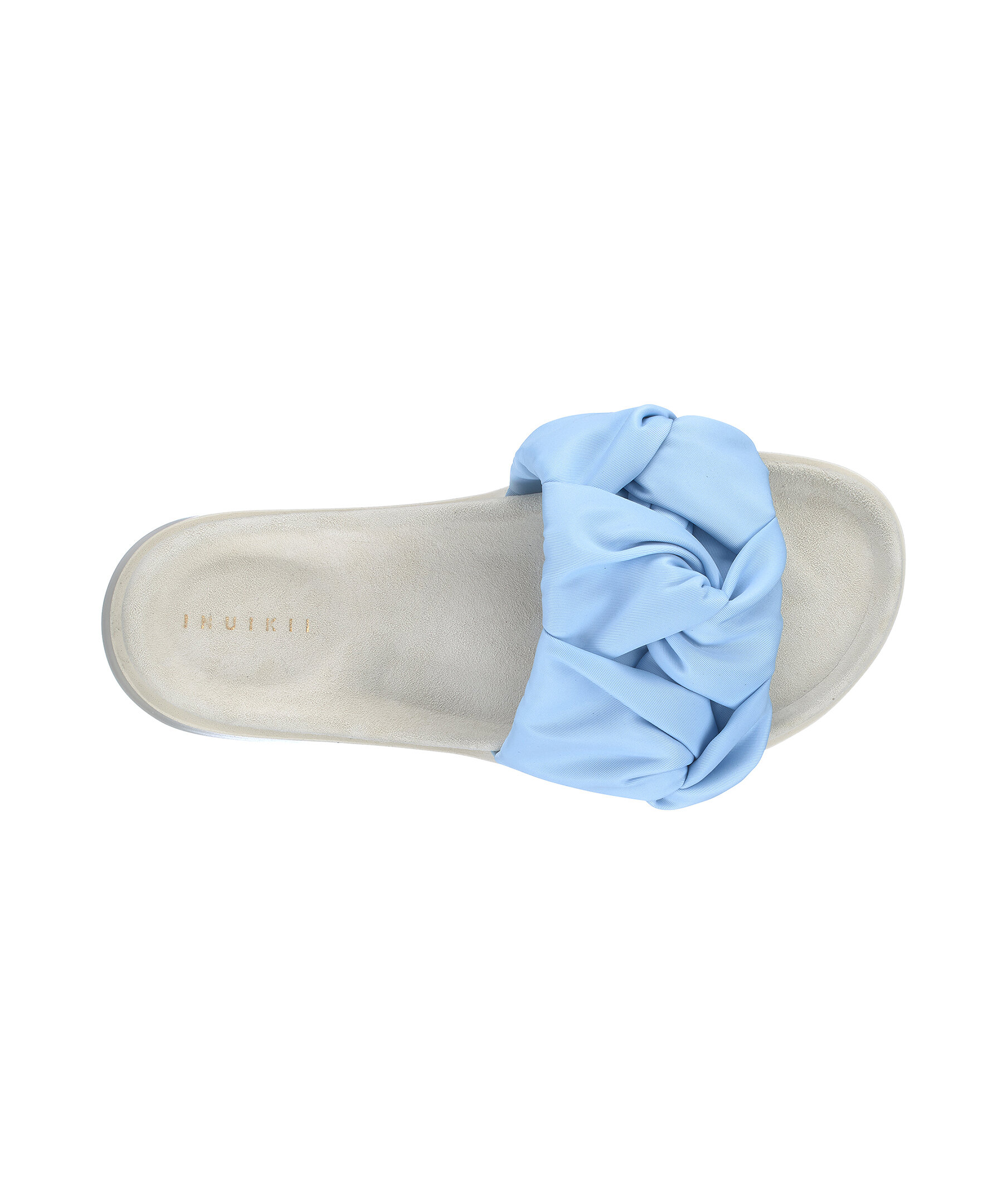 Beigea och ljusblåa slip-in tofflor från Inuikii. Lekfull men tidlös ovandel i ljusblått. Perfekt sommartoffel. Normal passform.