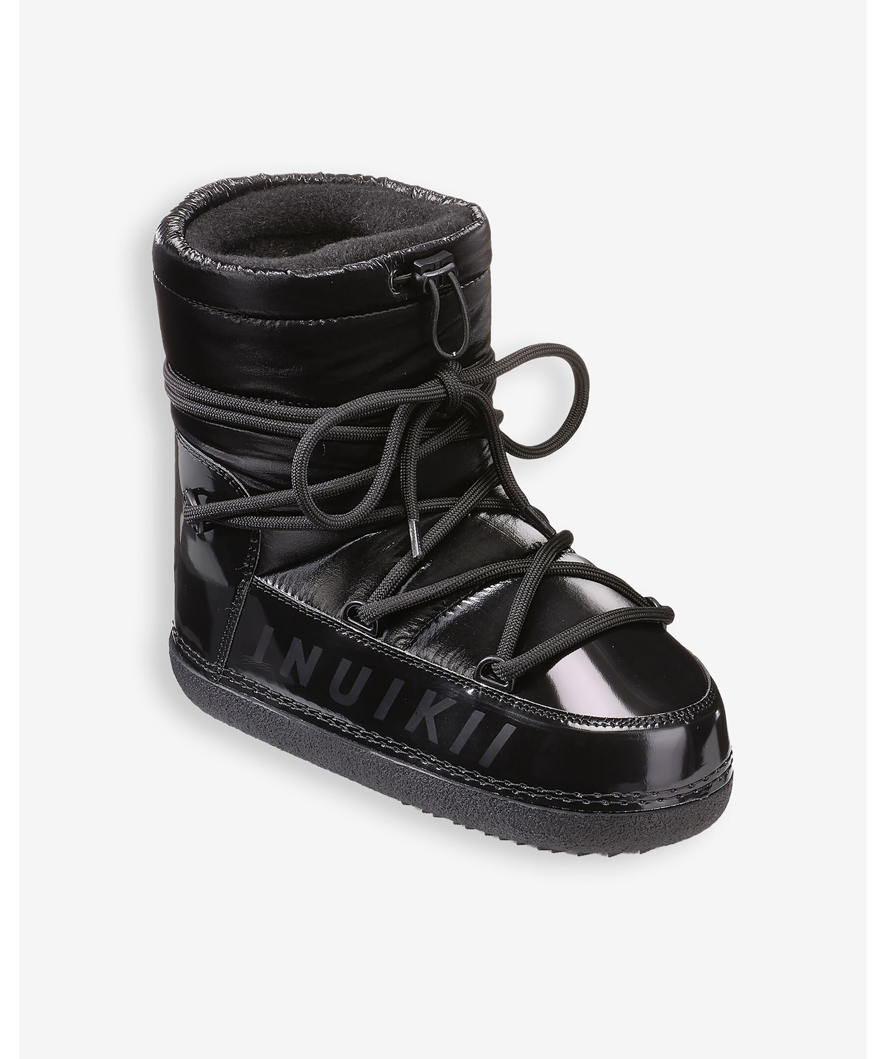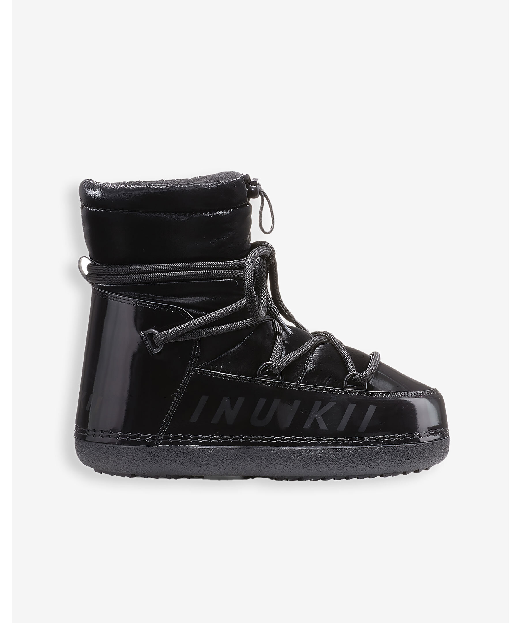 Svart varmfodrade skor från Inuikii. Bootsen har ett glansigt yttre med snörning och en smart dragsko vid skons öppning. Diskret logotyp på skons ena sida och vid hälen.