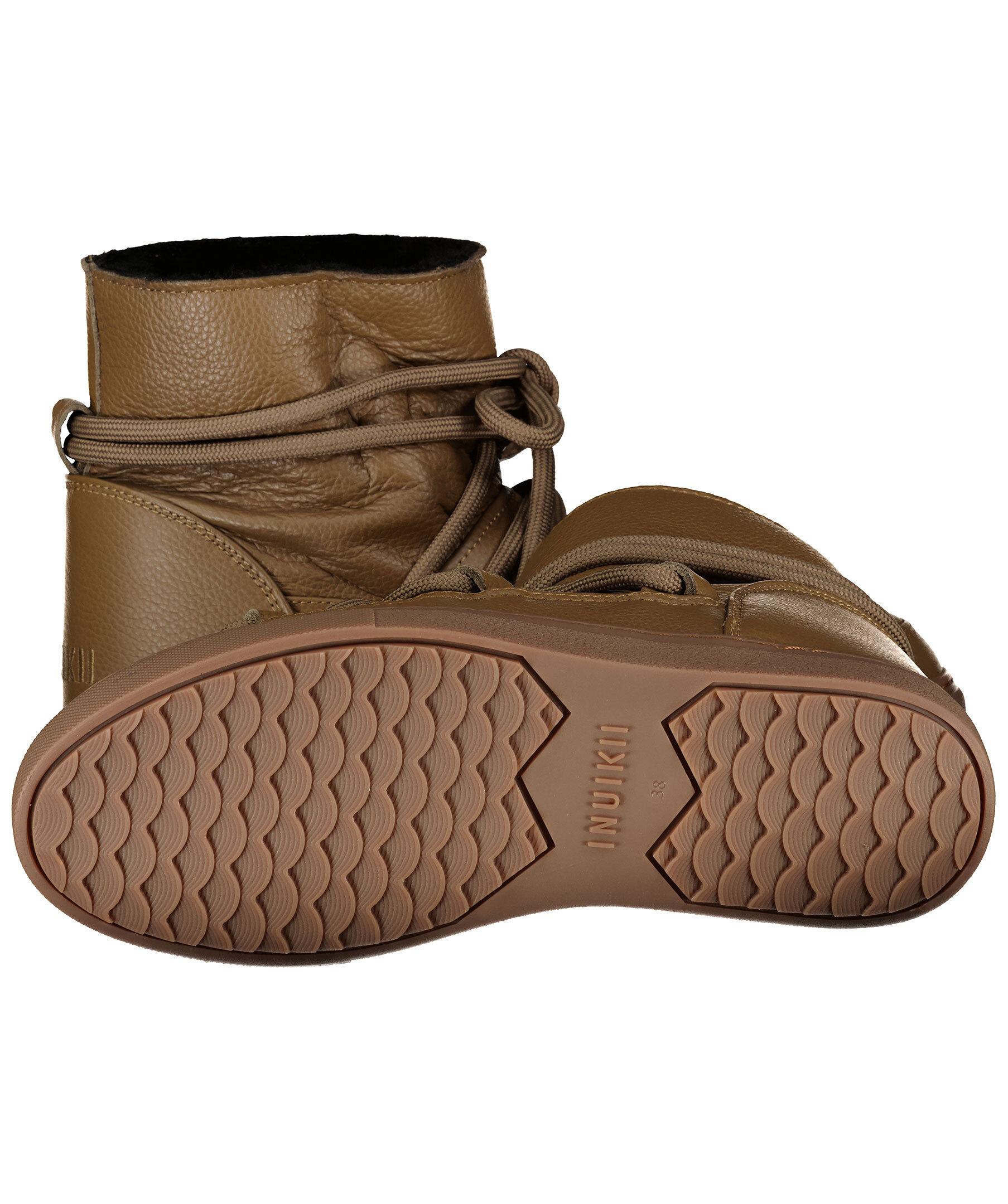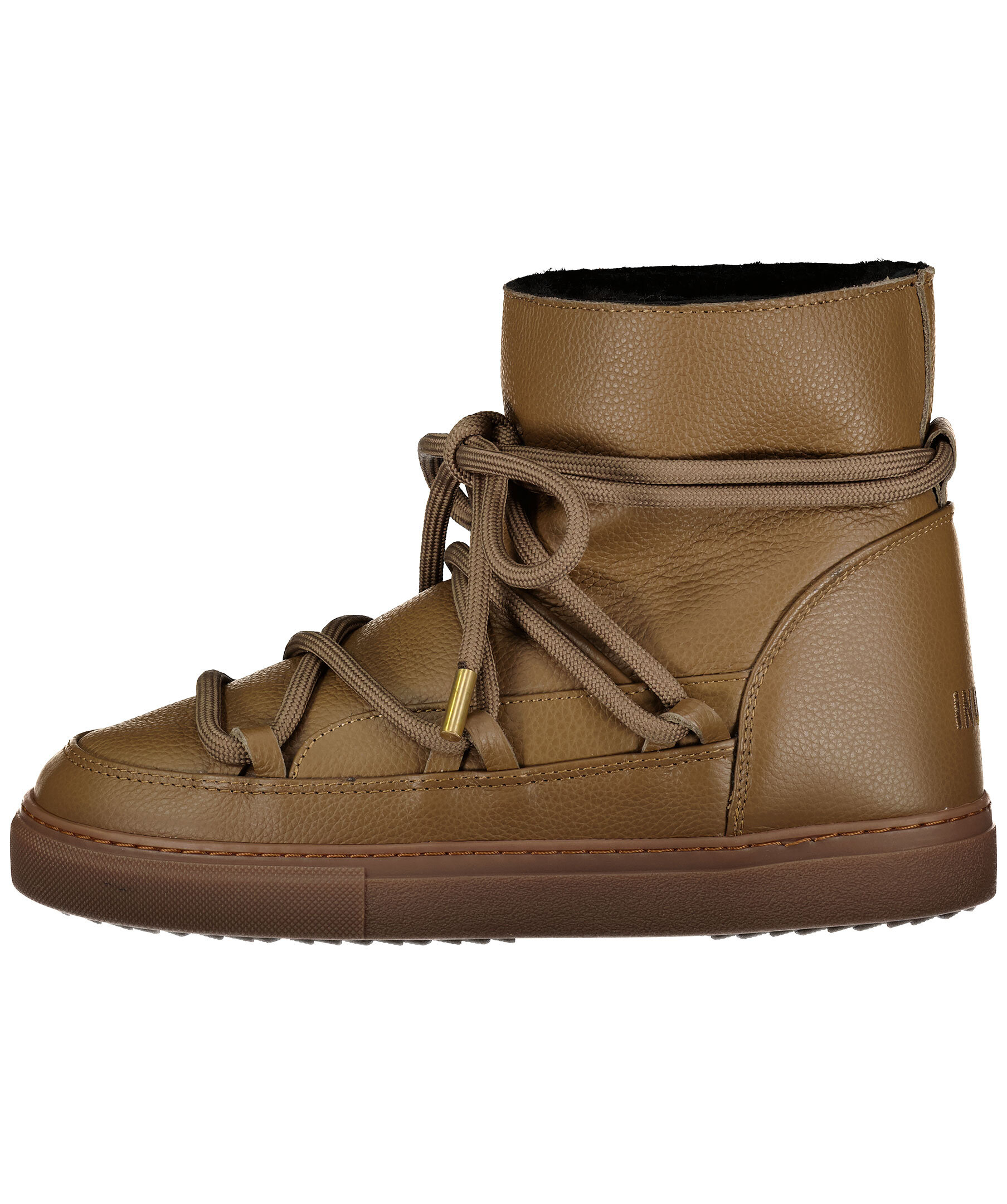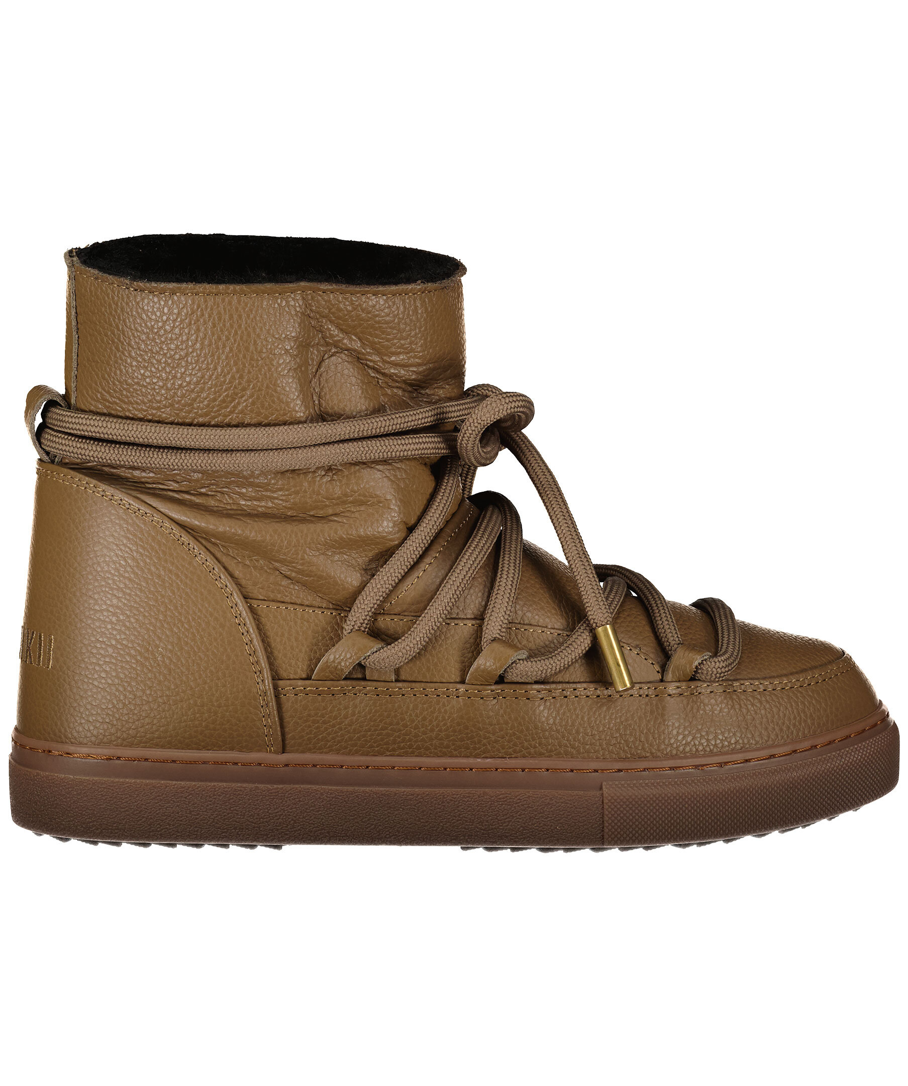 Bruna, varmfodrade skor från Inuikii. Foder i fårskinn, yttermaterial i läder och sula i gummi. Rundad tå samt snörning fram. Broderad logotyp bak på hälen. Skorna är lite små i storleken, vi rekommenderar att gå upp en storlek.