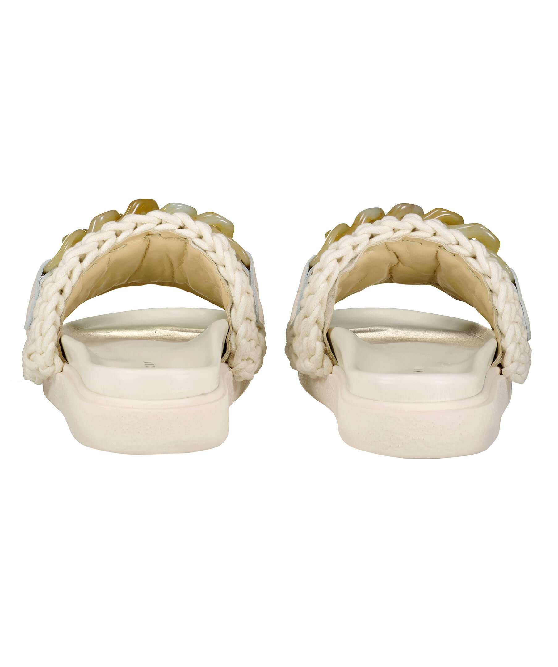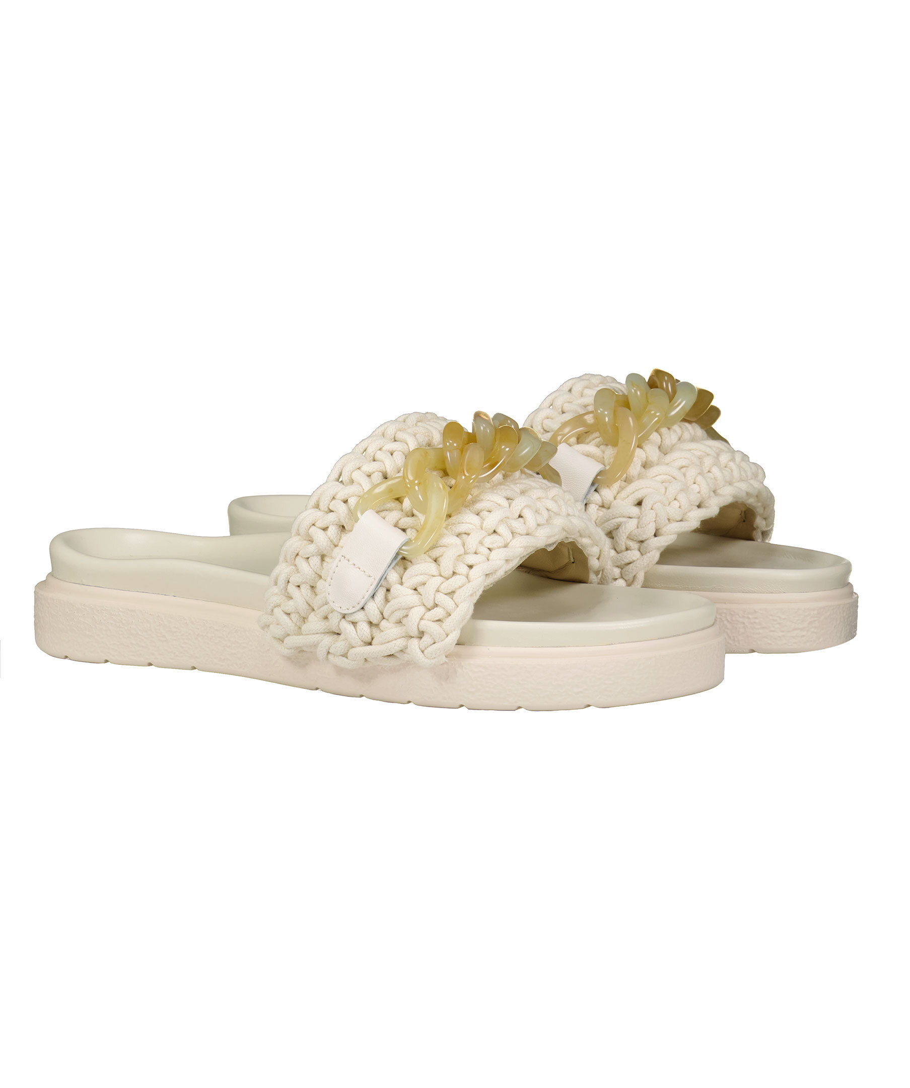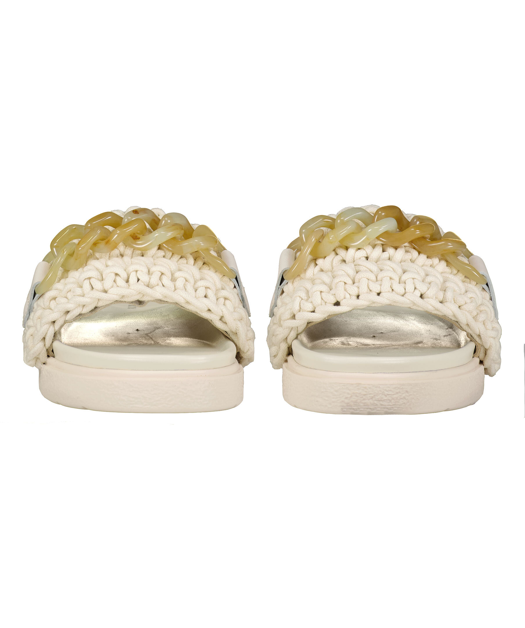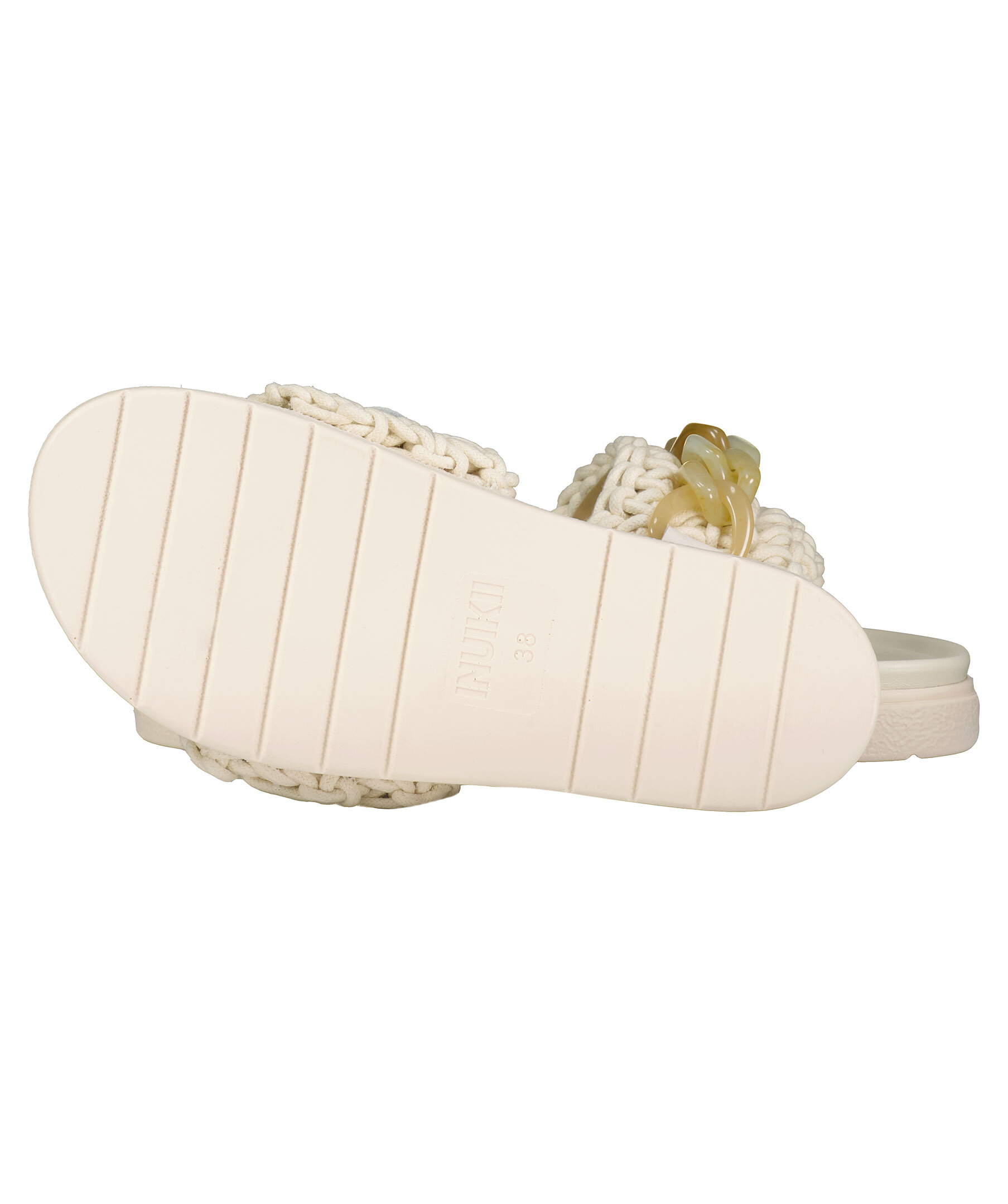 Benvita virkade tofflor från Inuikii. Bred, beige kedja i plast över foten och insida klädd i skinn för skön komfort. Kraftig benvit gummisula.