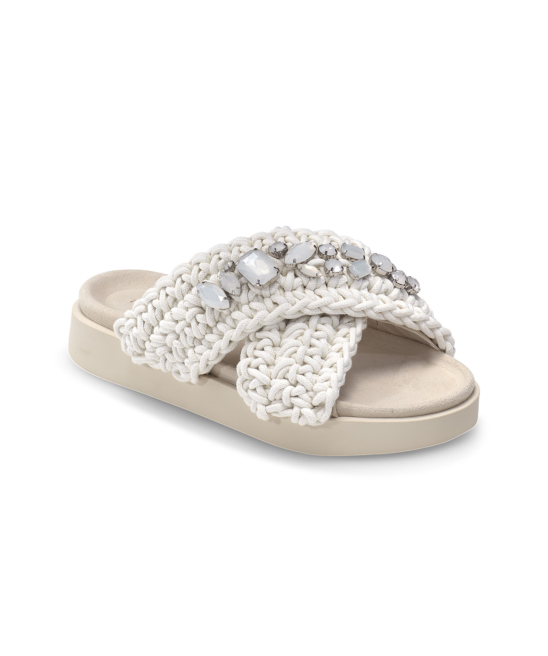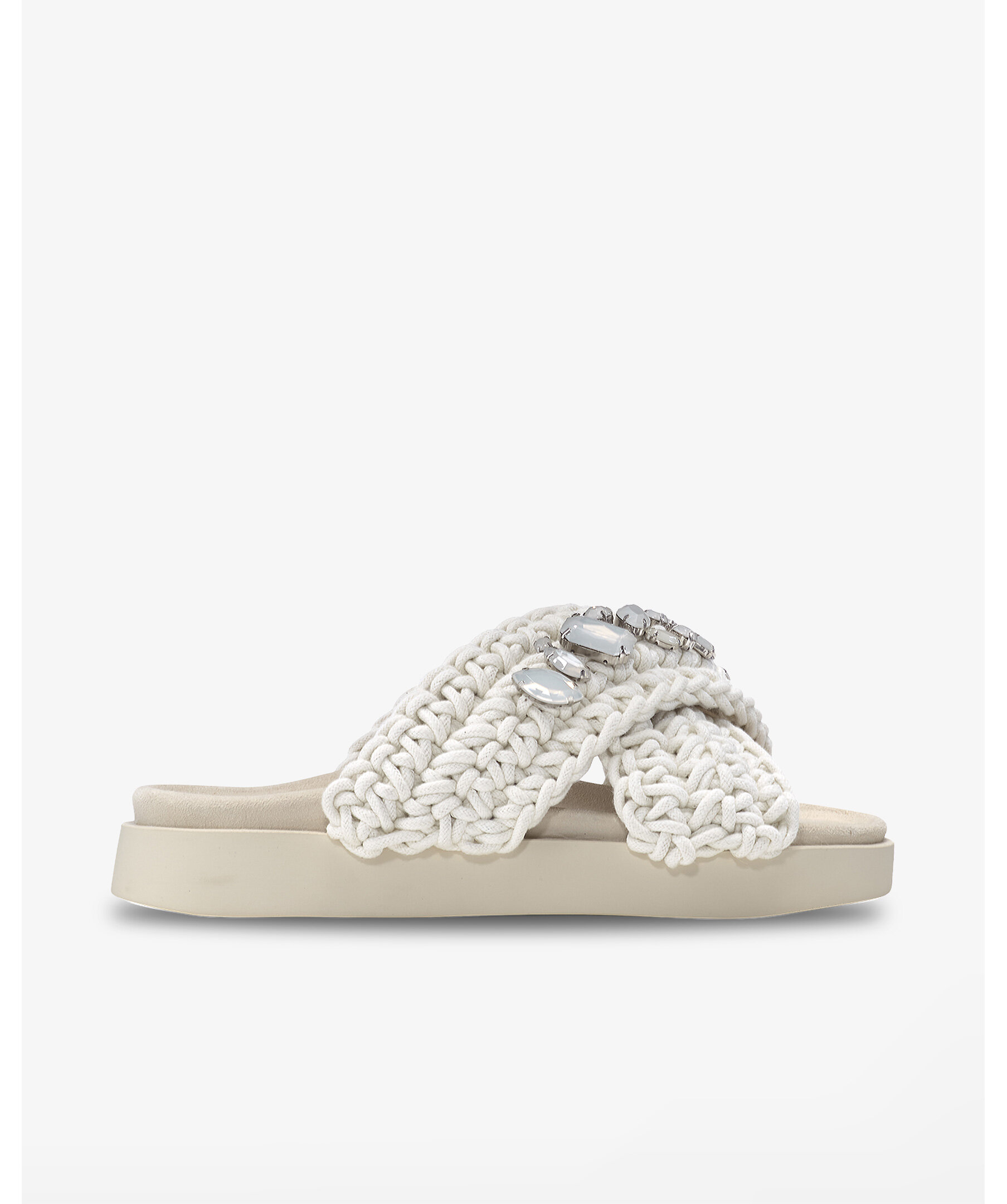 Ikoniska sandaler från Inuikii. Handvävda bomullsremmar i ivory med glittrande vita ädelstenar som skapar en balans mellan okonventionell stil och lyx. Foder och innersula i skinn som skapar optimal komfort under varma sommardagar. Lätt och dämpande yttersula i PU. Inuikii Woven sandaler är designade i Schweiz och handgjorda i Europa.