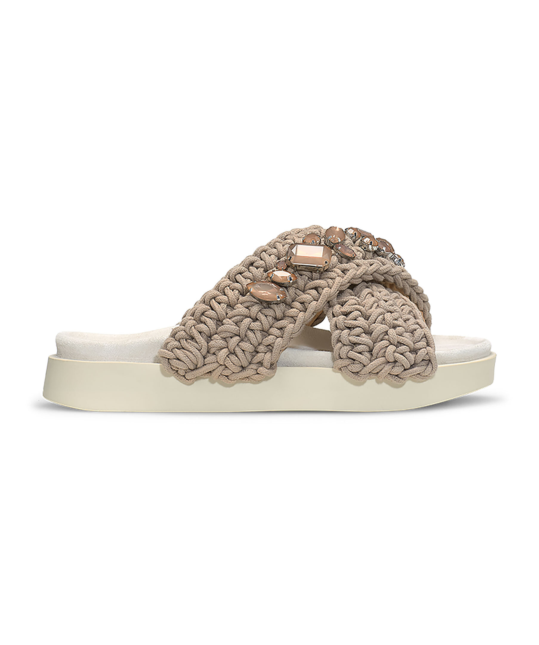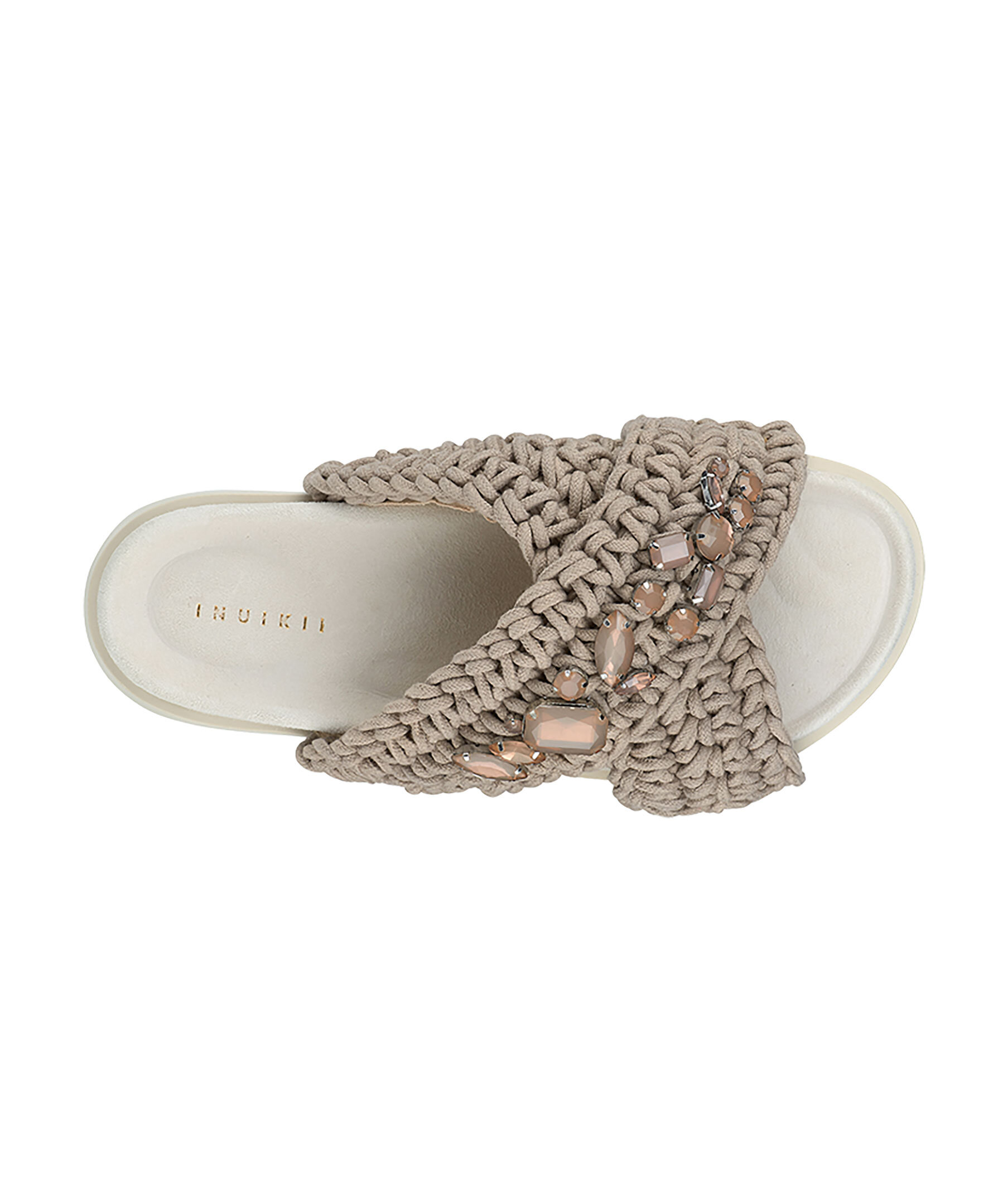 Bruna virkade tofflor med gummisula från Inuikii. Bruna stenar pryder de virkade banden som krosas över foten, vilket ger den perfekta balansen mellan bohem och glam. Rund öppen tå och foder i mocka.