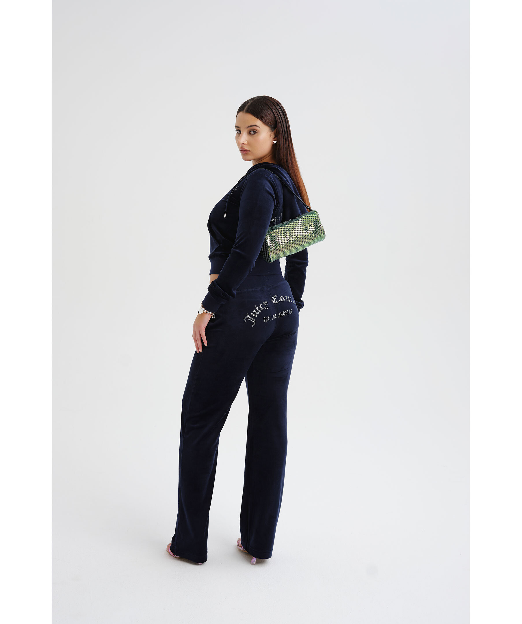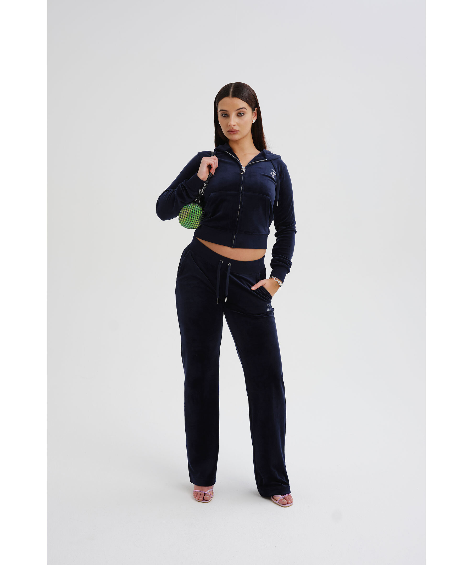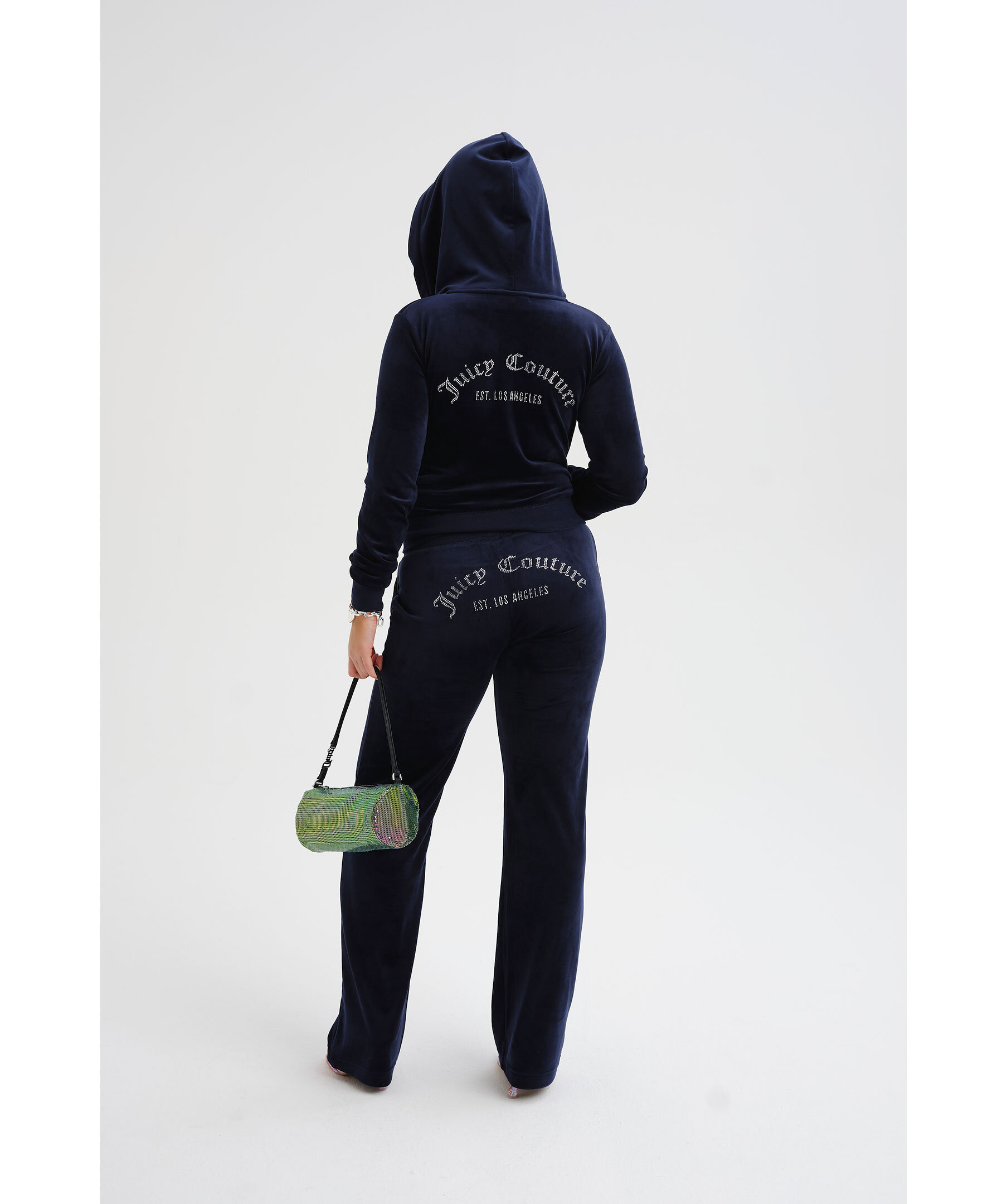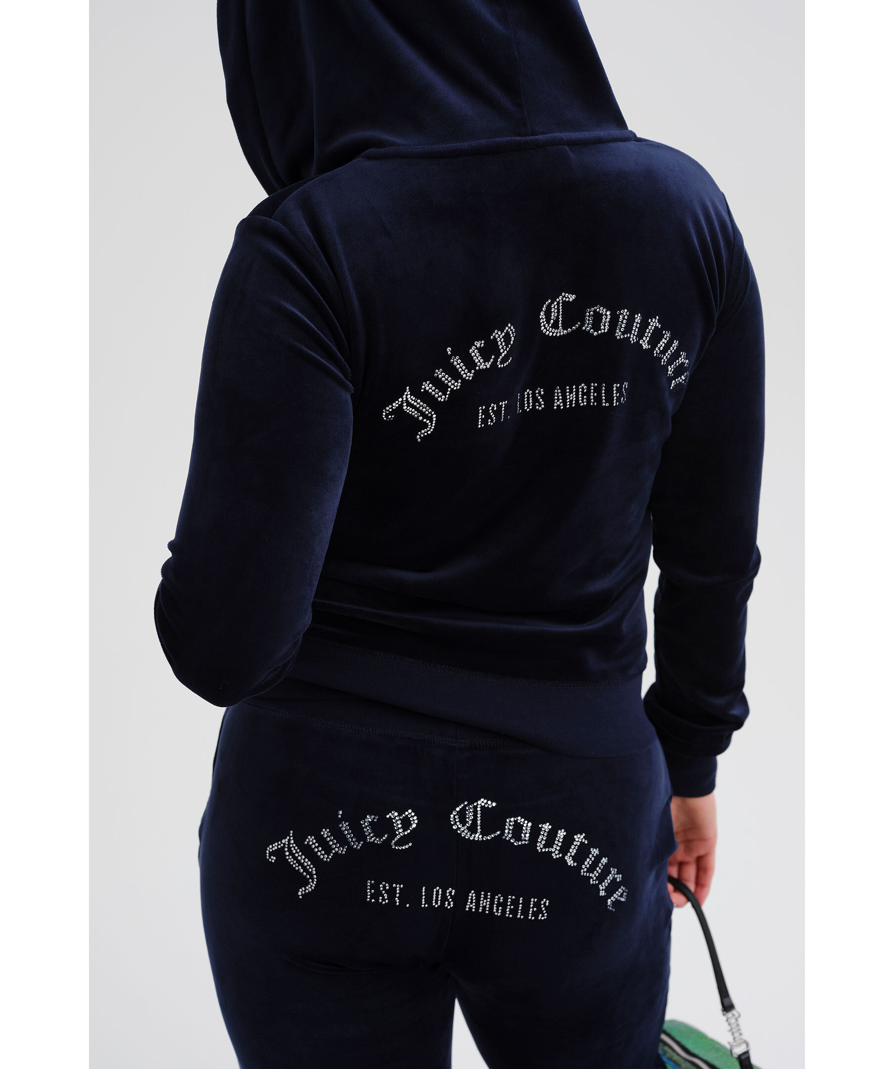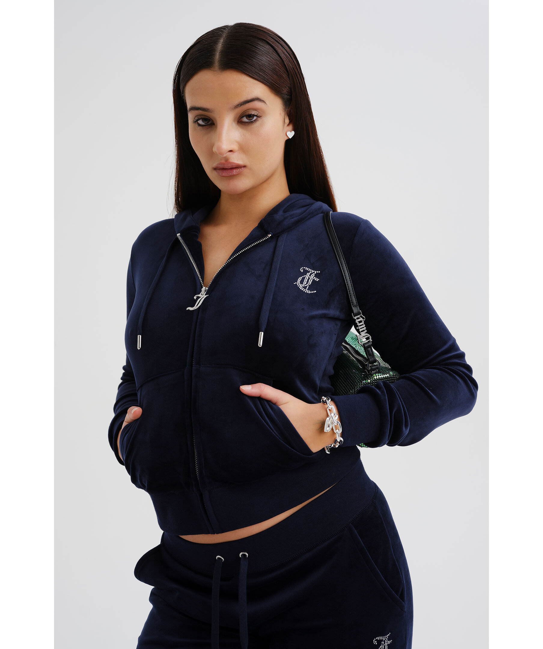 Mörkblå hoodie med strass logotyp på vänster bröst samt ryggen. Dragkedja fram i velour från Juicy Couture. Bred mudd i plaggslut och i ärmslut, broderad logotyp i ton-i-ton på bröstet på vänster sida. Snörning i luvan och fickor fram.