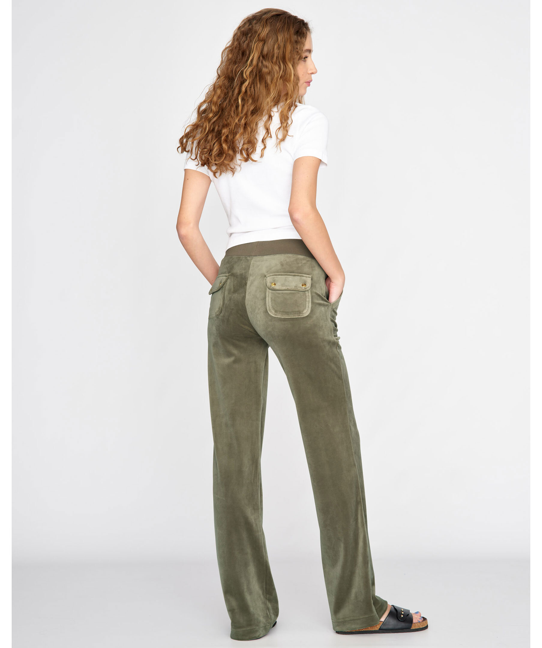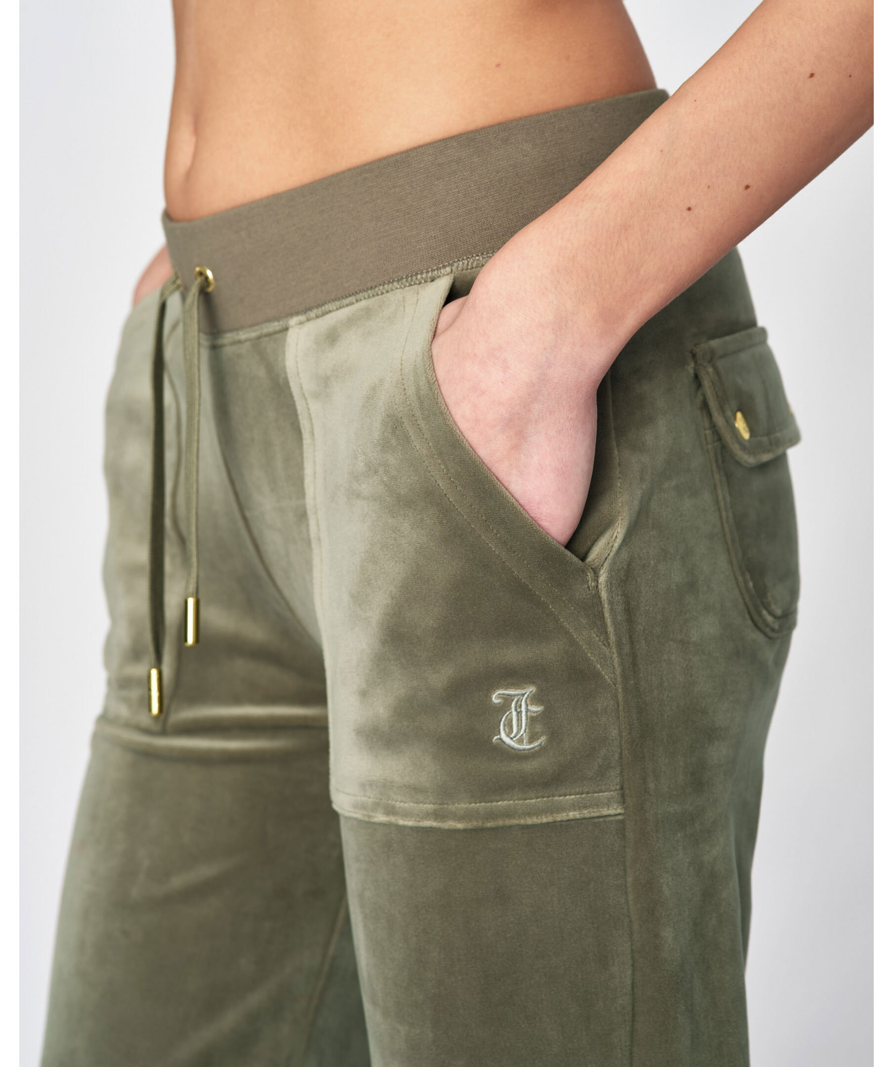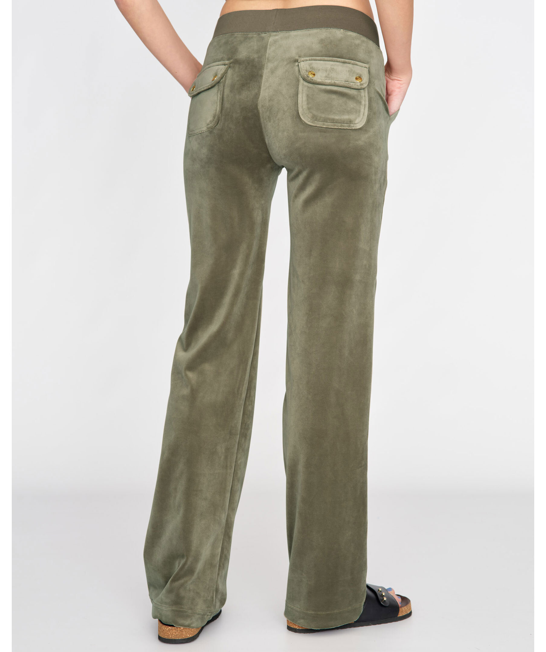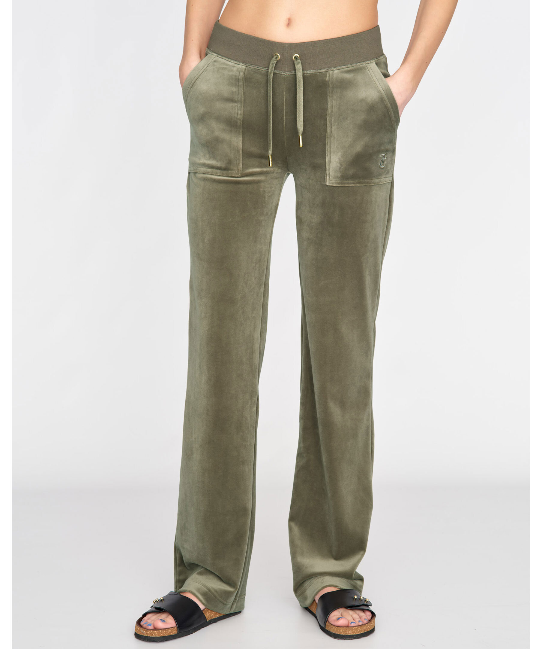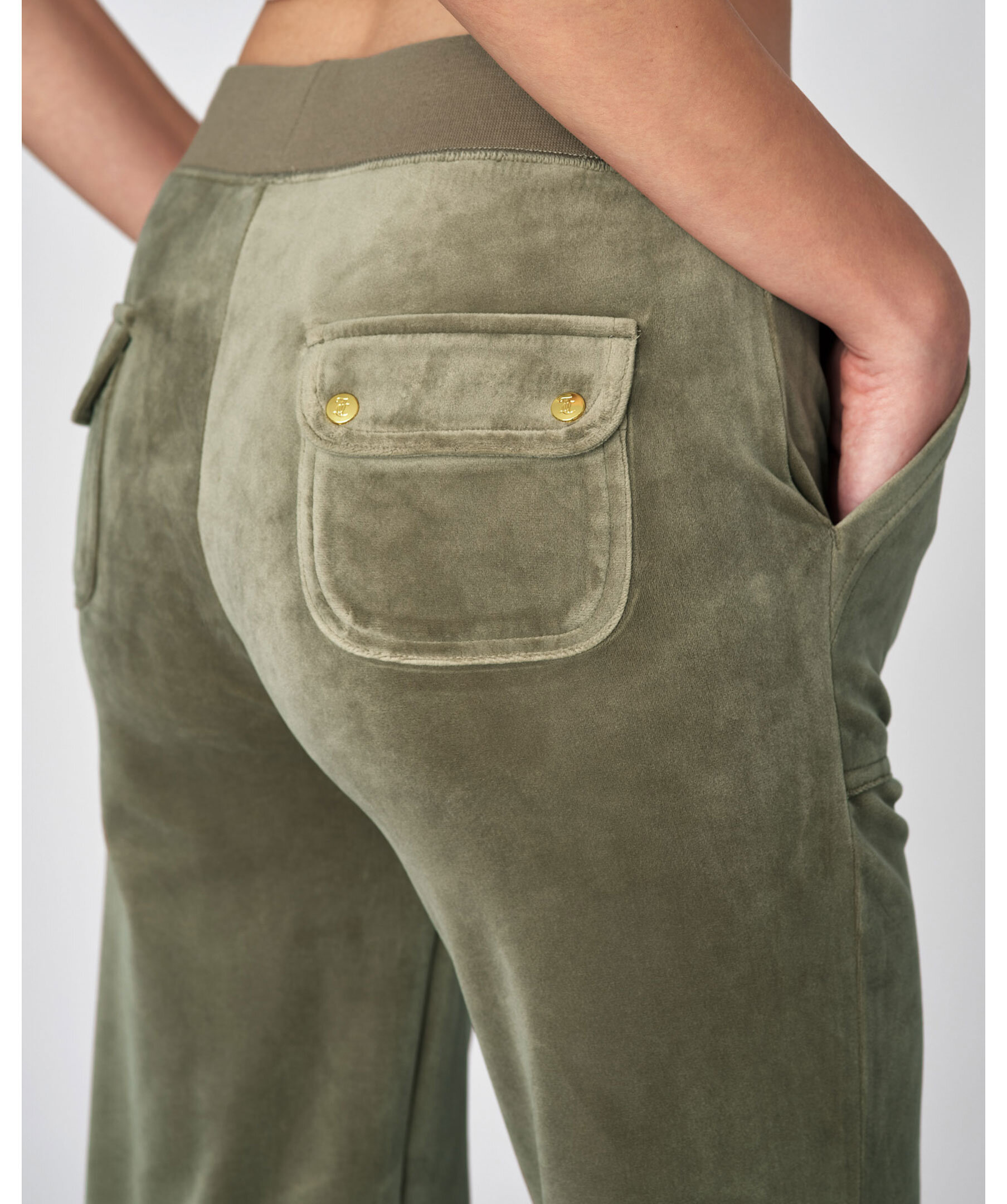 Byxor i velour i färgen Vetiver från Juicy Couture. Bred resårkant i midjan med snörning, fickor i sidorna och bakfickor med ficklock och tryckknappar med logotyp. Rak modell broderad logga framtill på vänster ficka.