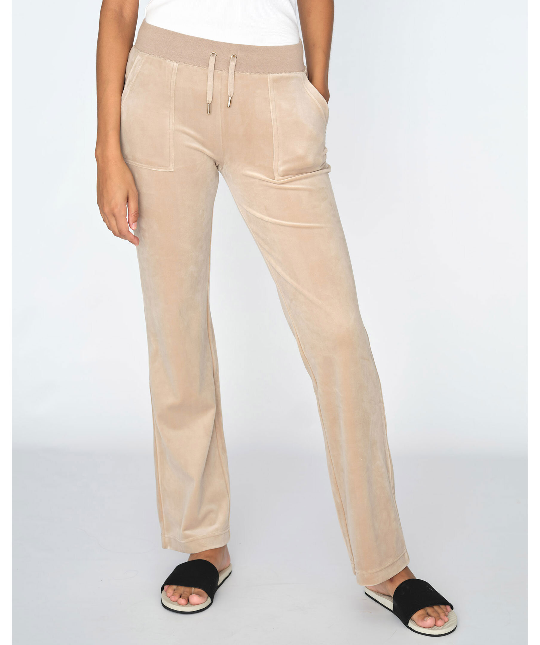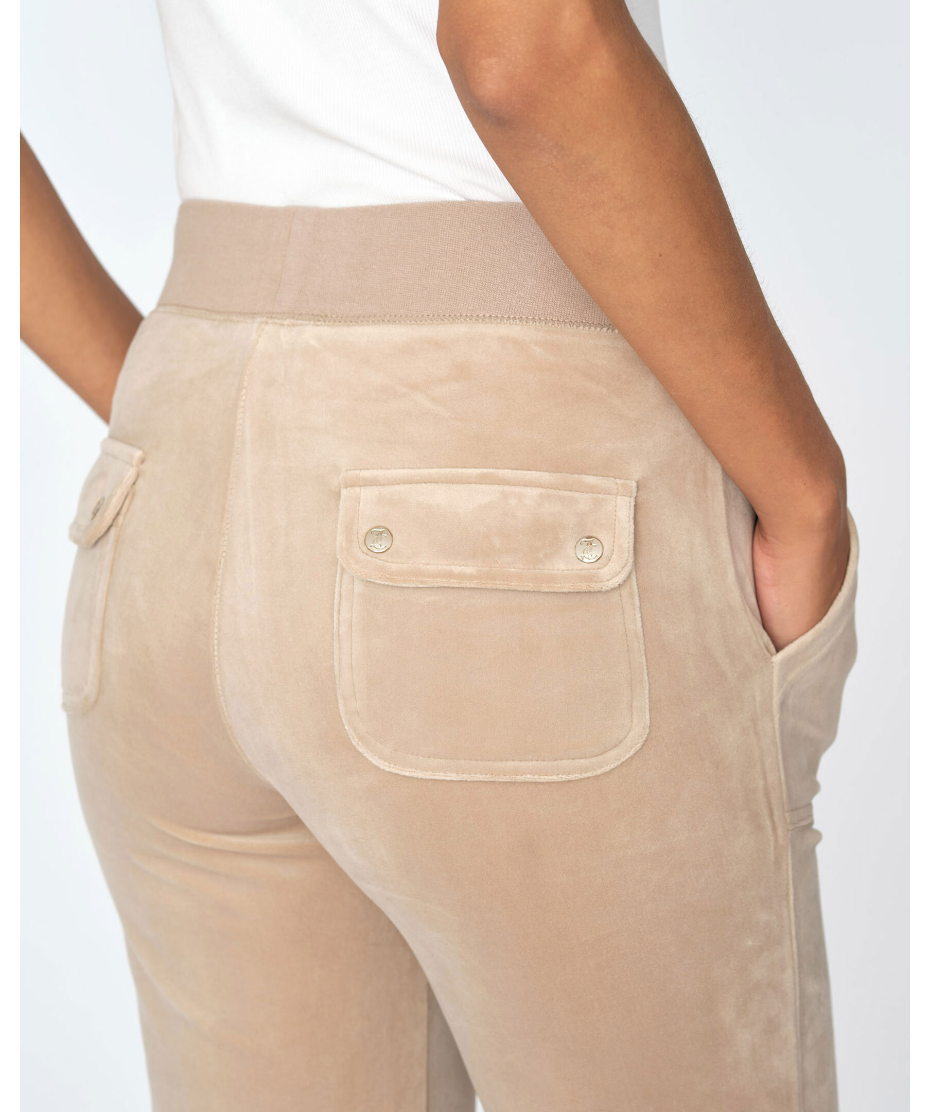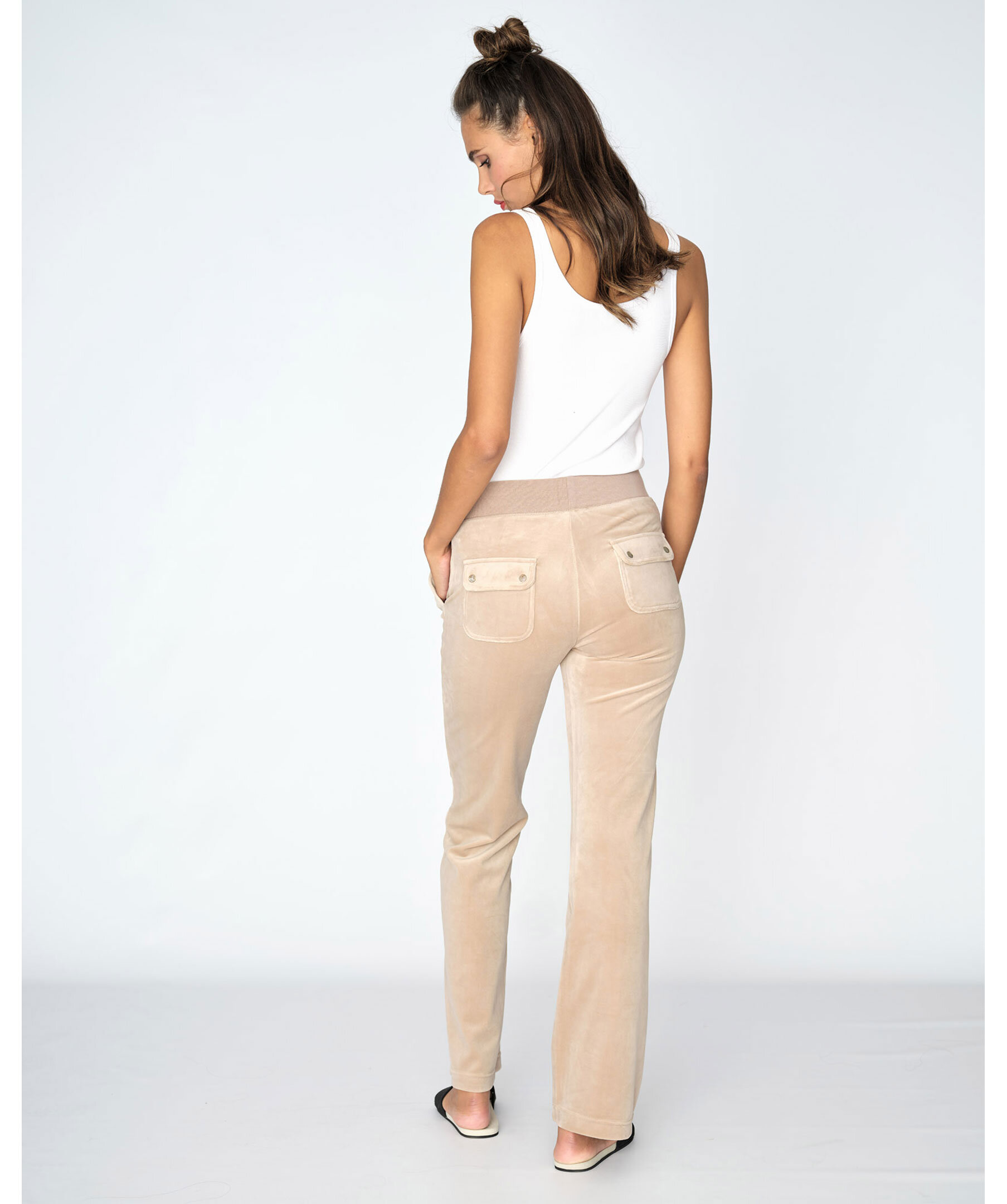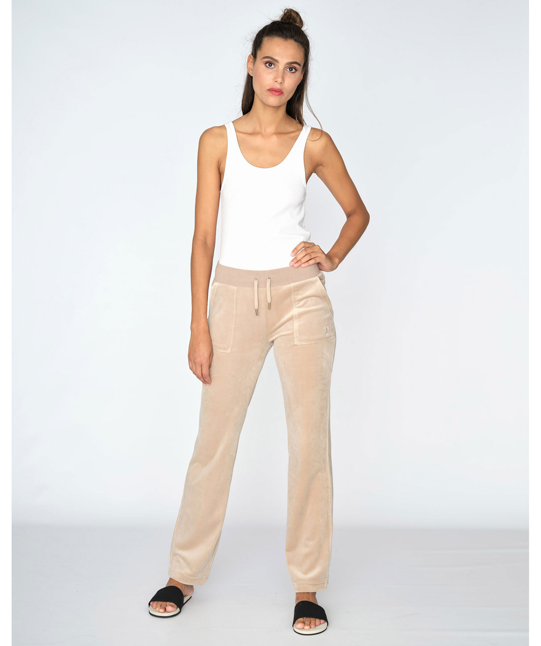 Byxor i velour i färgen Caramel från Juicy Couture. Bred resårkant i midjan med snörning, fickor i sidorna och bakfickor med ficklock och tryckknappar med logotyp. Rak modell, broderad logga framtill på vänster ficka.