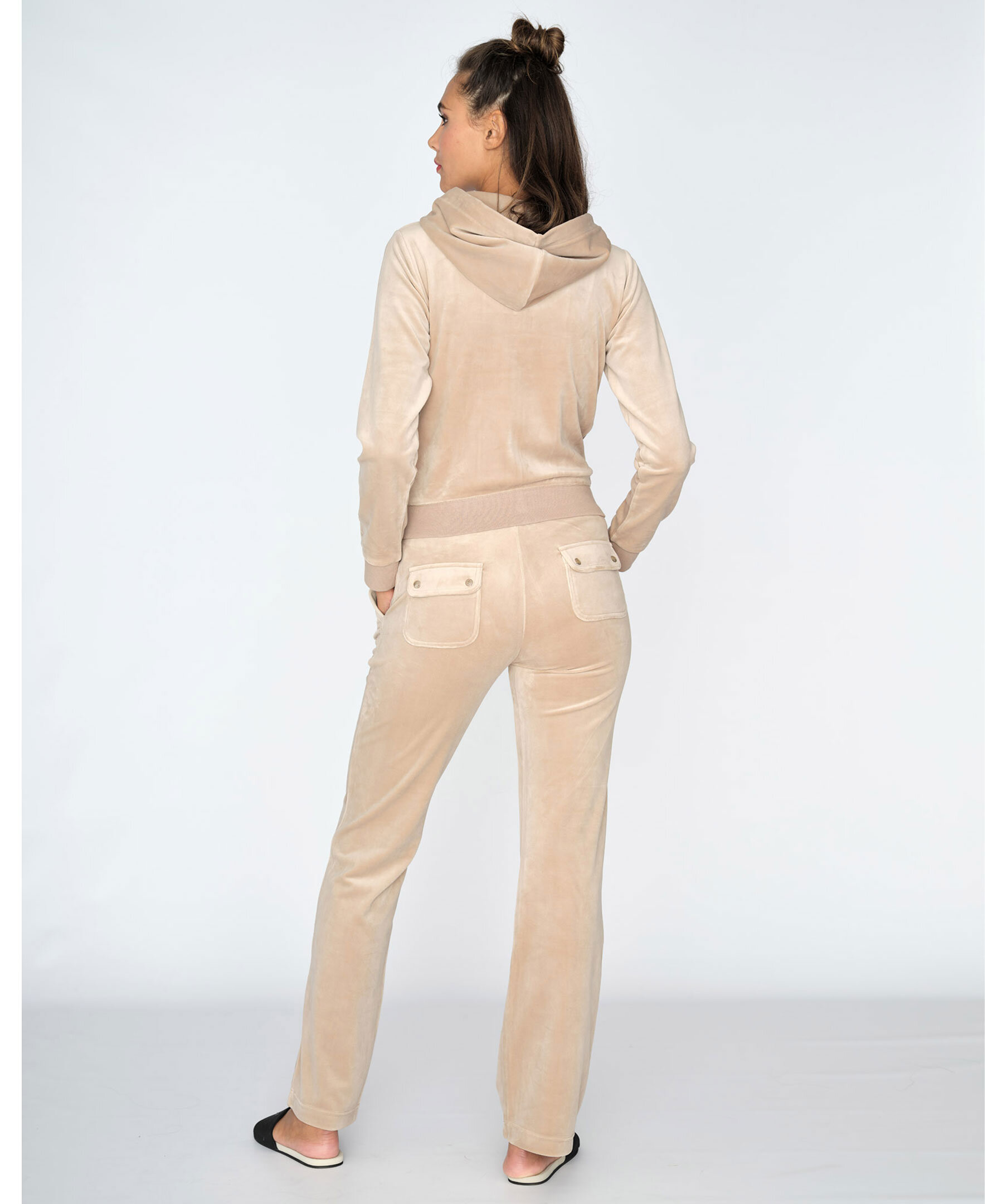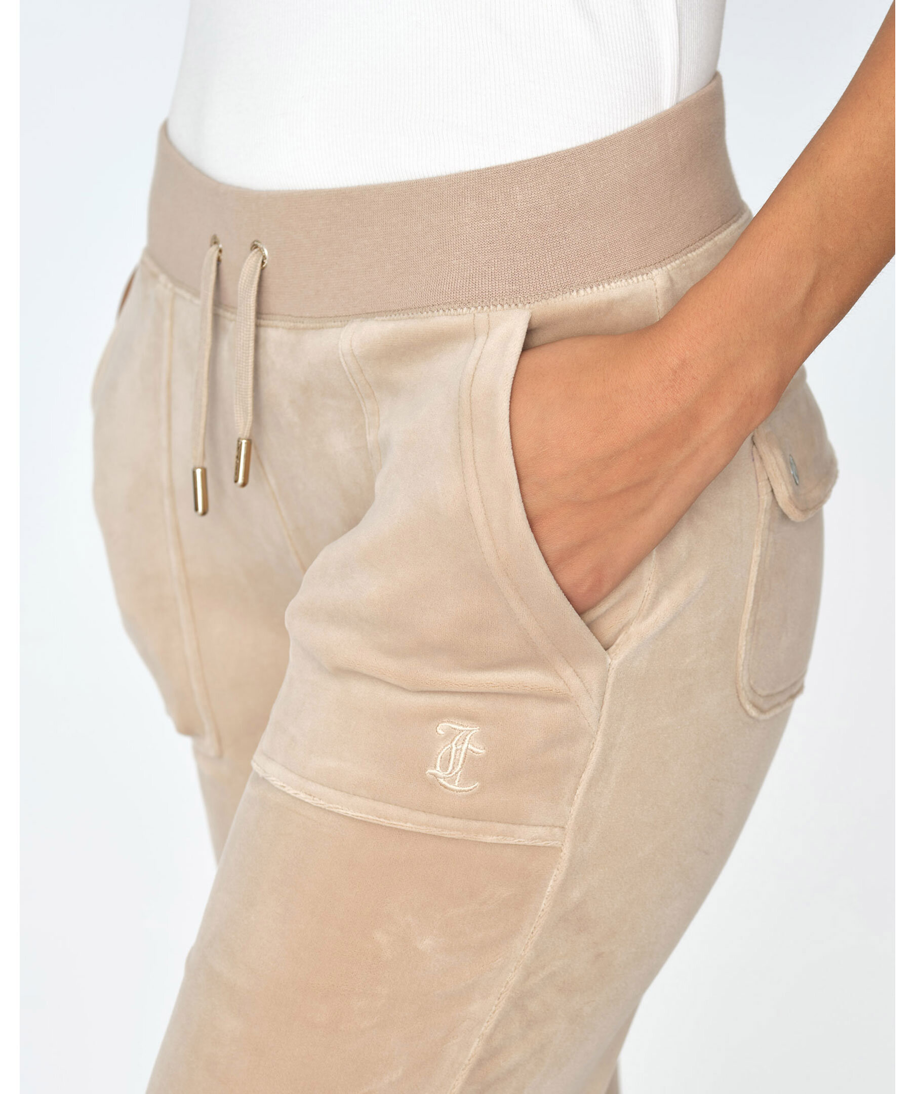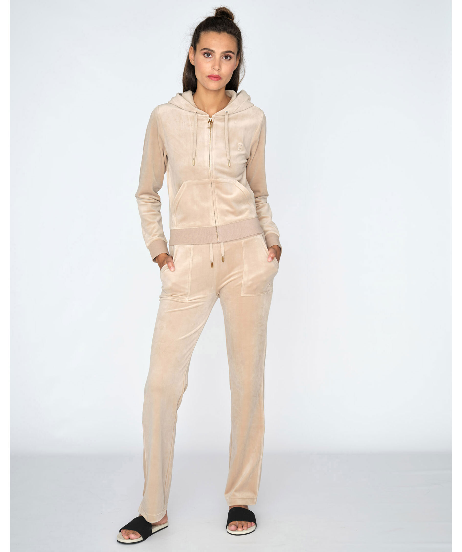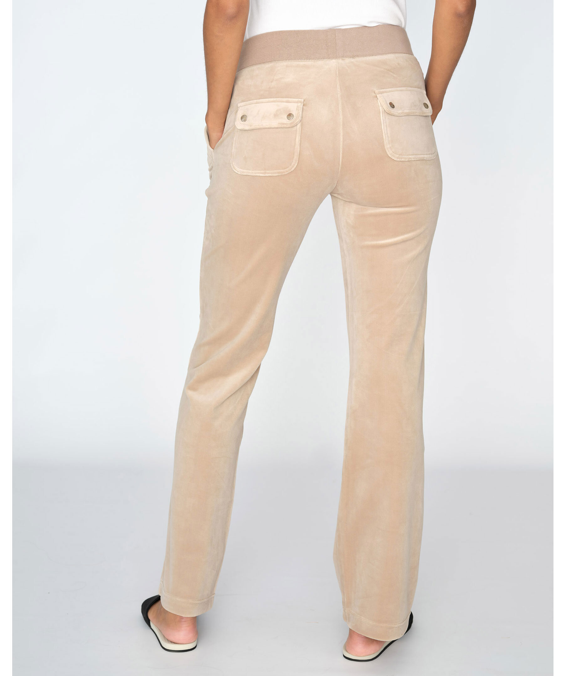 Byxor i velour i färgen Caramel från Juicy Couture. Bred resårkant i midjan med snörning, fickor i sidorna och bakfickor med ficklock och tryckknappar med logotyp. Rak modell, broderad logga framtill på vänster ficka.
