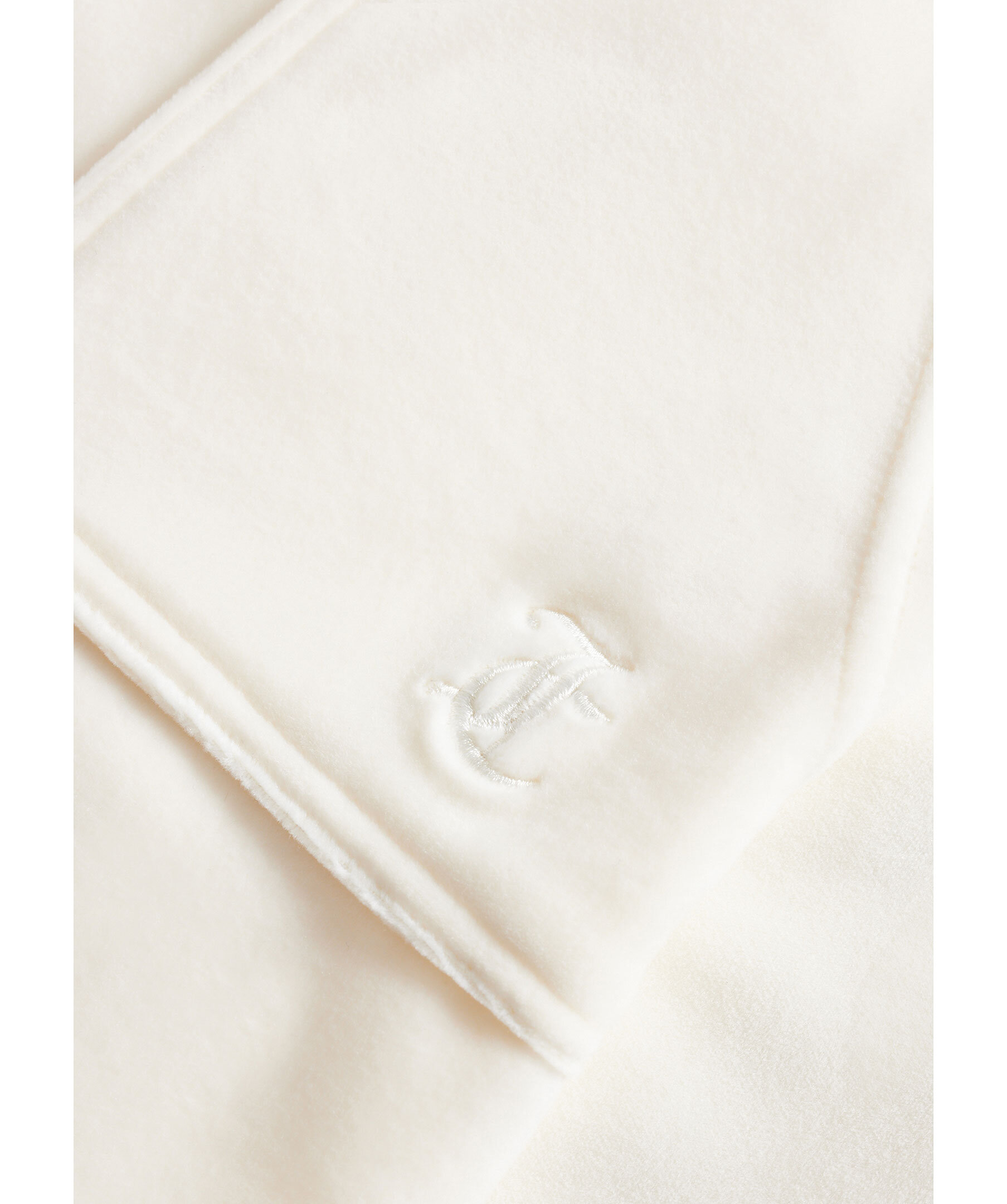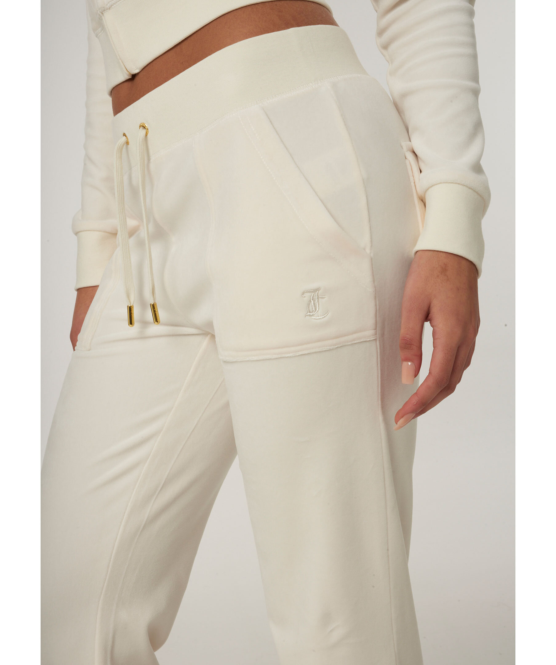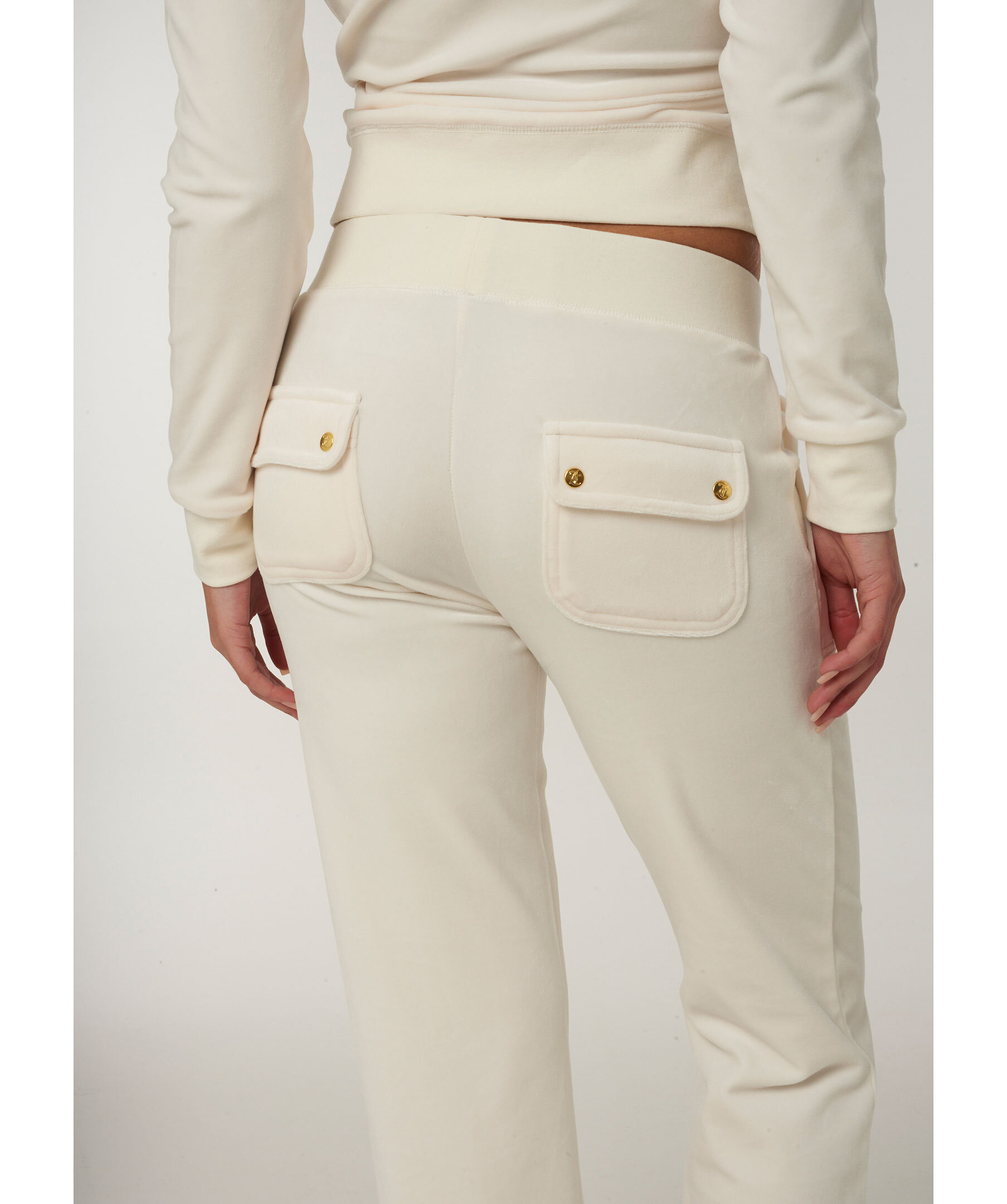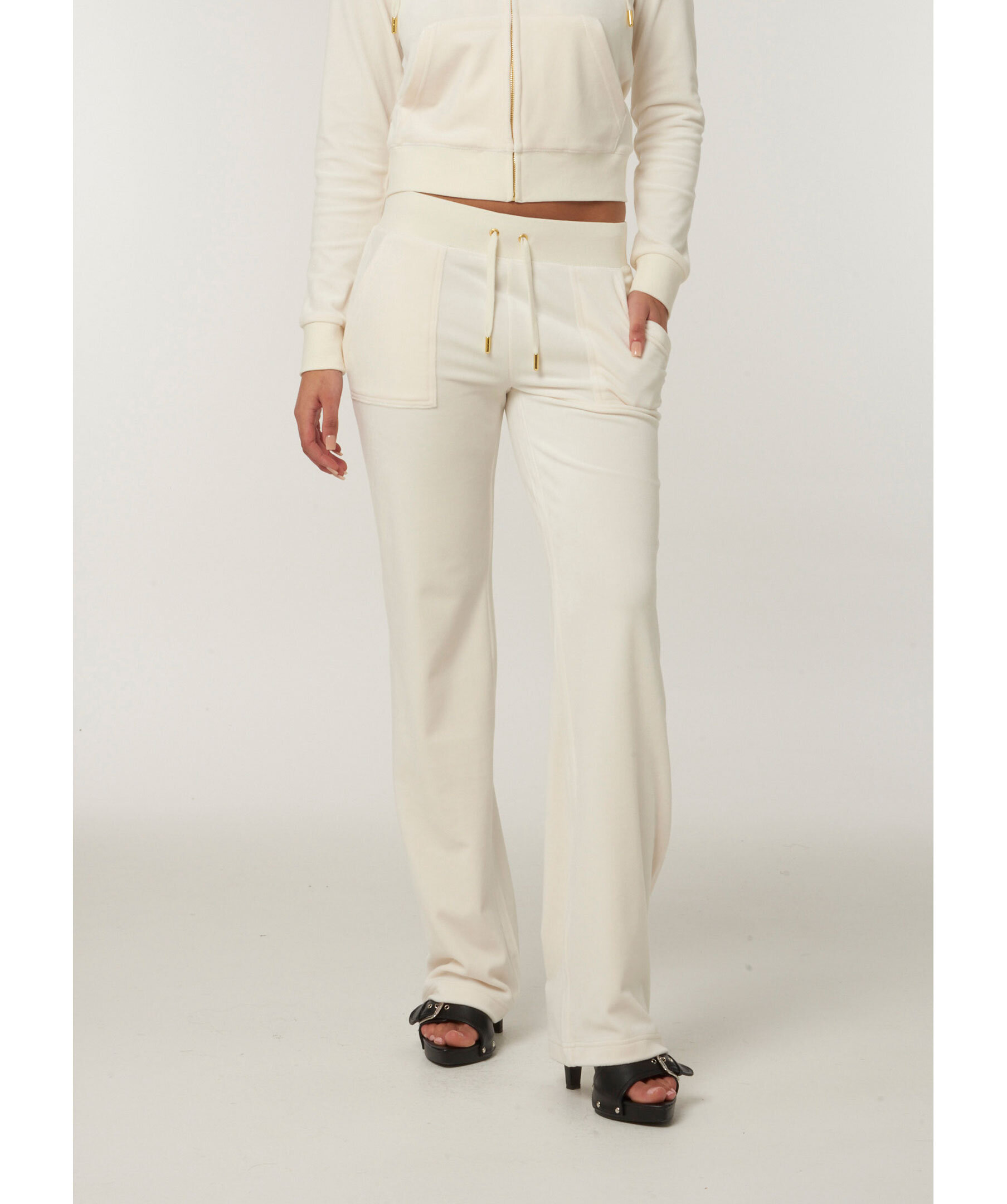 Byxor i velour i färgen Sugar Swizzle från Juicy Couture. Bred resårkant i midjan med snörning, fickor i sidorna och bakfickor med ficklock och tryckknappar med logotyp. Rak modell. Broderad logga framtill på vänster ficka.