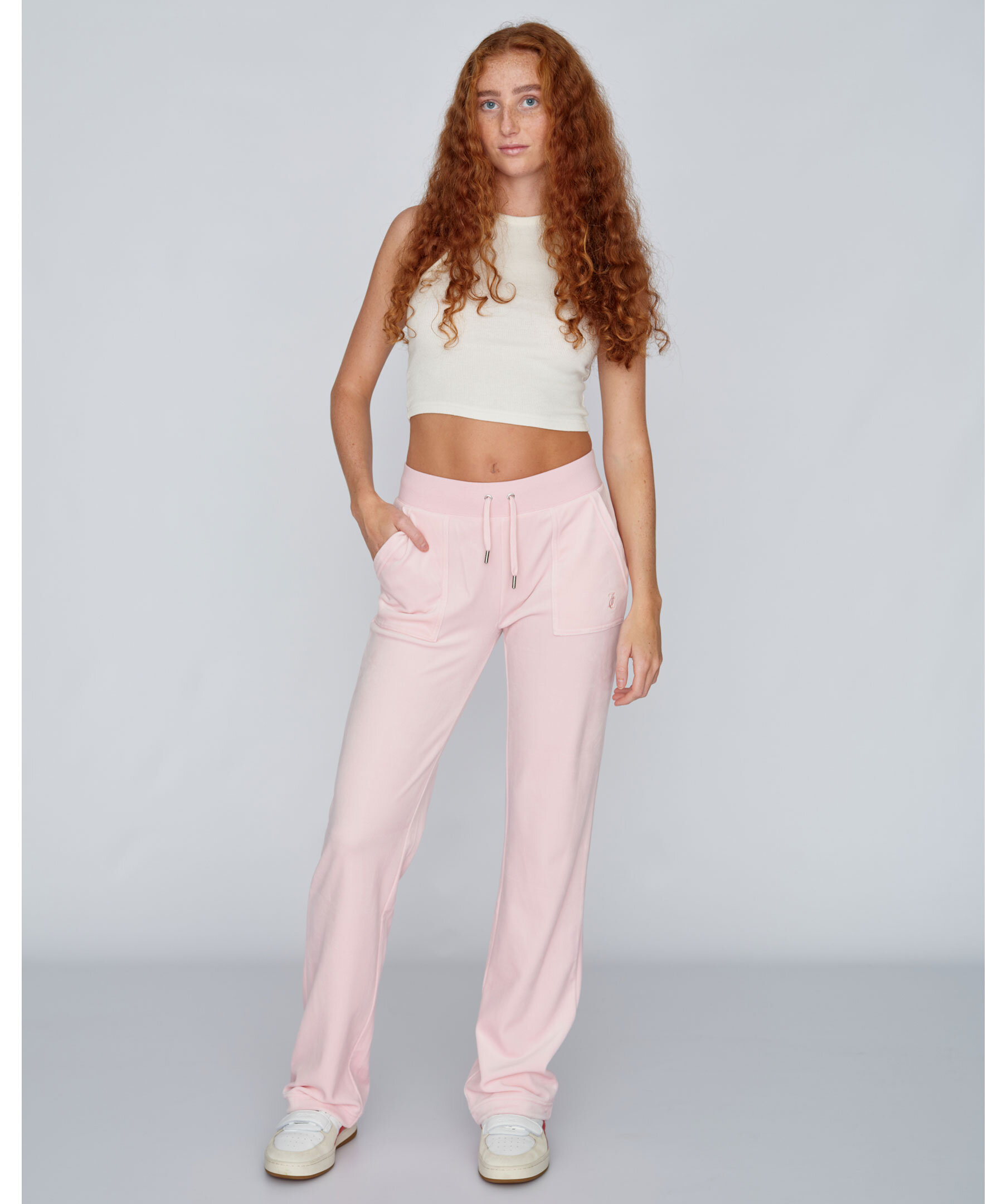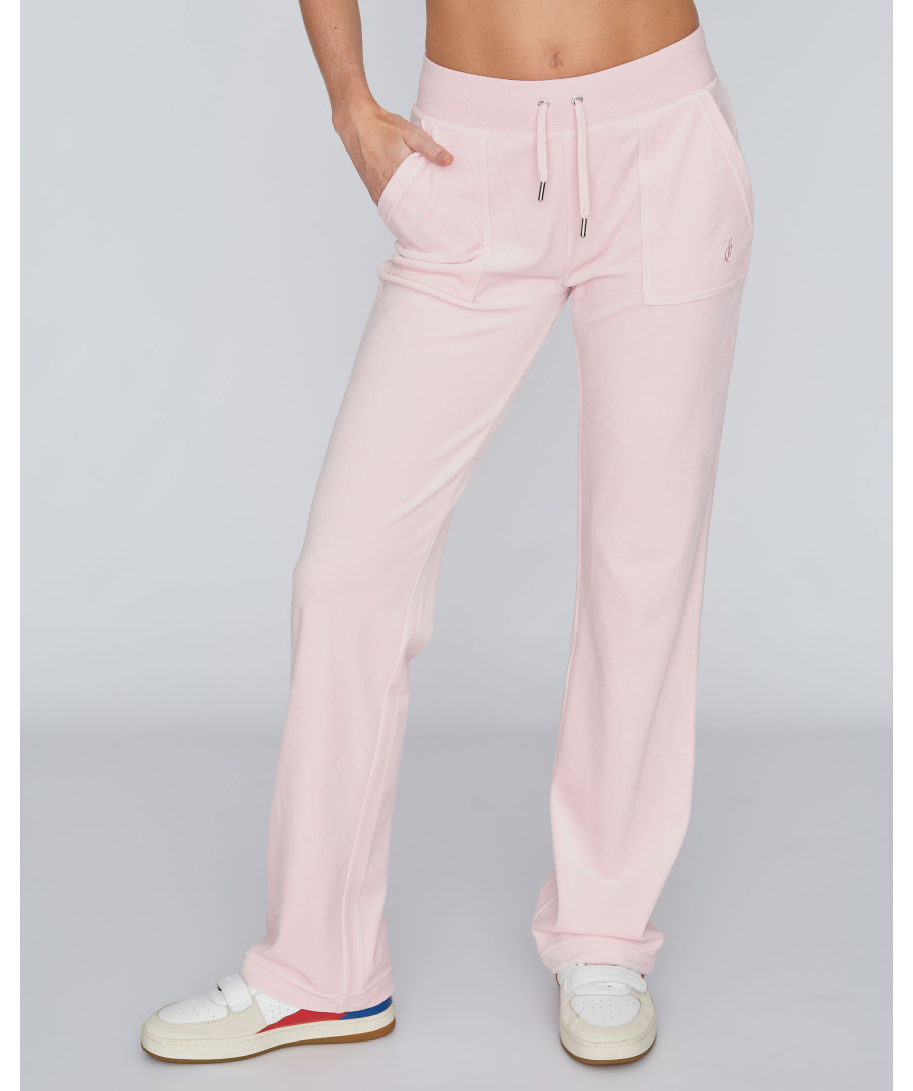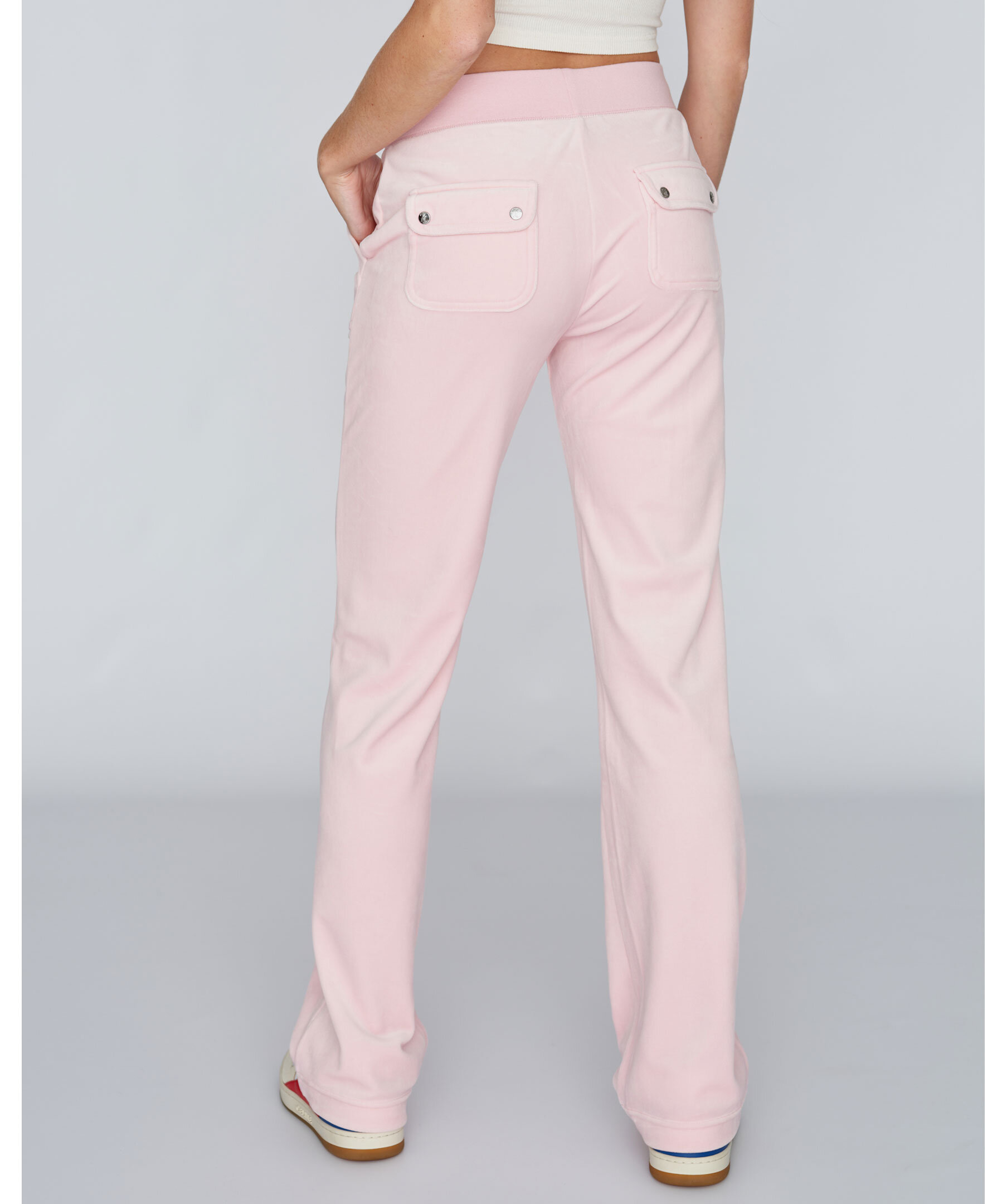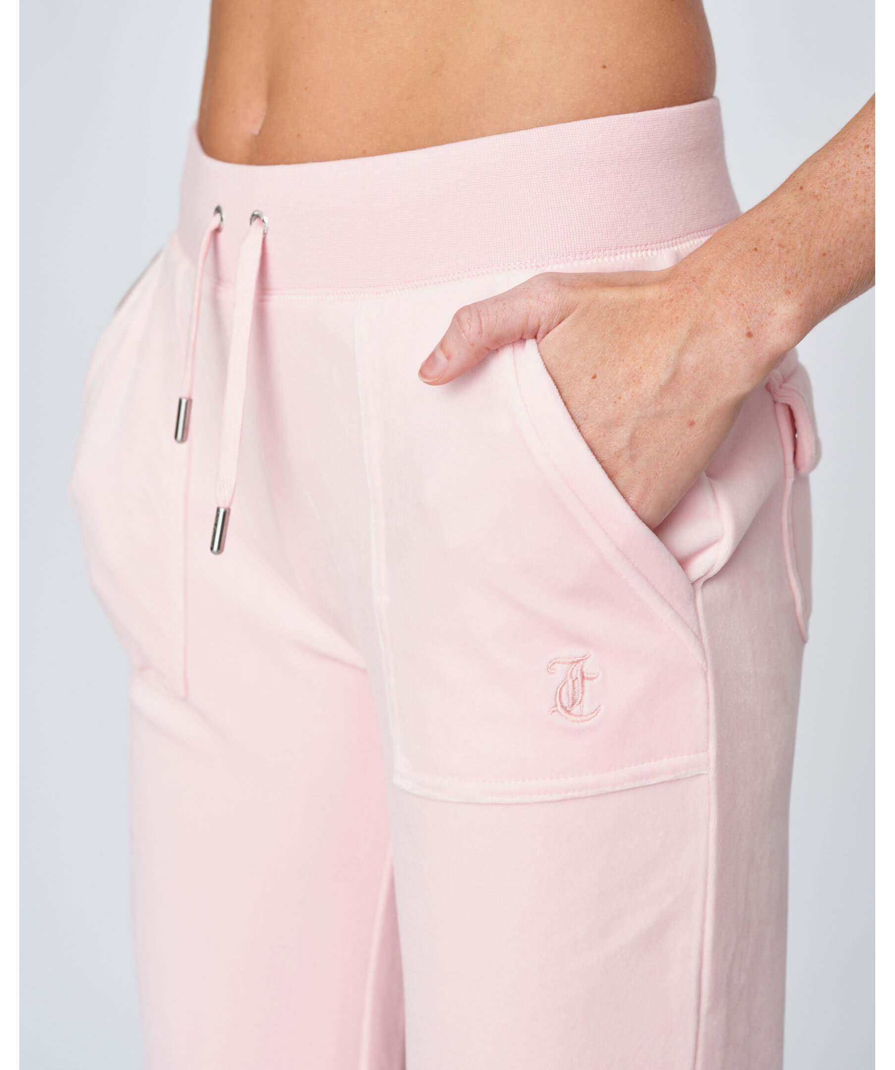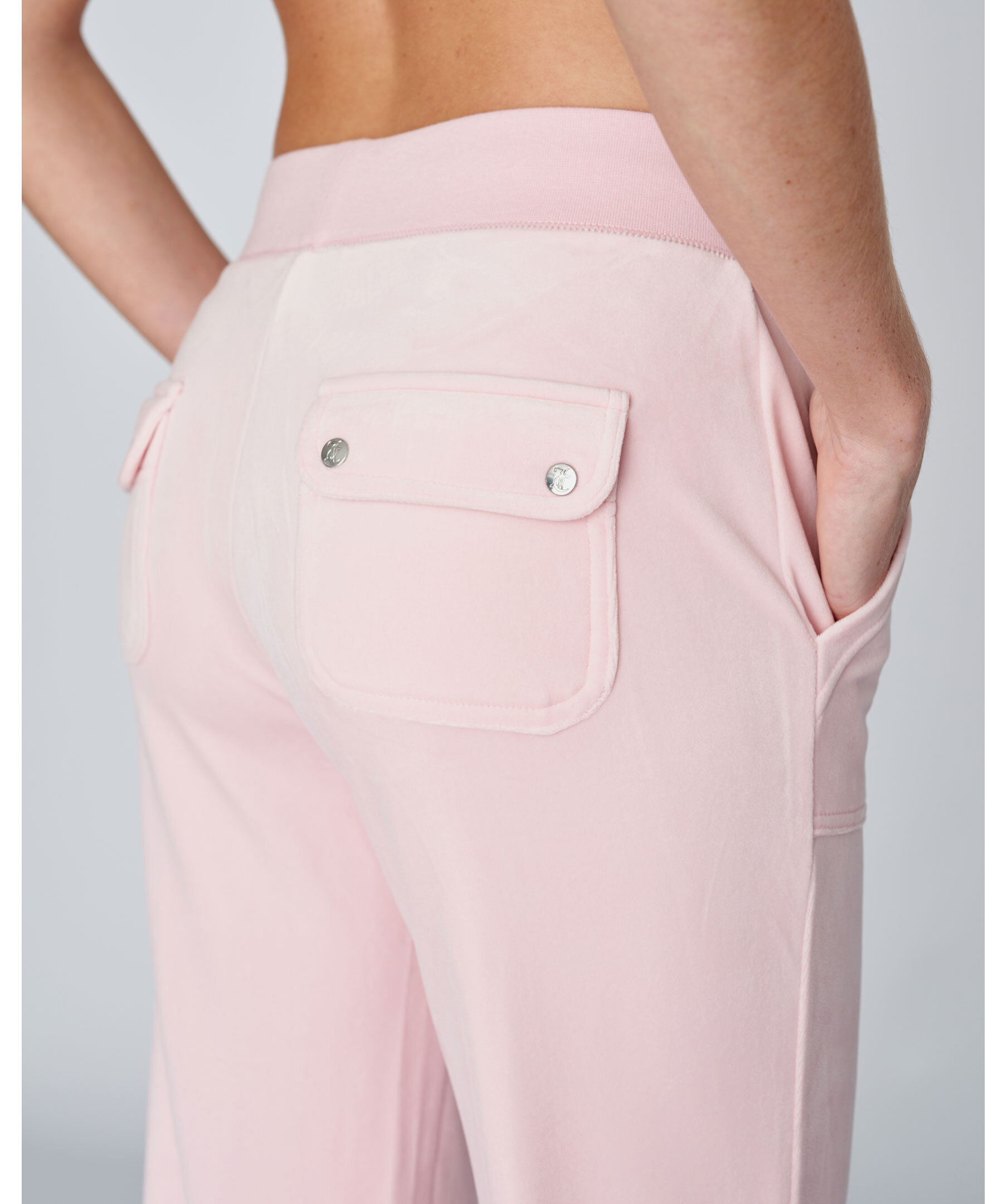 Rosa byxor i velour från Juicy Couture. Bred resårkant i midjan med snörning, fickor i sidorna och bakfickor med ficklock och tryckknappar med logotyp. Rak modell broderad logga framtill på vänster ficka.