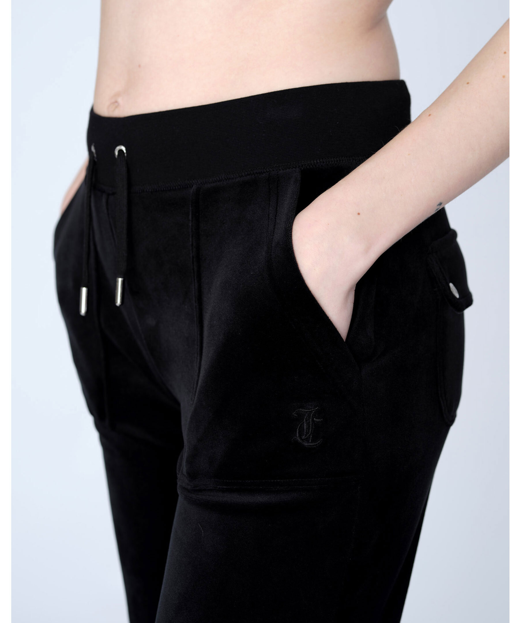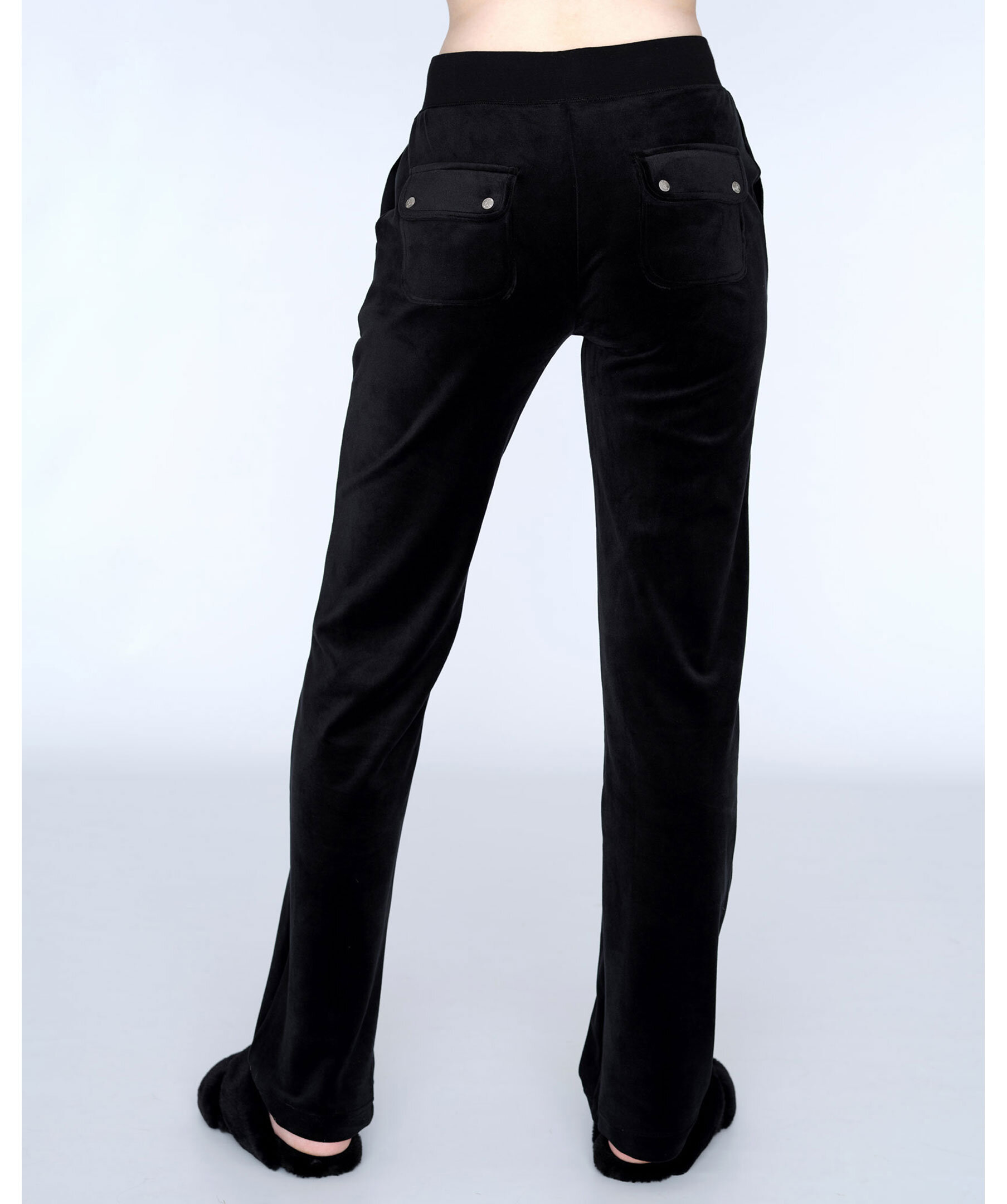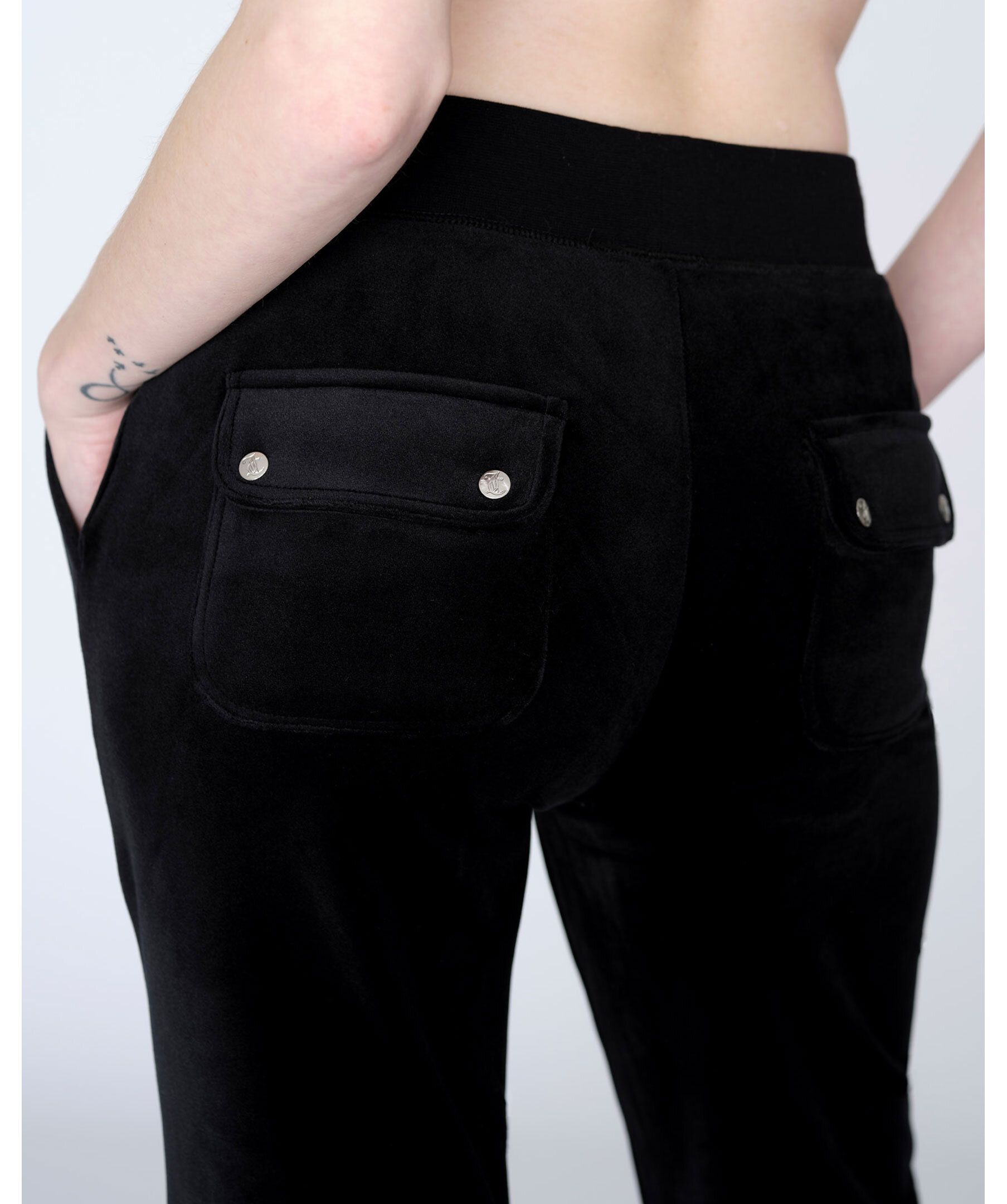 Svarta byxor i velour från Juicy Couture. Bred resårkant i midjan med snörning, fickor i sidorna och bakfickor med ficklock och tryckknappar med logotyp. Rak modell Broderad logga framtill på vänster ficka.