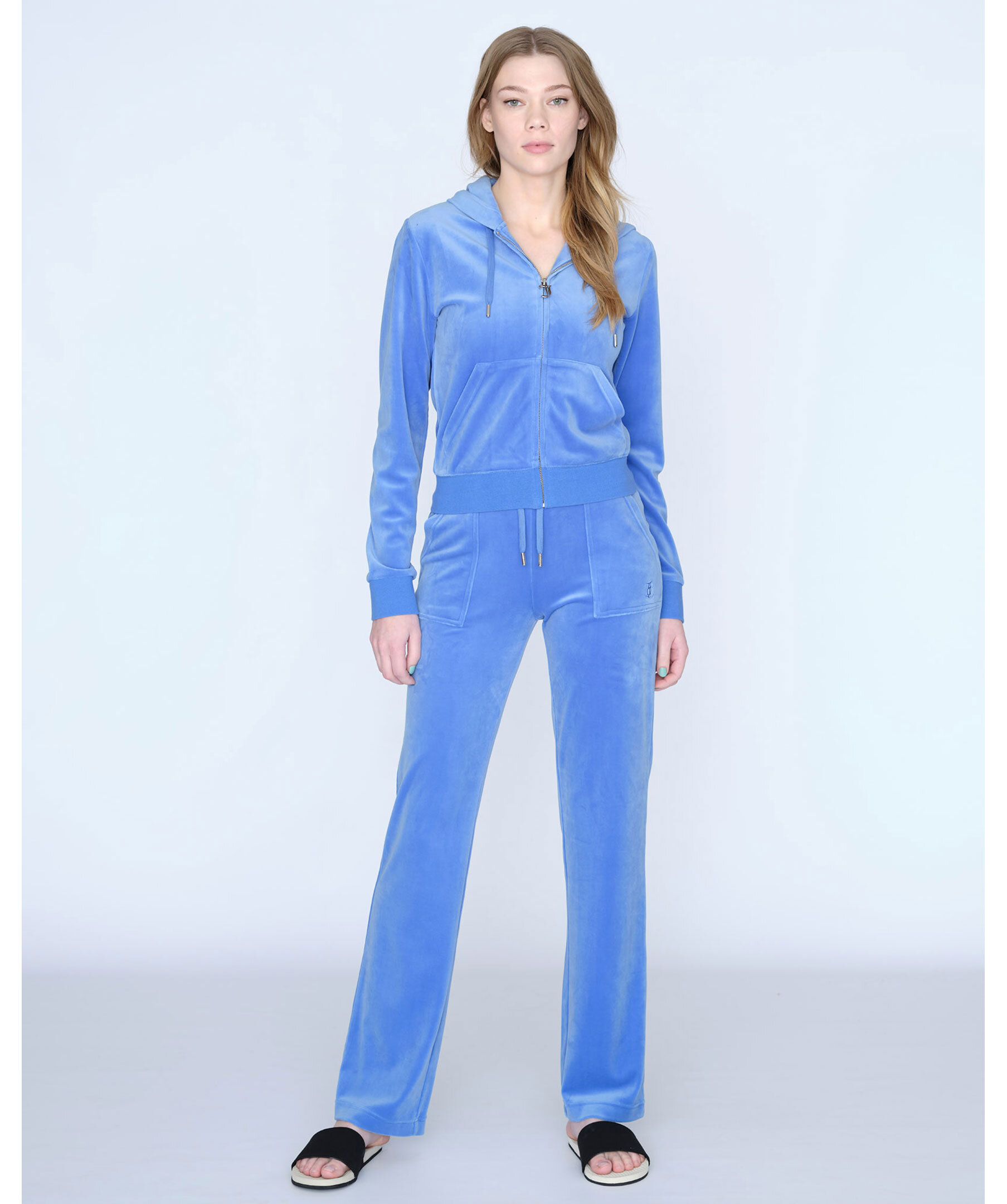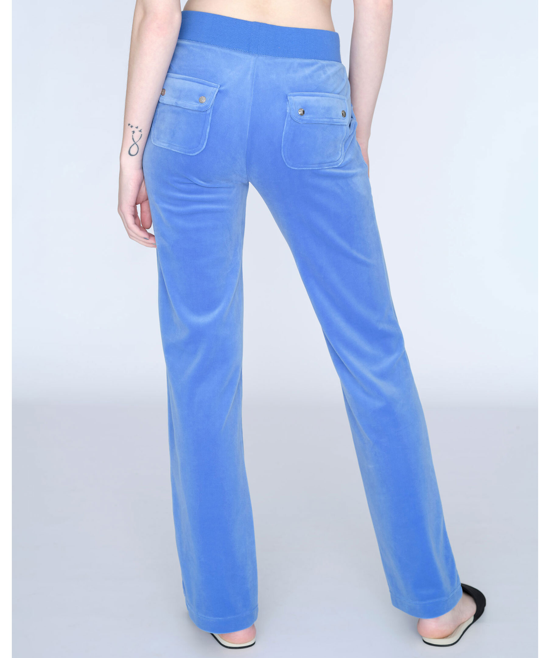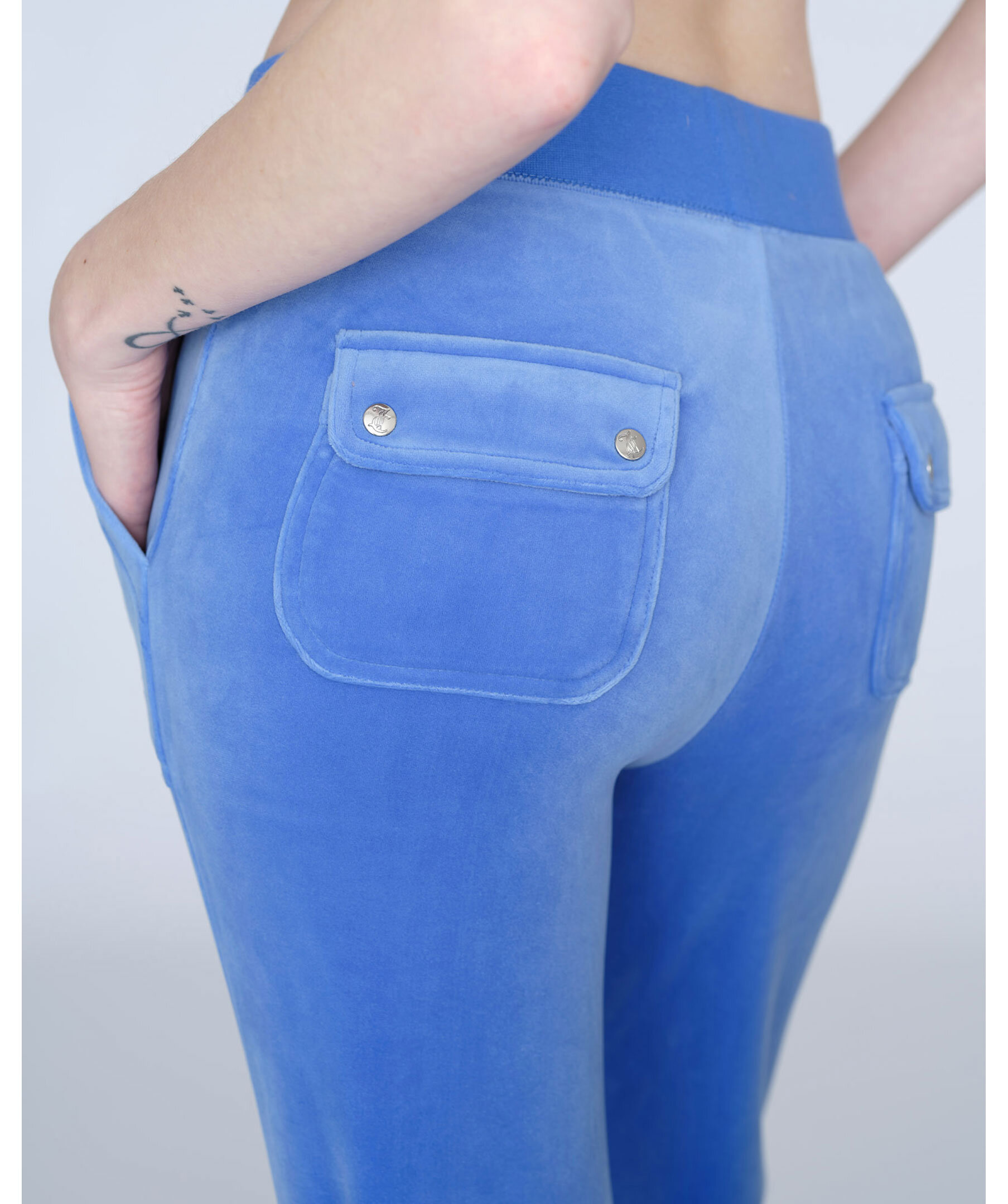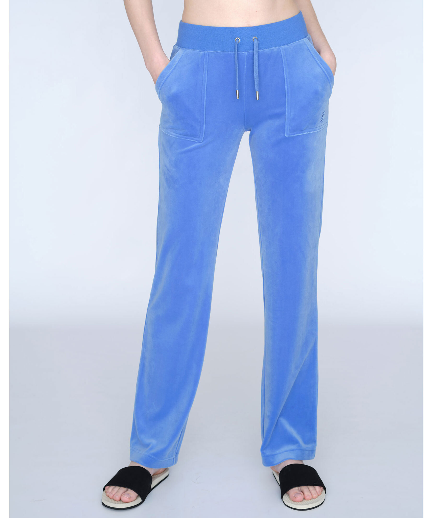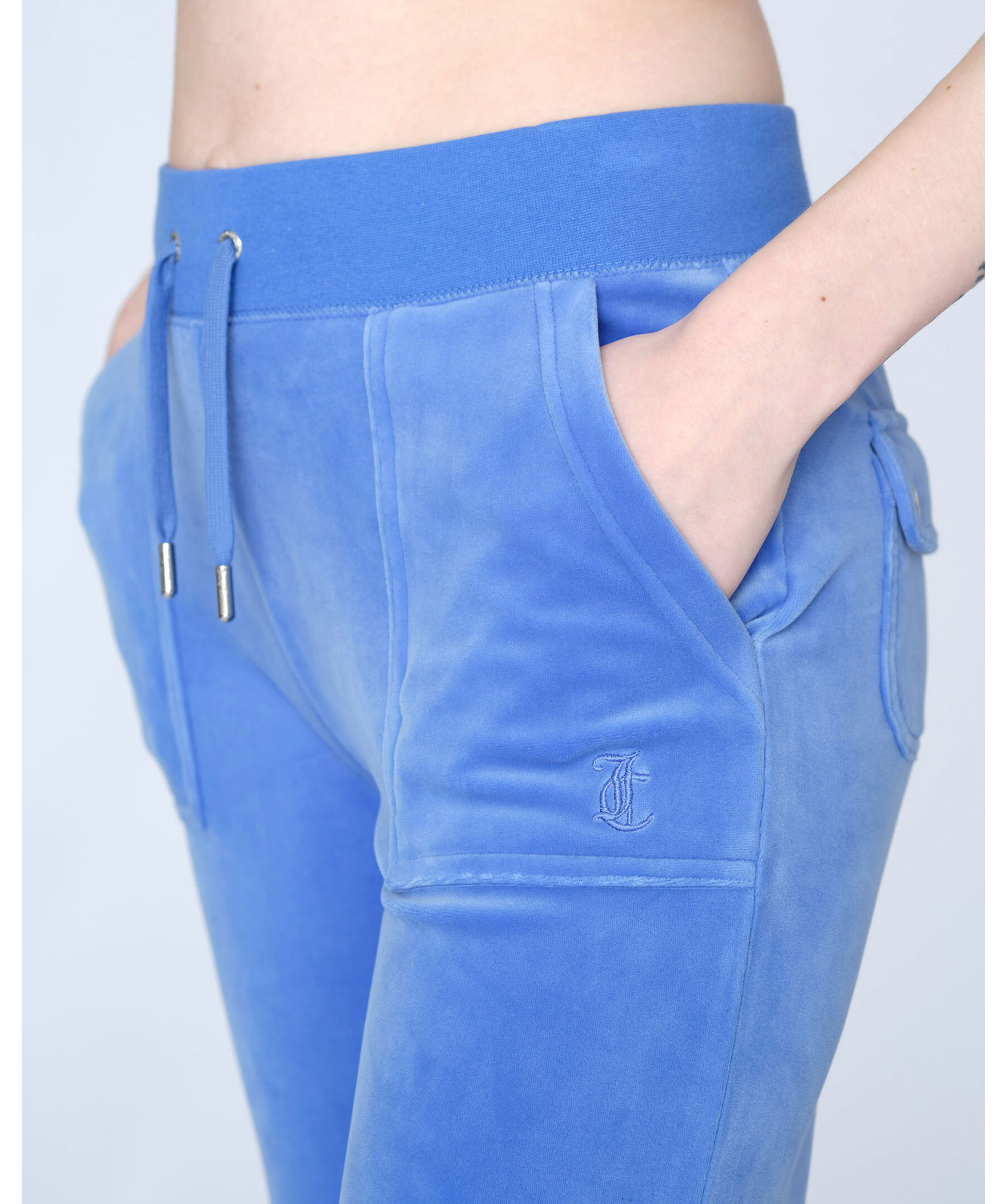 Himelsblåa byxor i velour från Juicy Couture. Bred resårkant i midjan med snörning, fickor i sidorna och bakfickor med ficklock och tryckknappar med logotyp. Rak modell broderad logga framtill på vänster ficka.