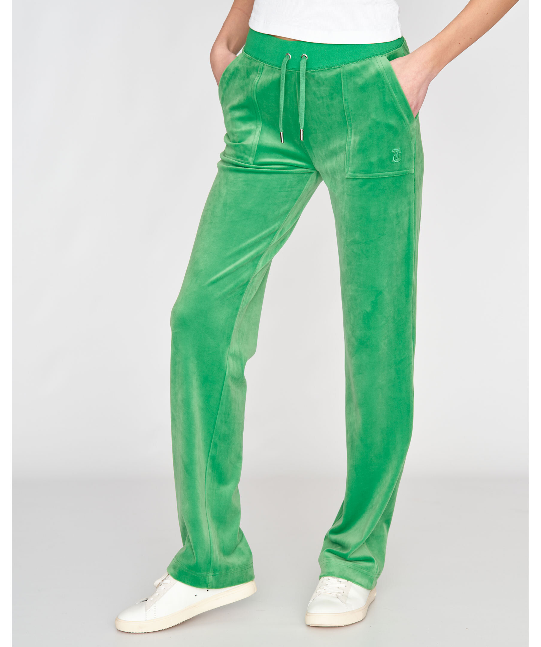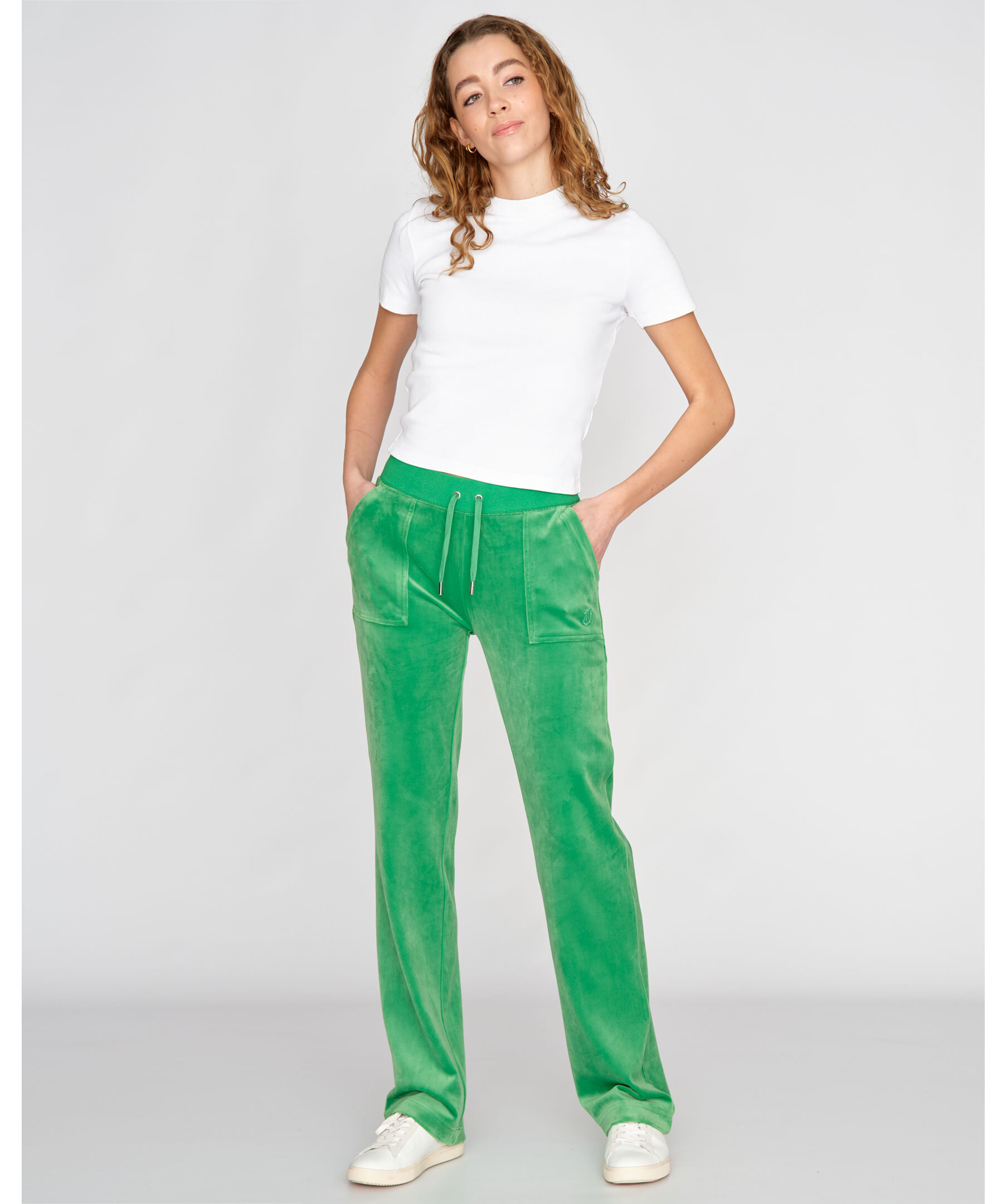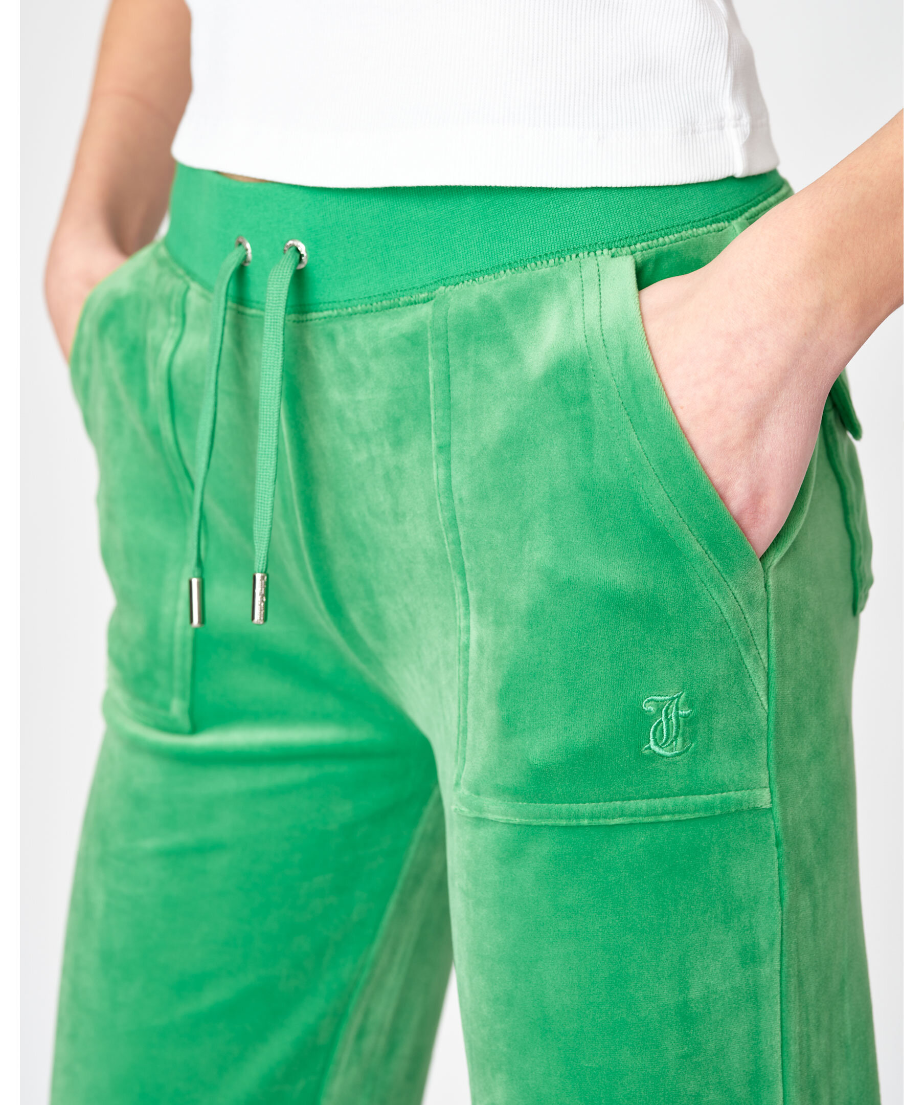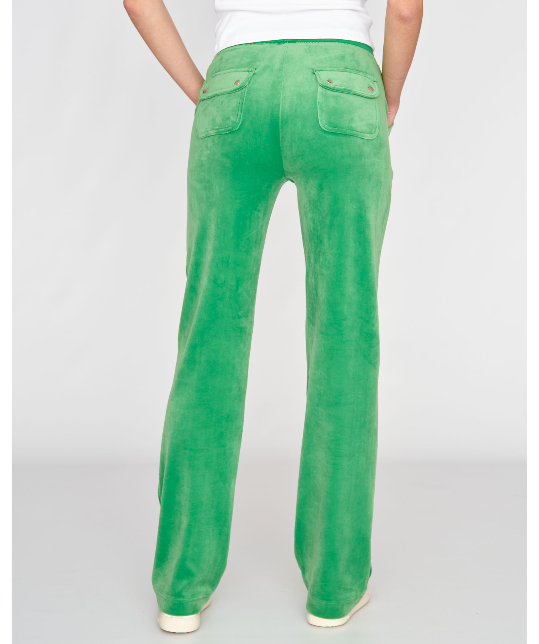 Gröna byxor i velour från Juicy Couture. Bred resårkant i midjan med snörning, fickor i sidorna och bakfickor med ficklock och tryckknappar med logotyp. Rak modell broderad logga framtill på vänster ficka.