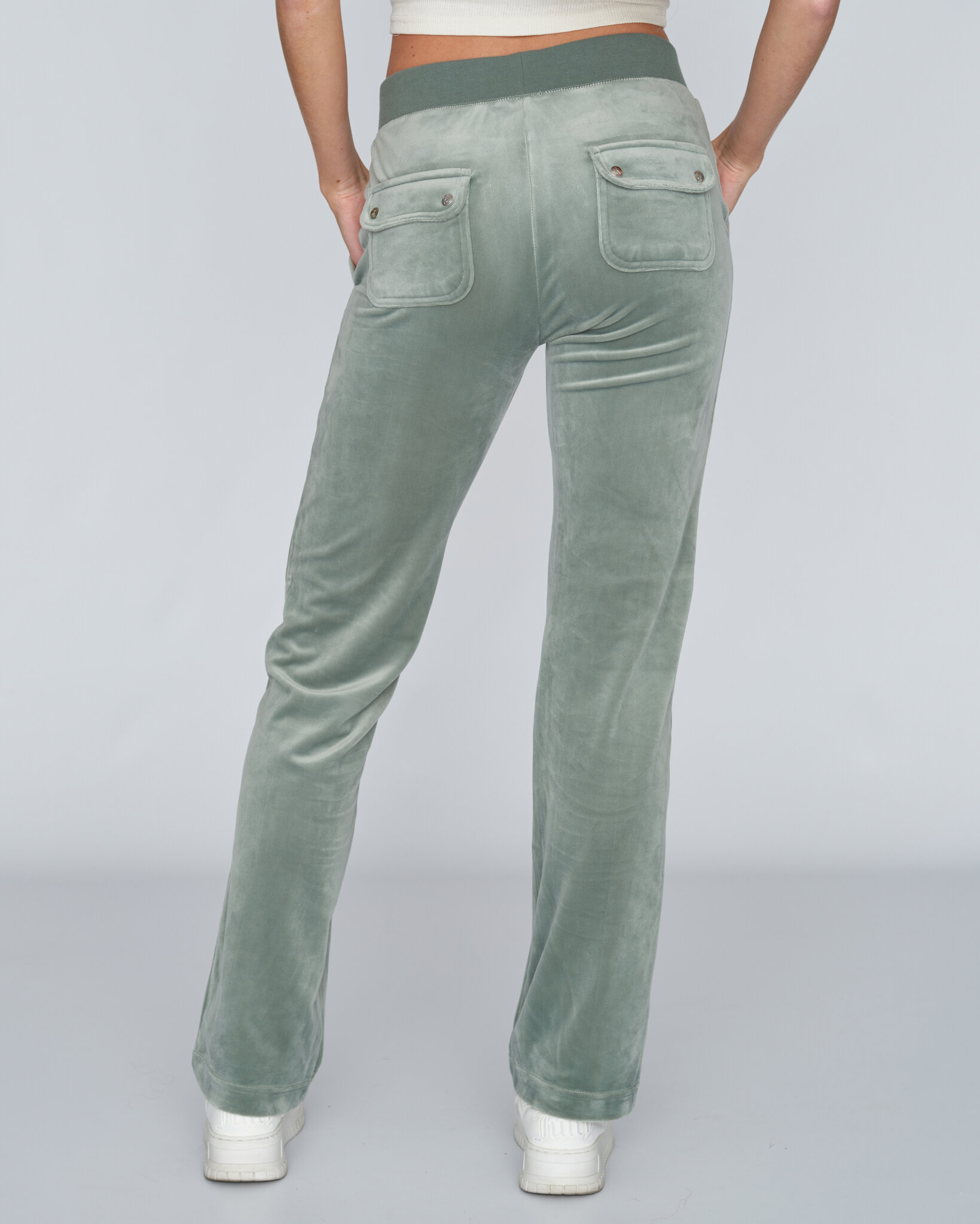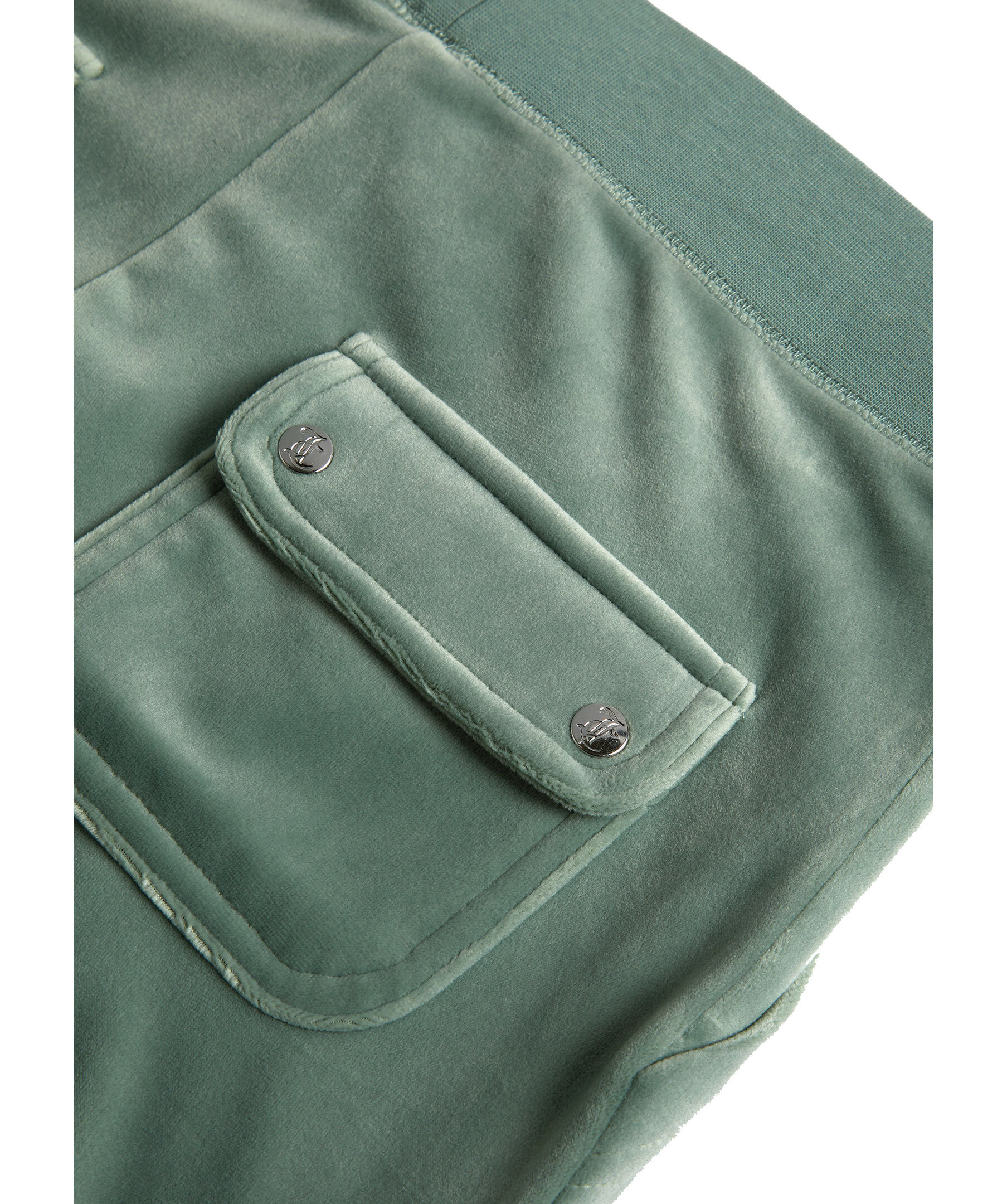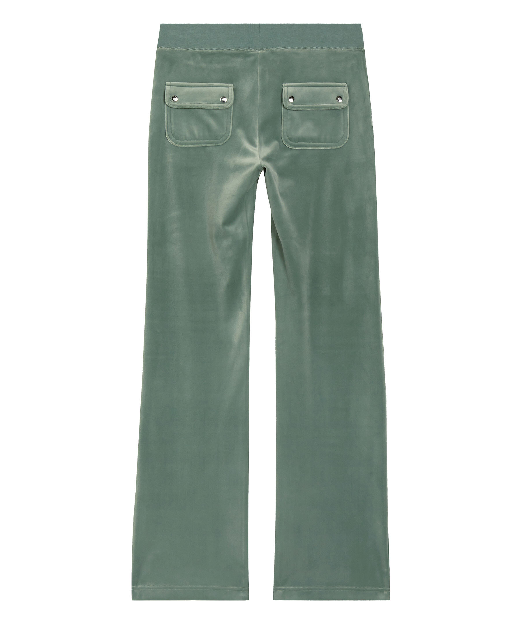 Byxor i velour i färgen Chinois Green från Juicy Couture. Bred resårkant i midjan med snörning, fickor i sidorna och bakfickor med ficklock och tryckknappar med logotyp. Rak modell. Broderad logga framtill på vänster ficka.