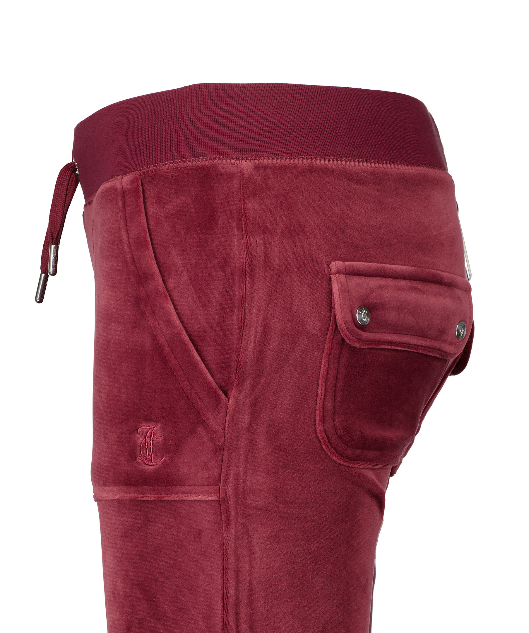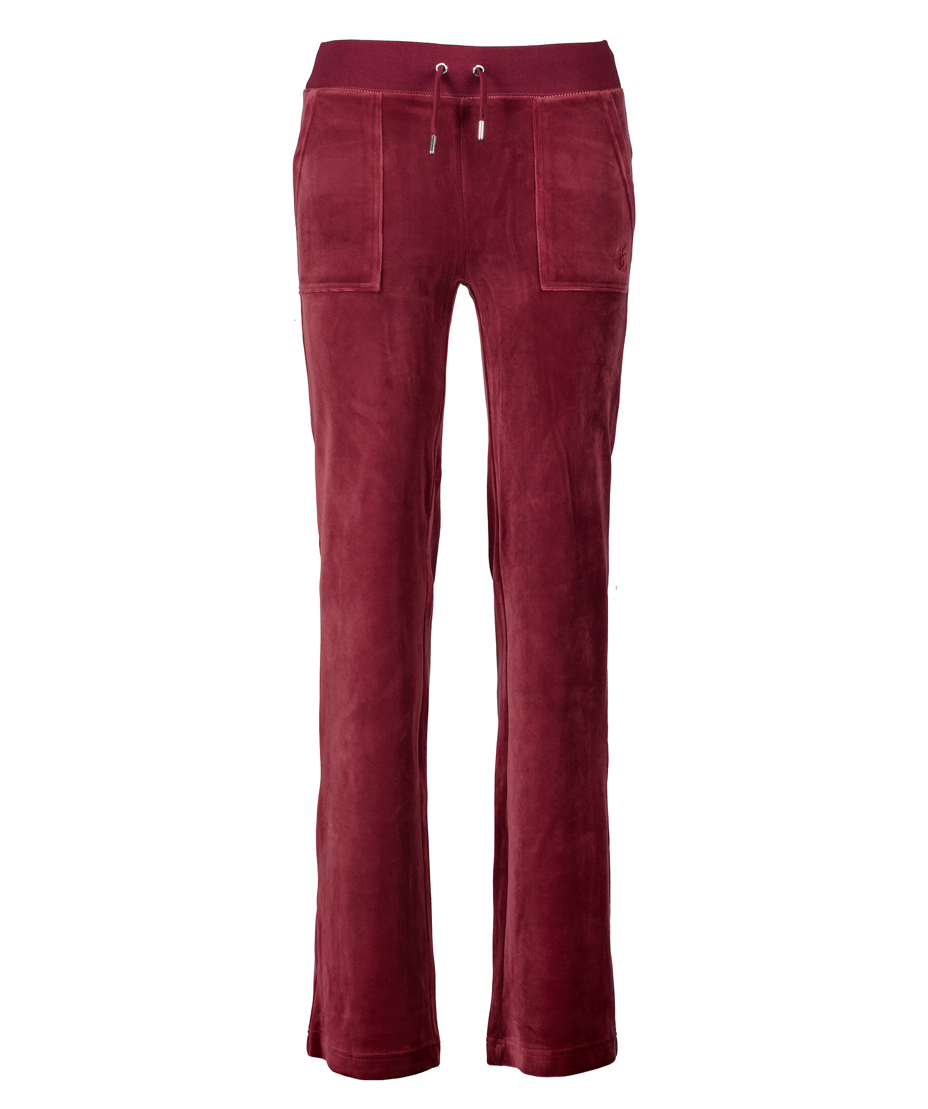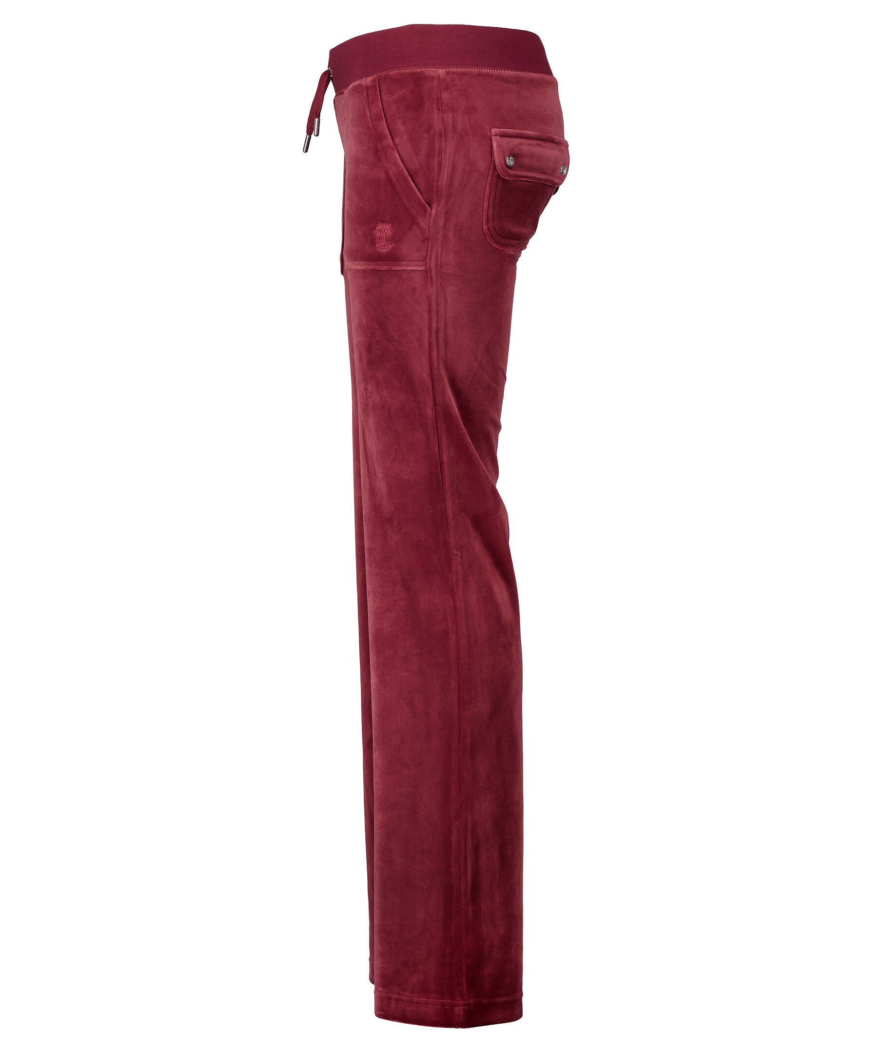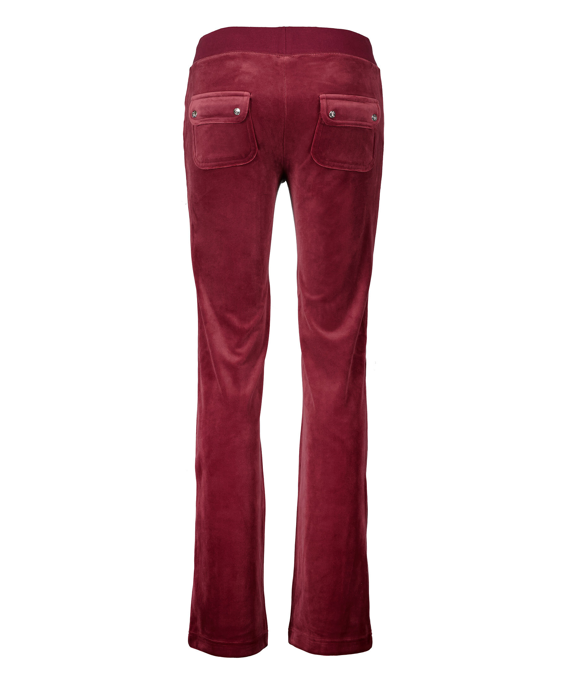 Vinröda byxor i velour från Juicy Couture. Bred resårkant i midjan med snörning, fickor i sidorna och bakfickor med ficklock och tryckknappar med logotyp. Rak modell, broderad logga framtill på vänster ficka.