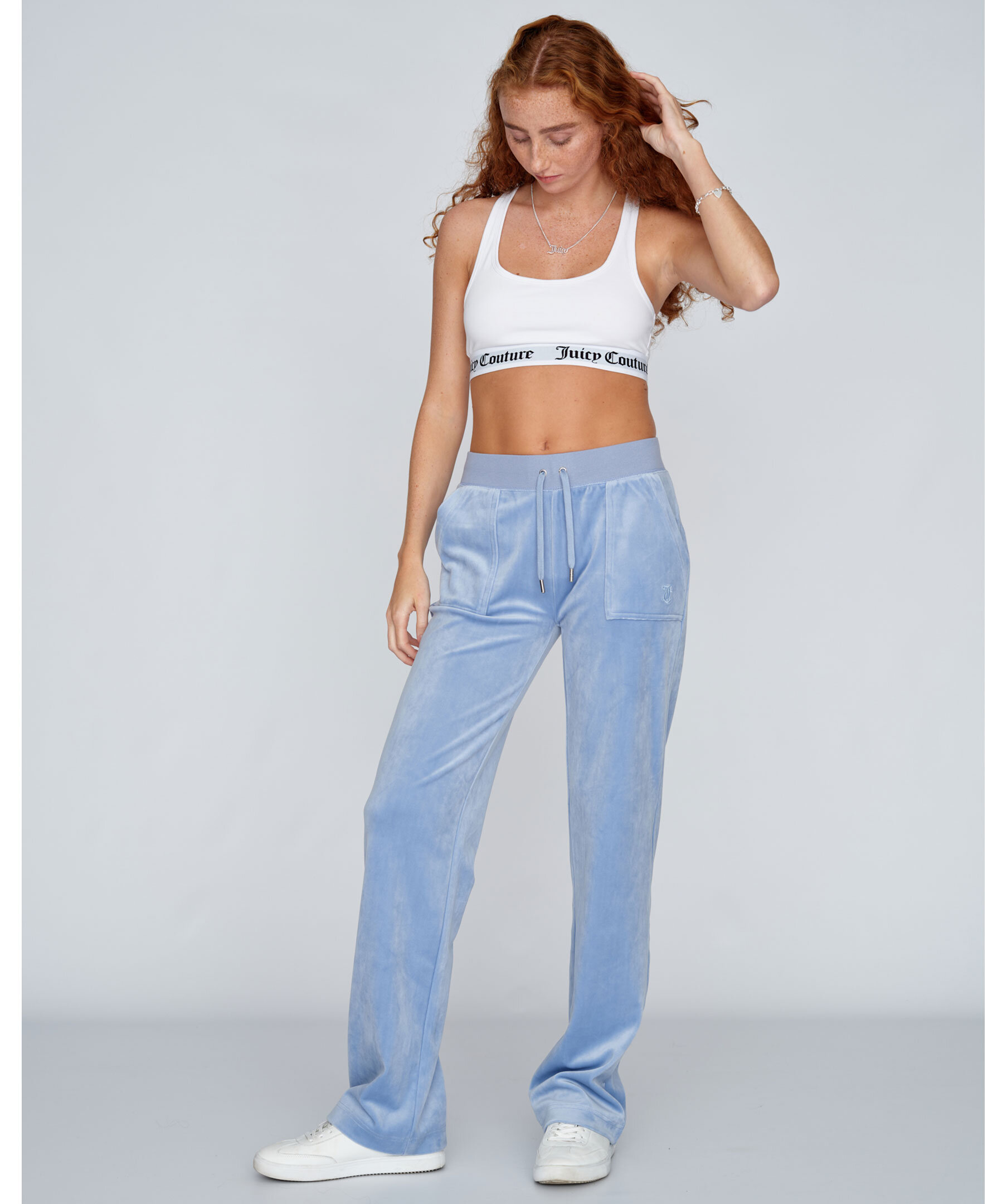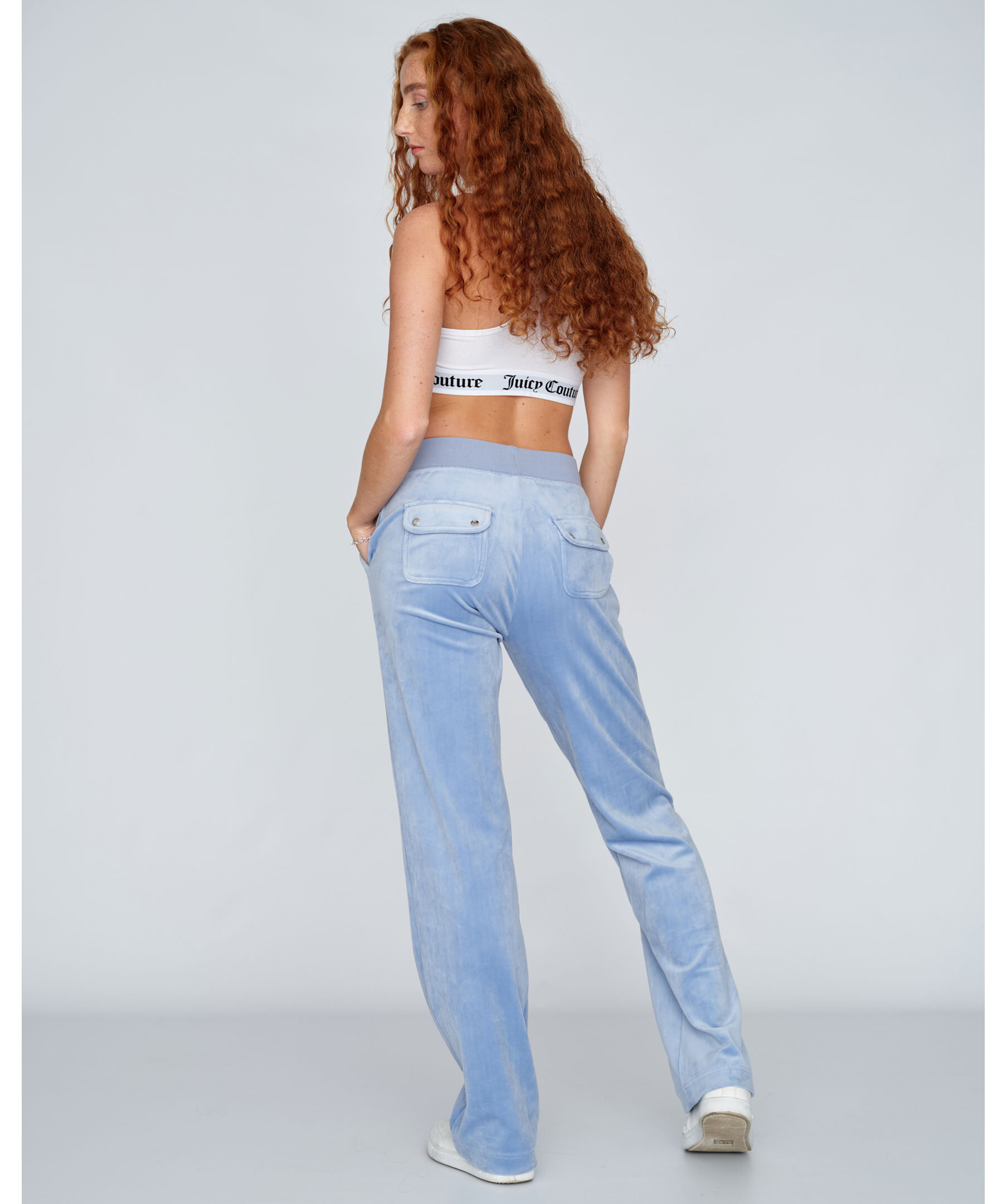 Ljusblåa byxor i velour från Juicy Couture. Bred resårkant i midjan med snörning, fickor i sidorna och bakfickor med ficklock och tryckknappar med logotyp. Rak modell broderad logga framtill på vänster ficka.